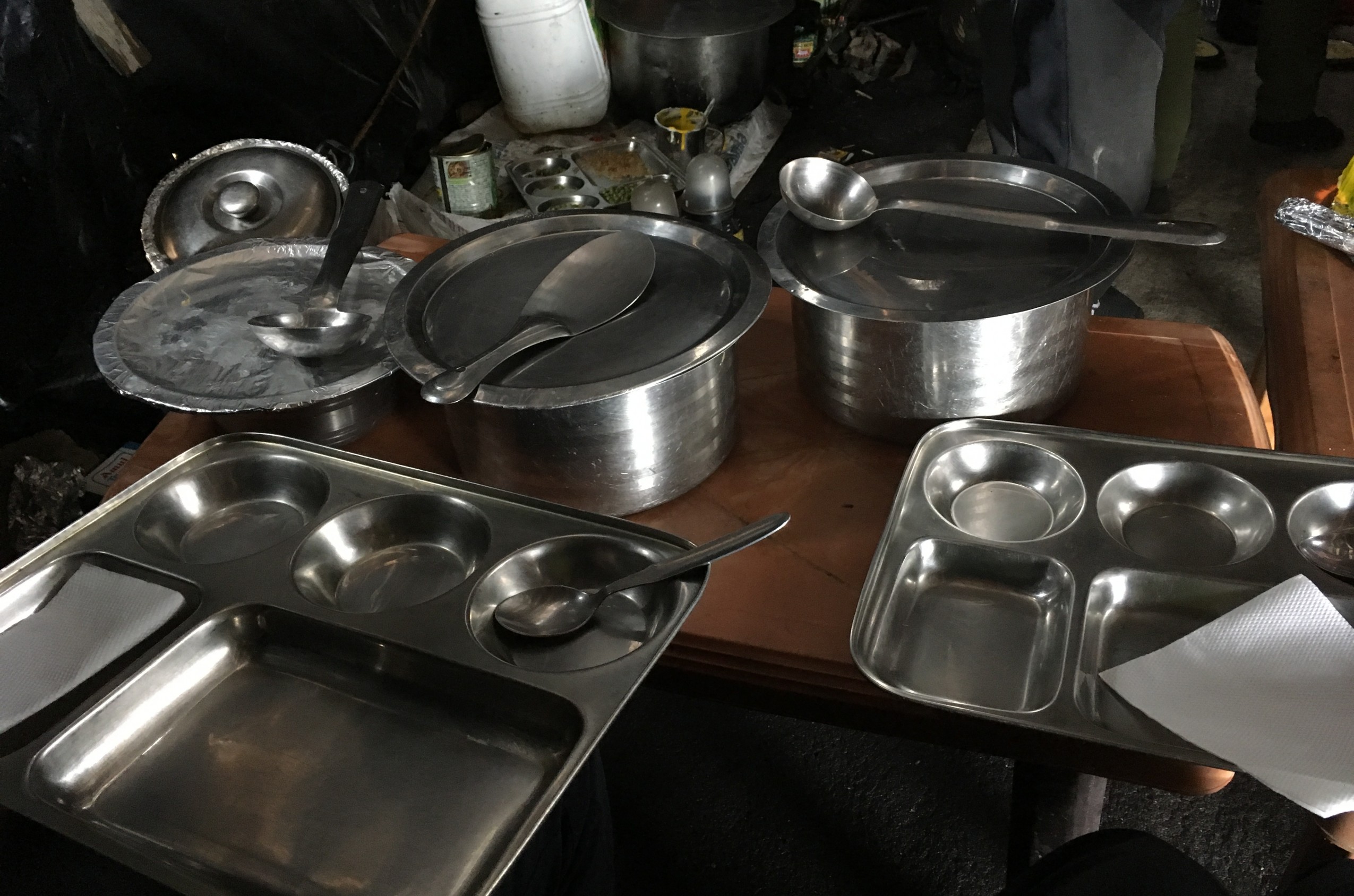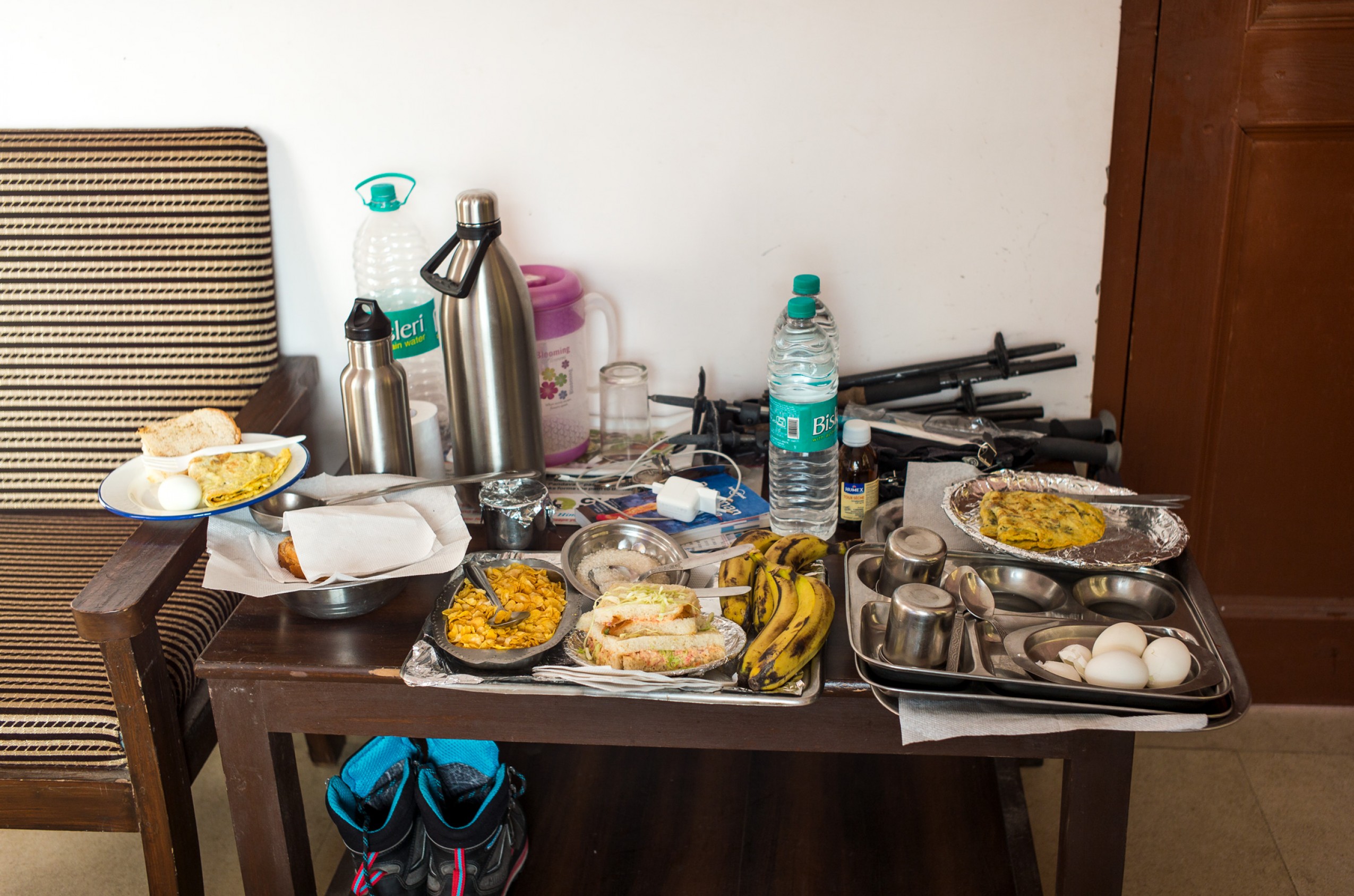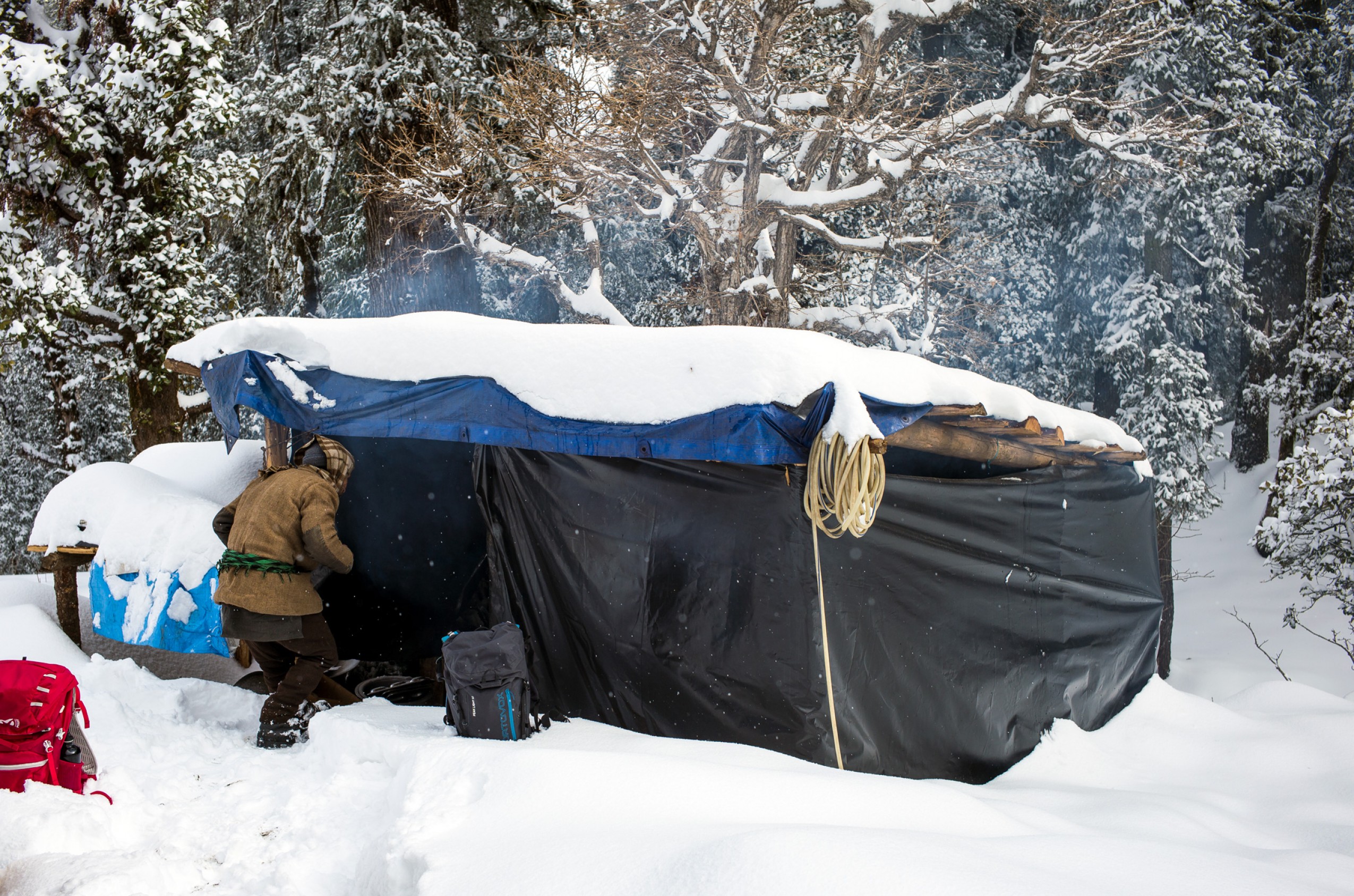À l'aube, on prend le petit déjeuner avant que Pankaj charge les mules de nos bagages. On n'a pas de gros bagages et l’on essaie de porter nous-mêmes le maximum, mais les mules ont plein d'autres choses à transporter, des bouteilles de gaz et des sacs rugueux de jute remplis des vivres pour les cuisines des camps de bases. Les bêtes sont assez adroites, même sur les sentiers plus raides, menés de derrière par les "ha!" de leurs maitres Sherpas. Après quelques heures (quatre heures ? cinq heures ? je ne pourrais pas dire) de marche et de nombreuses pauses chaï, nous arrivons à Jadu Ka Talab (2773 m), le lieu où nous allions camper pour la nuit, pour la première fois dans des tentes sur la neige. Le paysage commence à s'ouvrir et la neige couvre les alentours, les arbres. Plusieurs compagnies de guides ont implanté des clusters de tentes autour d'une tente maitresse : la cuisine. La nourriture est fantastique et nous attendons avec une impatience pavlovienne chaque repas. On ne s'imaginait pas que la nourriture faite dans ces conditions-là pourrait être si délicieuse et bonne – on n'a pas eu le moindre problème digestif pendant le trek.