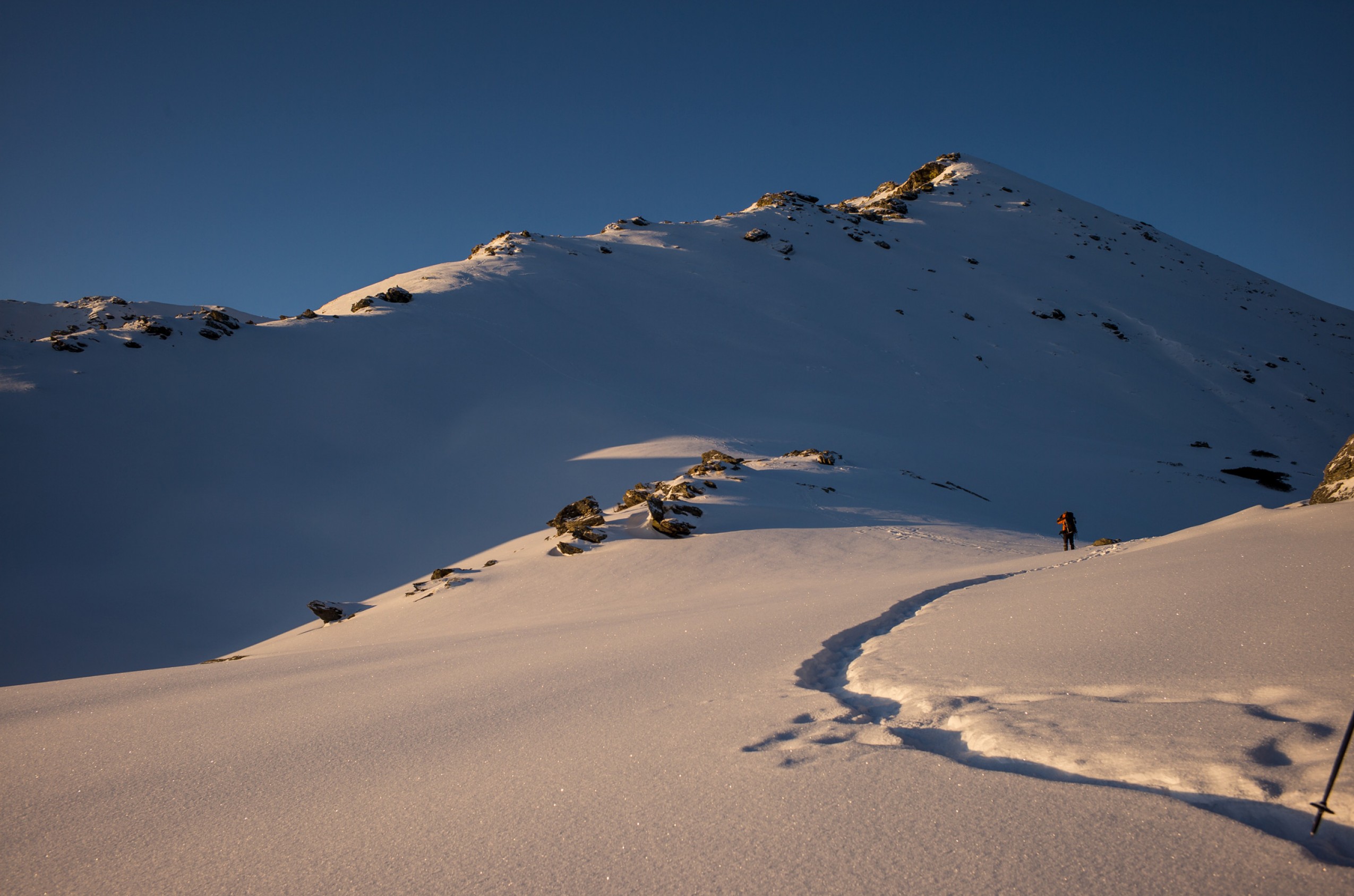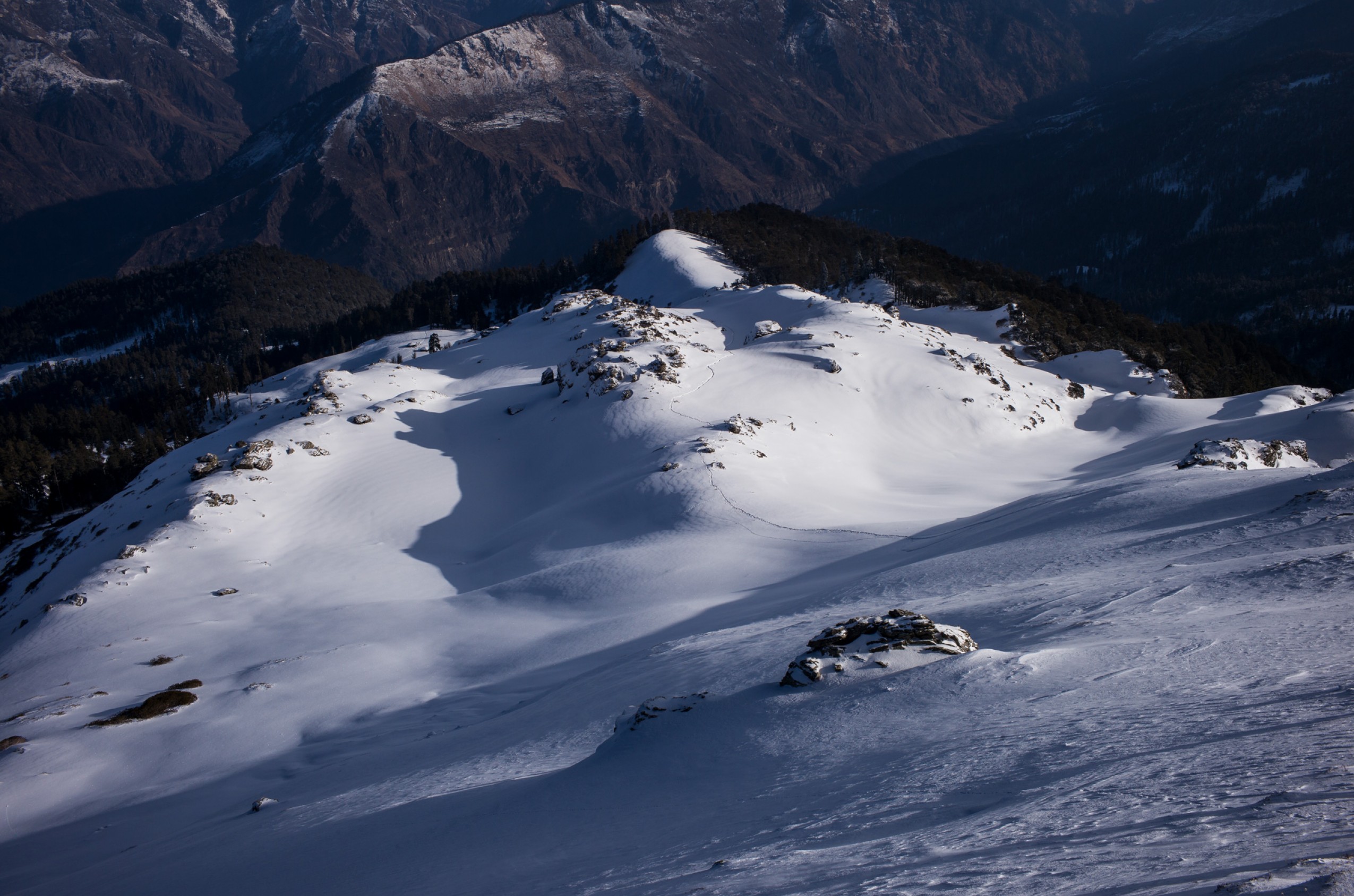Le quatrième jour, le jour de l'ascension, commence très tôt, vers 3 ou 4 heures du matin. Le sentier monte et serpente dans la neige qui scintille à la lumière de nos frontales. Il fait froid, mais c'est extrêmement agréable et le sentier n'est pas raide. Sur le chemin, on retrouve encore une "cabane chaï", mais comme nous venions à peine de nous échauffer, on demande à Pankaj de continuer sans cette pause inopinée. On se retrouve pour la première fois devant le sommet de Kedar Kantha (3810 m) : il parait tout doux et calme sous la neige, éclairé du côté gauche par les premières lueurs du jour. On s'étonne quand Pankaj nous annonce encore deux heures de marche – nous aurions estimé pas plus de trente minutes jusqu'au sommet. Pankaj a eu raison, bien sûr : malgré l'apparence douce, l'arrête de Kedar Kantha monte de façon soutenue sur des parties assez exposées, un mix de neige et rochers balayés par un vif vent venant de l'est, de là où venait la lumière de l'aube aussi. En silence, je rêve de mes crampons que, pour optimiser le poids du bagage, j'avais décidé de ne pas ramener en Inde. En tout cas, on n'aurait pas pu les prendre, parce que les vols internes Dehli-Dehradun se font avec des avions à hélice qui n’ont pas de soutes ; même si les bagages volumineux sont acceptés, ce qu’ils contiennent doit répondre aux critères de sécurité des cabines – couteaux, briquet, piolets et crampons exclus ! Les mini-spikes fournies par la compagnie des guides ont leurs limites sur les pentes de neige croustillante. Mieux que rien.