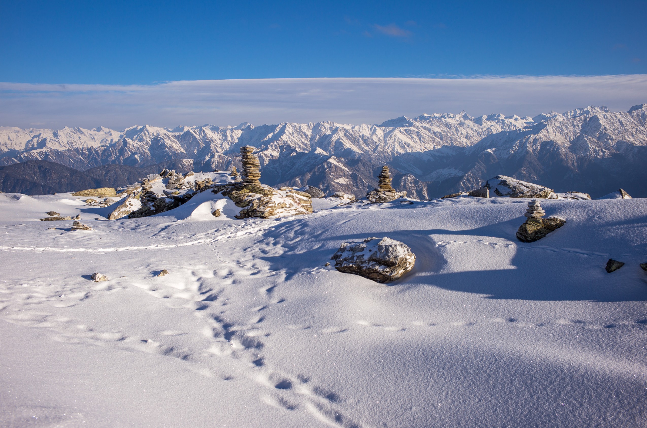 C'est beau au sommet. Bien qu'à moins de 4000 m, le froid et le vent hivernal subliment le Kedar Kantha, le rendent majestueux et digne de ses voisins plus hauts. Nombreux cairns couverts de neige et de givre marquent le sommet.