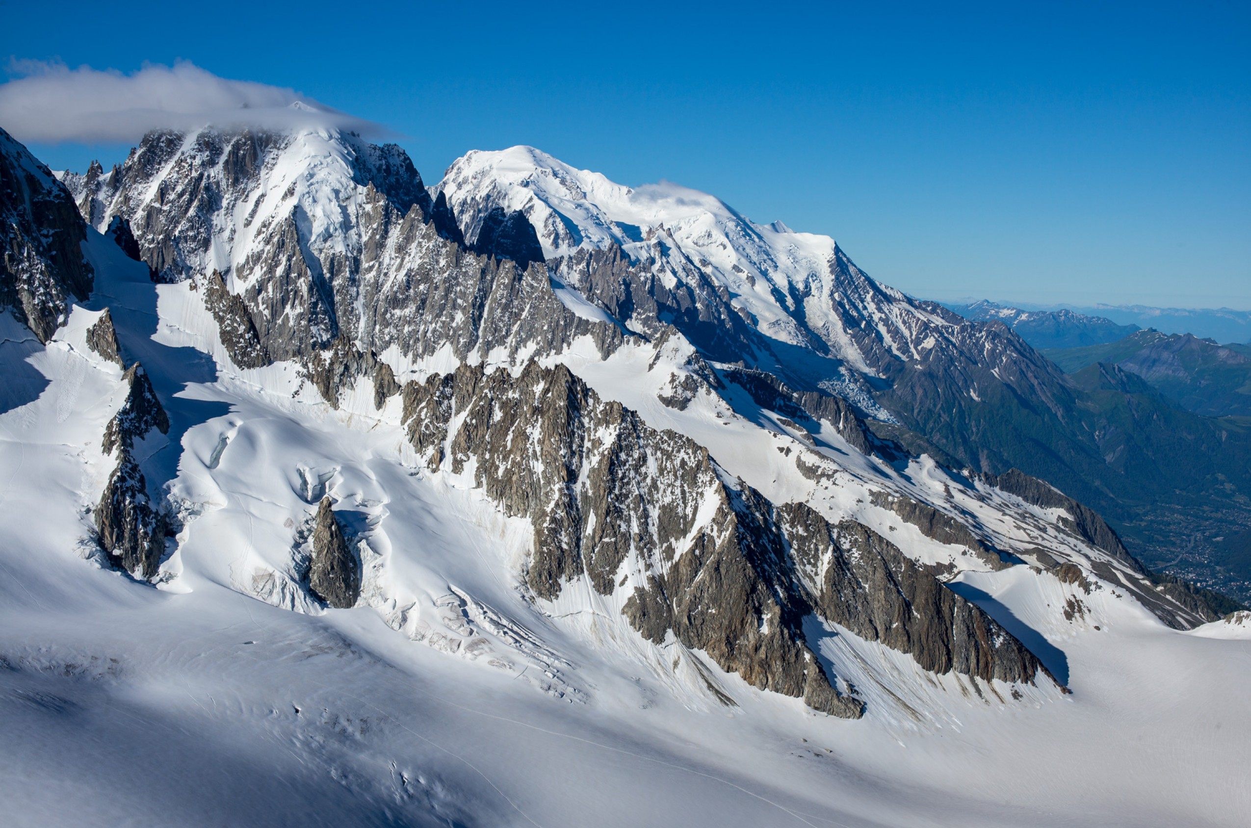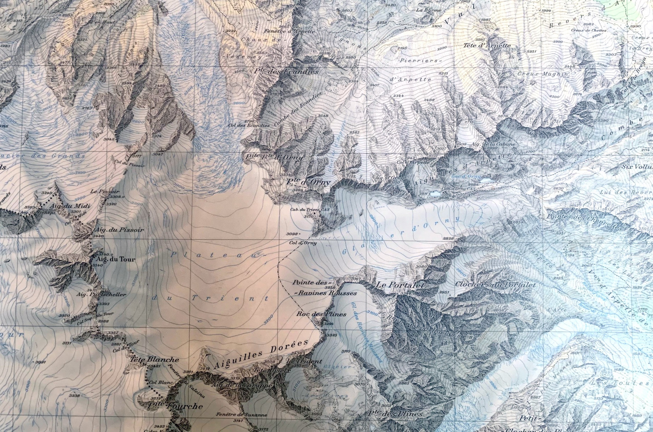 5h. Début de l’ascension depuis le refuge d’Orny. Contrairement aux autres cordées, qui sont toutes descendues tout de suite sur le glacier en sortant du refuge, nous suivîmes la courbe de niveau longeant le versant sud des Aiguilles Tourelle autour de 2900m, pour éviter une descente inutile. Nous enfilâmes les crampons un peu en dessous de la cabane du Trient pour commencer l’ascension du Glacier d’Orny et ensuite la traversée du Plateau du Trient à travers le Col d’Orny (3083m). Rond comme le cadran d’une montre, le Plateau de Trient est un spectaculaire cirque glaciaire encerclé d’aiguilles : les Aiguilles Dorées à 5h, l’Aiguille de la Varappe (3517m) à 6h, l’Aiguille Purtscheller (3474m) à 8h, les Aiguilles du Tour avec les deux pointes de 3541m et 3540m à 9h, les Aiguilles du Pissoir (3439m) et les Aiguilles du Midi (3300m) qui ne sont pas du tout à midi, mais à 10h. Après cette longue traversée montante, l’ascension finale se fit sur les éboulis grossiers et assez vertigineux de la pointe sud des Aiguilles du Tour (3540m). D’en haut, la carte des Alpes se déplie à échelle réelle et en relief devant nous : le massif du Mont Blanc au sud-ouest et le Mont Rose à l’est. Un peu plus loin, on devine même les Alpes Bernoises, avec le profil abrupt de l’Eiger.