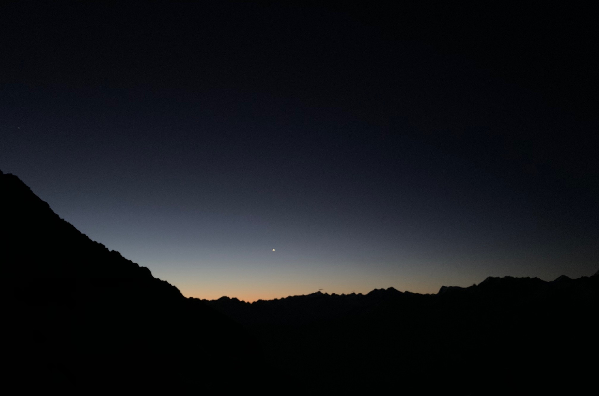 Là haut, on jauge le temps par des moyens autres que les minutes ou les heures. La première unité de mesure c’est le pas. Un, deux, trois, trois cent quatre, les pas s’enchaînent au rythme des bâtons qui frappent les rochers avec le cliquetis de la trotteuse d’une montre. Après quelques essais diligents, on perd le fil et le compteur repart de zéro jusqu’au moment où on rentre dans une sorte de geste machinal où on ne compte plus du tout. Parfois, c’est le pouls qui donne la cadence, amplifié par l’inclinaison de la pente. Quand le cœur se met à ronronner tranquillement, on sait qu’il fait au moins une demi-heure de marche et que l’on est bien échauffés. Une autre mesure c’est la température de couleur : d’abord du noir moucheté et jauni par les faisceaux des frontales ; c’est le moment où l’on se pose pas de questions, on ne pense à rien d’autre que le prochain pas ; ensuite l’heure bleue et l’heure dorée, c’est le signe de deux bonnes heures de marche. Pendant l’ascension, le temps ne se divise pas en secondes ni minutes, mais en battements de cœur, souffles et halètements, degrés Celsius et kelvins, pauses eau et le niveau du thé dans la gourde, cordées doublées, crissements de crampons, crevasses franchies, dénivelé positif et négatif. Avec l’expérience, on apprend à lire ces signes du temps.