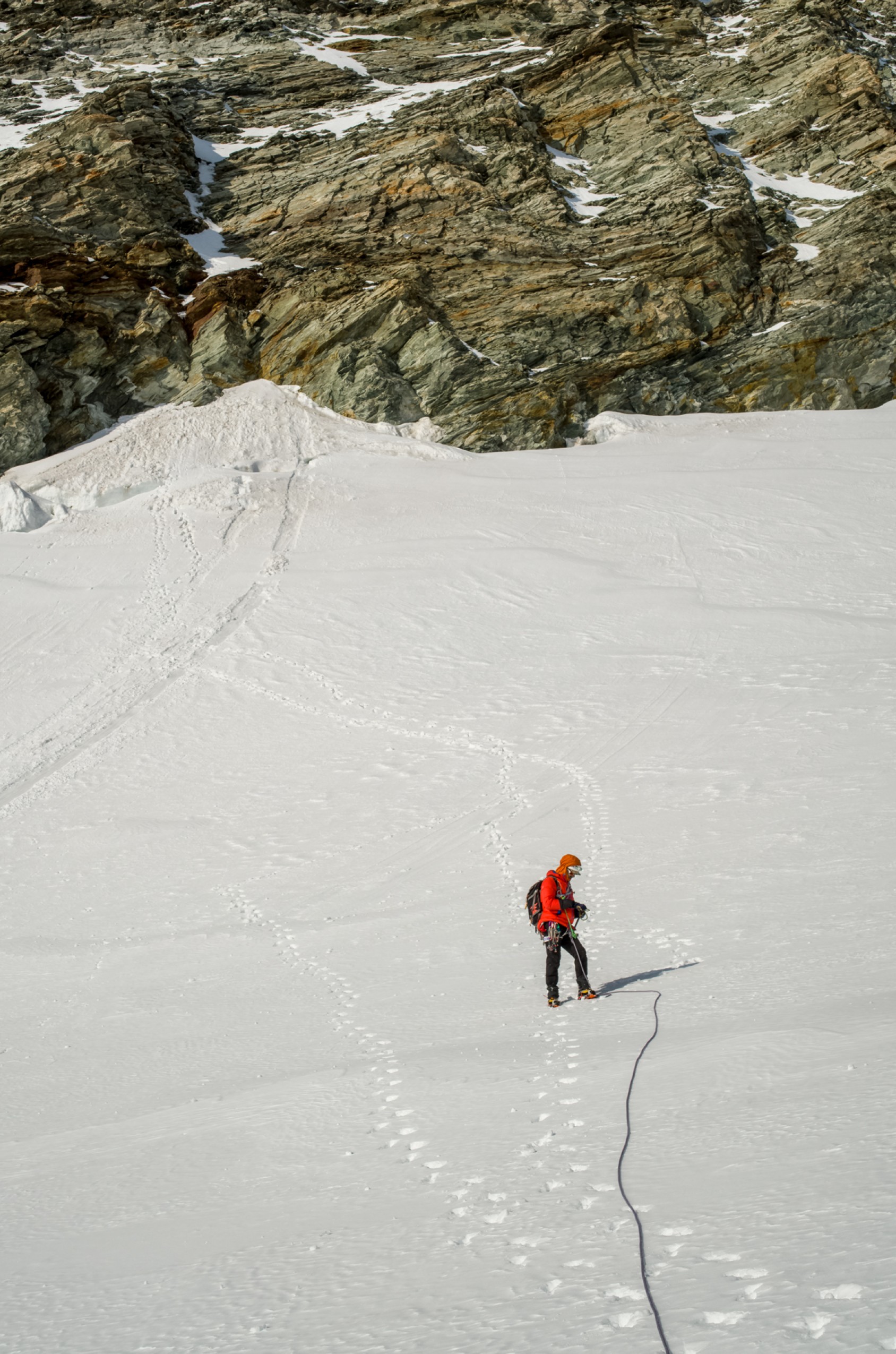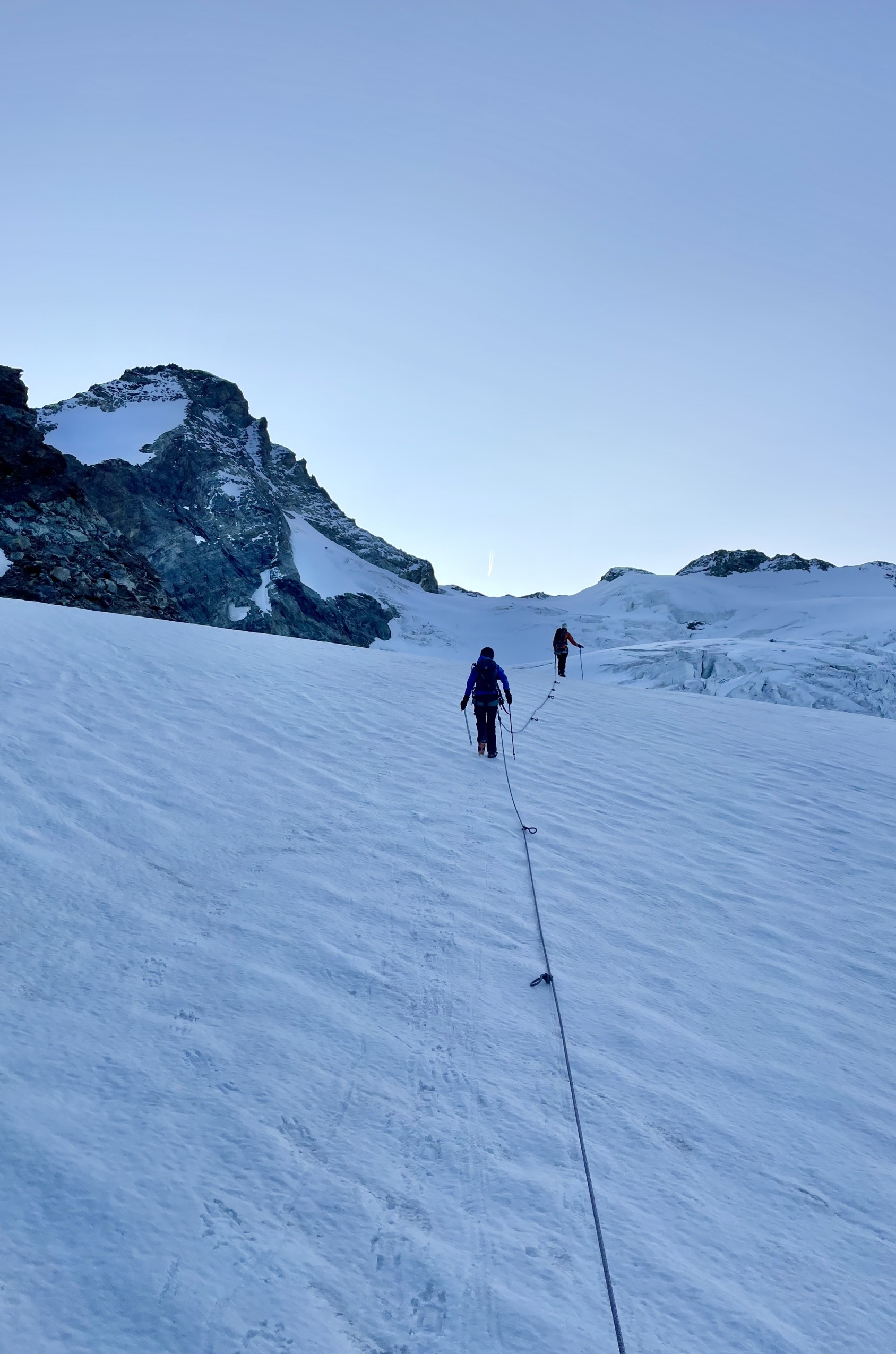 7h20. Le glacier des Grandes Murailles ressemble à un immense amphithéâtre structuré en trois gradins. Au pied du col de Tiefenmatten, nous sommes sur le premier, autour de l’isohypse 3 300 m. L’autre cordée, partie quarante minutes avant nous, vient d’atteindre le col. On se salue en agitant les bras comme des hélices, puis nous reprenons notre chemin sur le glacier, eux le leur sur la crête.