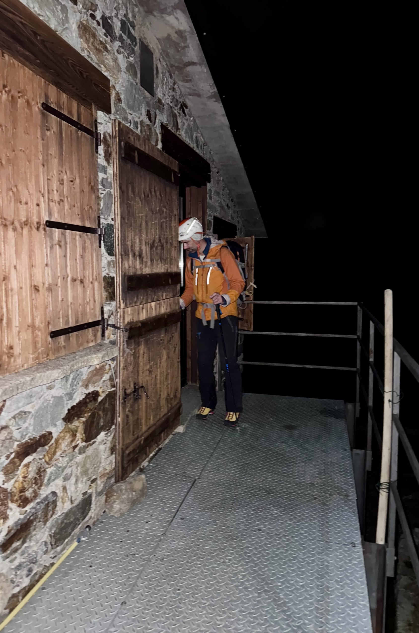 20h50. Deux guides de Valpelline aperçoivent nos frontales sur la moraine et viennent à notre rencontre. Ils prennent nos sacs, la corde ; ils nous aident à gravir les derniers quarante mètres de D+ jusqu’au refuge. Leur geste, simple et humain, me touche. Diego, le gardien — revenu aujourd’hui pour les derniers détails de la fermeture hivernale — nous sert une énorme assiette de pâtes, puis une viande marinée et une purée. Aucune purée n’aura jamais été aussi bonne ! La nuit est agitée ; le sommeil m’échappe. En pleine nuit, je sors prendre de l’air. Les pieds plantés dans la pelouse d’edelweiss, la tête plongée dans la Voie lactée, je respire la lumière pâle de la lune gibbeuse et cela m’apaise. Le sommeil finit par venir.