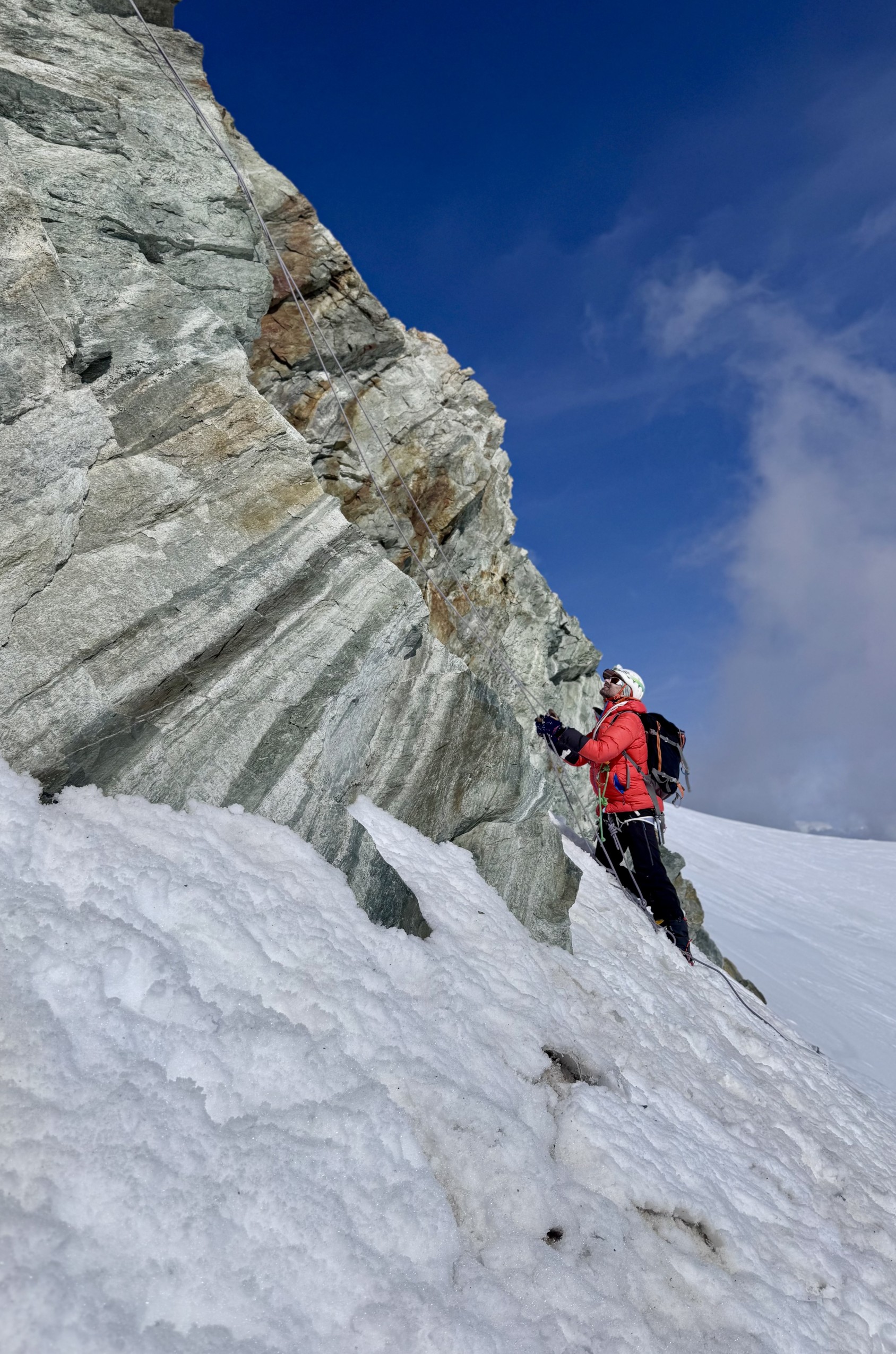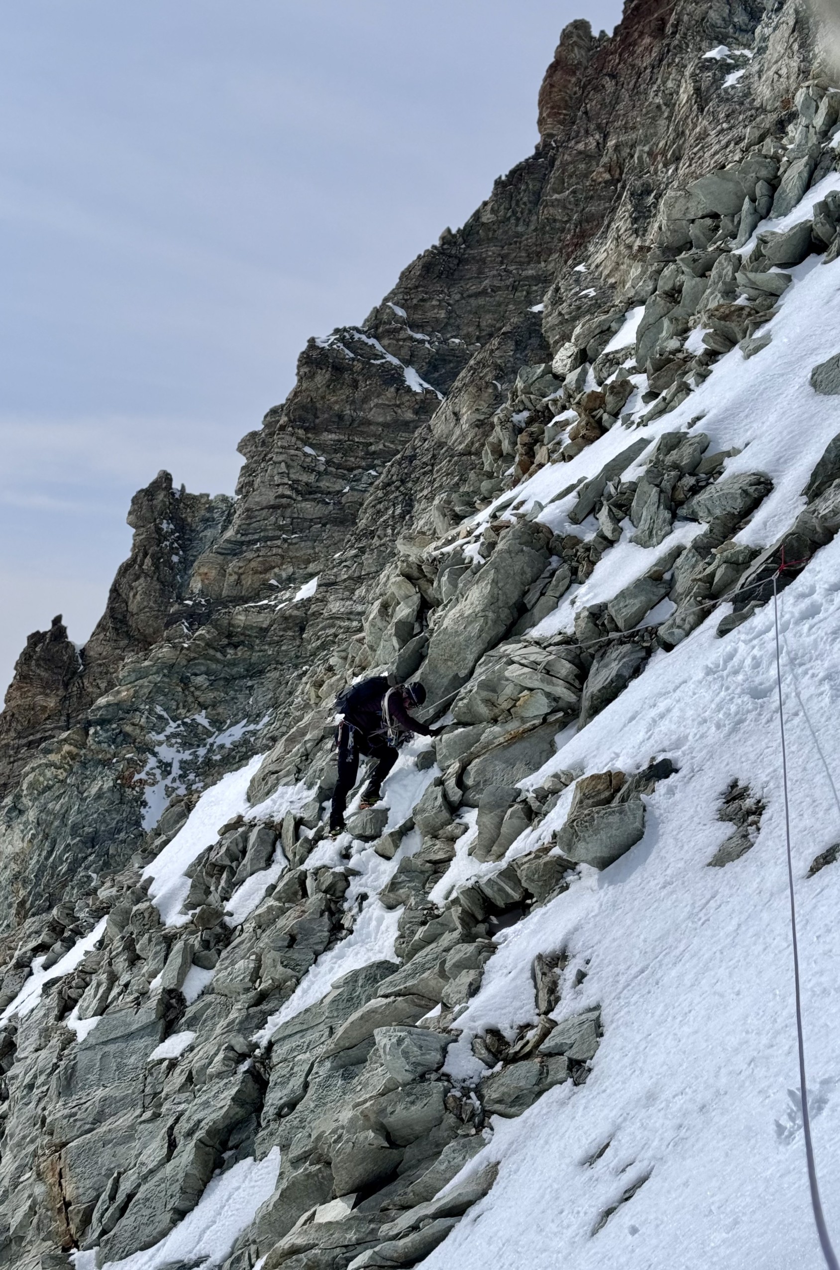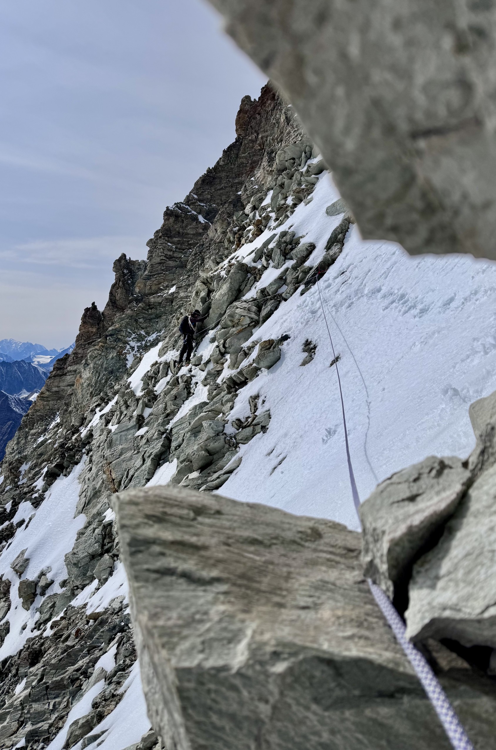 11h39. Nous sommes au sommet du gendarme crochu de l’arête est (4 075 m). Devant nous, à l’ouest, la Corne d’Hérens (4 148 m) s’élance contre le ciel, strate après strate. Ce n’est pas une corne, mais une carnassière de gneiss prête à déchirer quiconque s’y hasarde. Au nord, la Dent Blanche. À l’est, l’arête du Lion du Cervin, noyée dans le brouillard. Je sors de ma rêverie minérale. Nos regards sondent des voies possibles — et impossibles. Mais Julien n’est pas bien, il est au bout. À seulement 98 m du sommet, un seul choix s’impose : battre en retraite. « On est clairement trop lents, on redescend. »