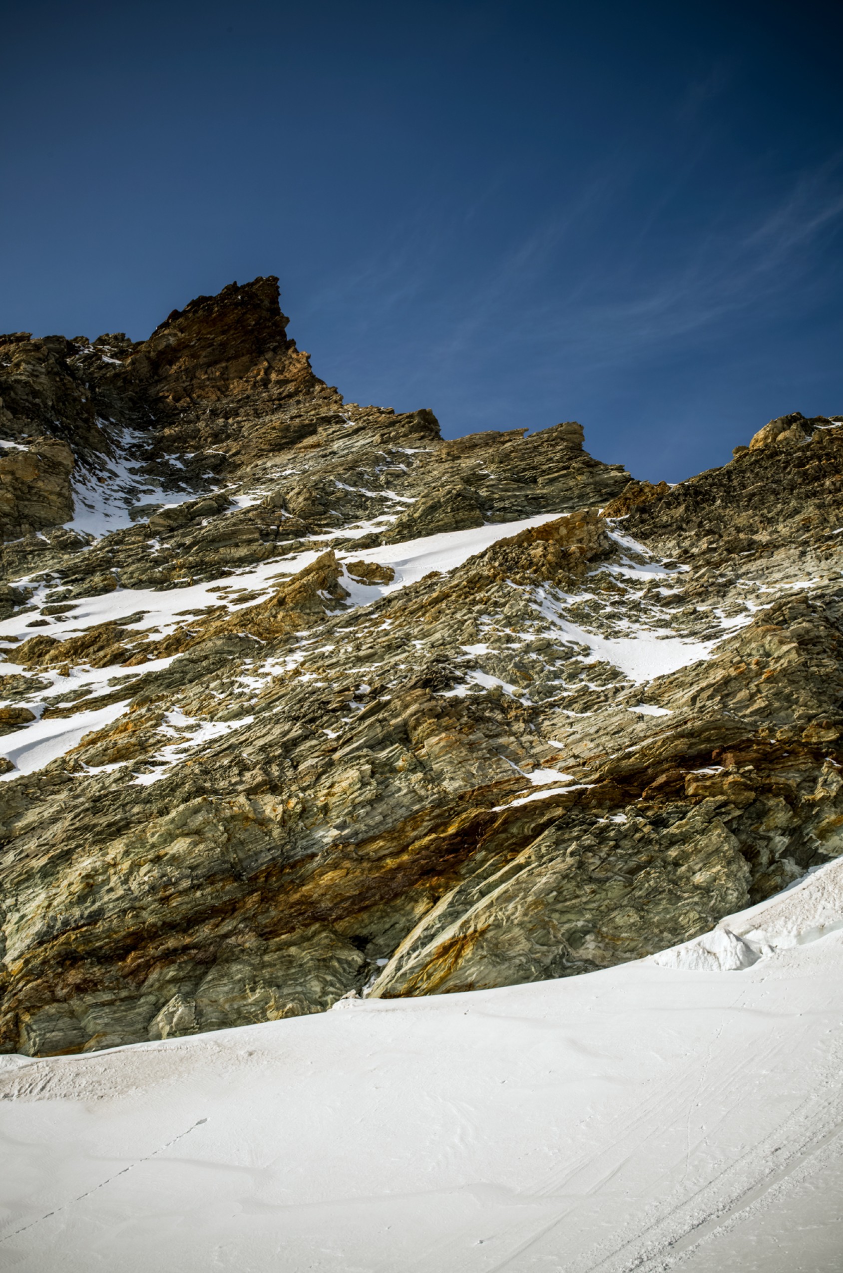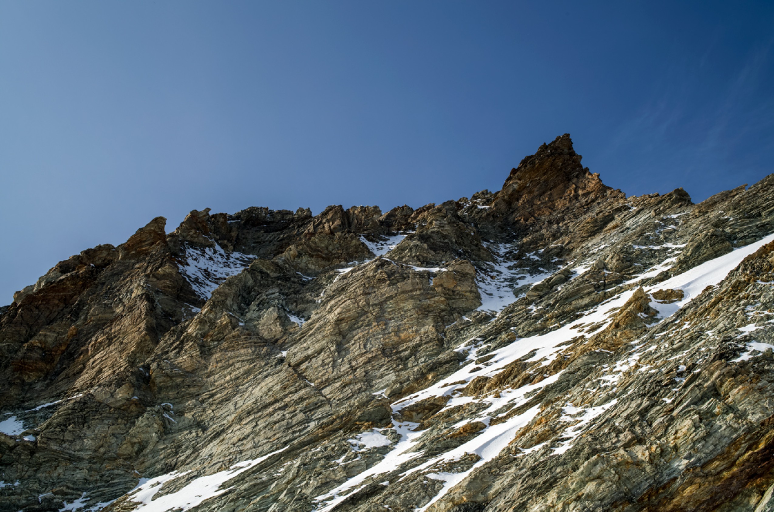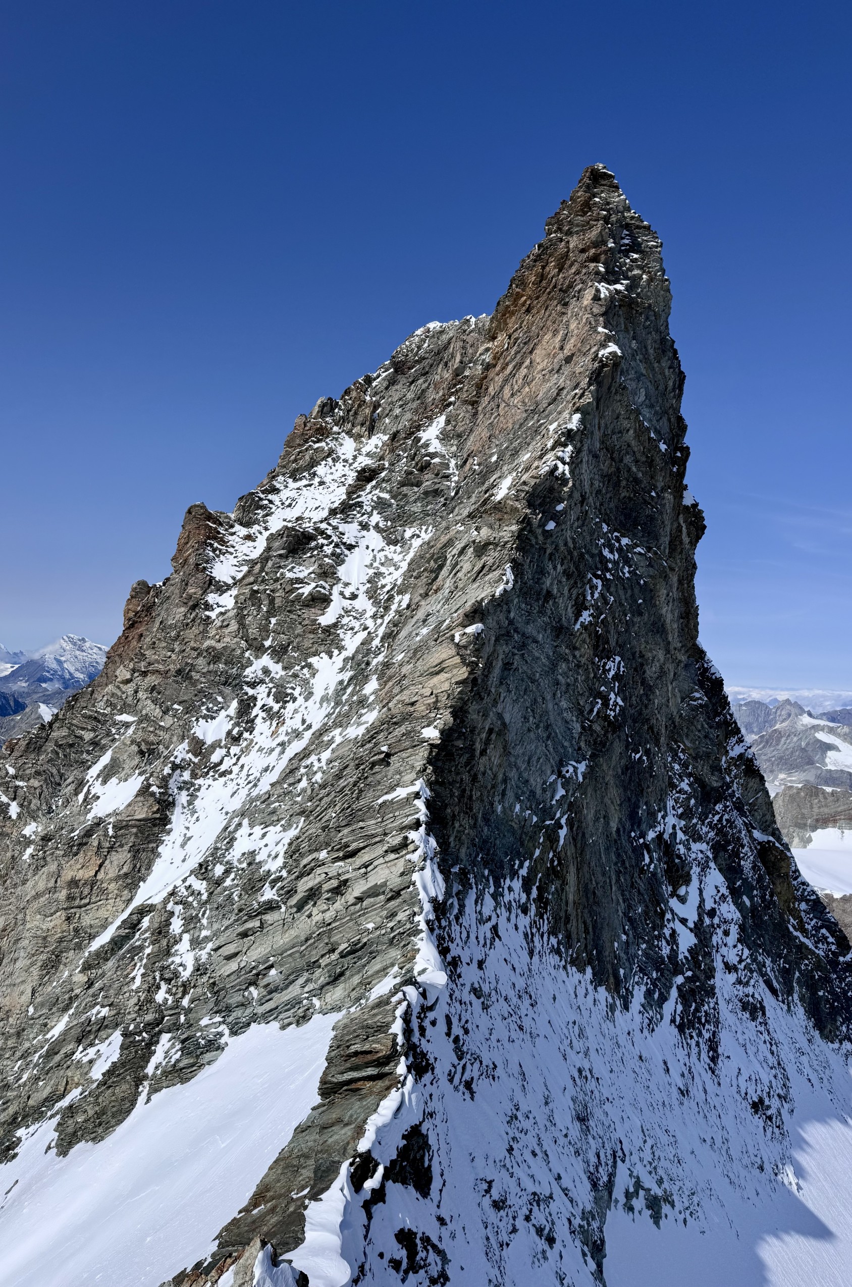 11h39. Nous sommes au sommet du gendarme crochu de l’arête est (4 075 m). Devant nous, à l’ouest, la Corne d’Hérens (4 148 m) s’élance contre le ciel, strate après strate. Ce n’est pas une corne, mais une carnassière de gneiss prête à déchirer quiconque s’y hasarde. Au nord, la Dent Blanche. À l’est, l’arête du Lion du Cervin, noyée dans le brouillard. Je sors de ma rêverie minérale. Nos regards sondent des voies possibles — et impossibles. Mais Julien n’est pas bien, il est au bout. À seulement 98 m du sommet, un seul choix s’impose : battre en retraite. « On est clairement trop lents, on redescend. »