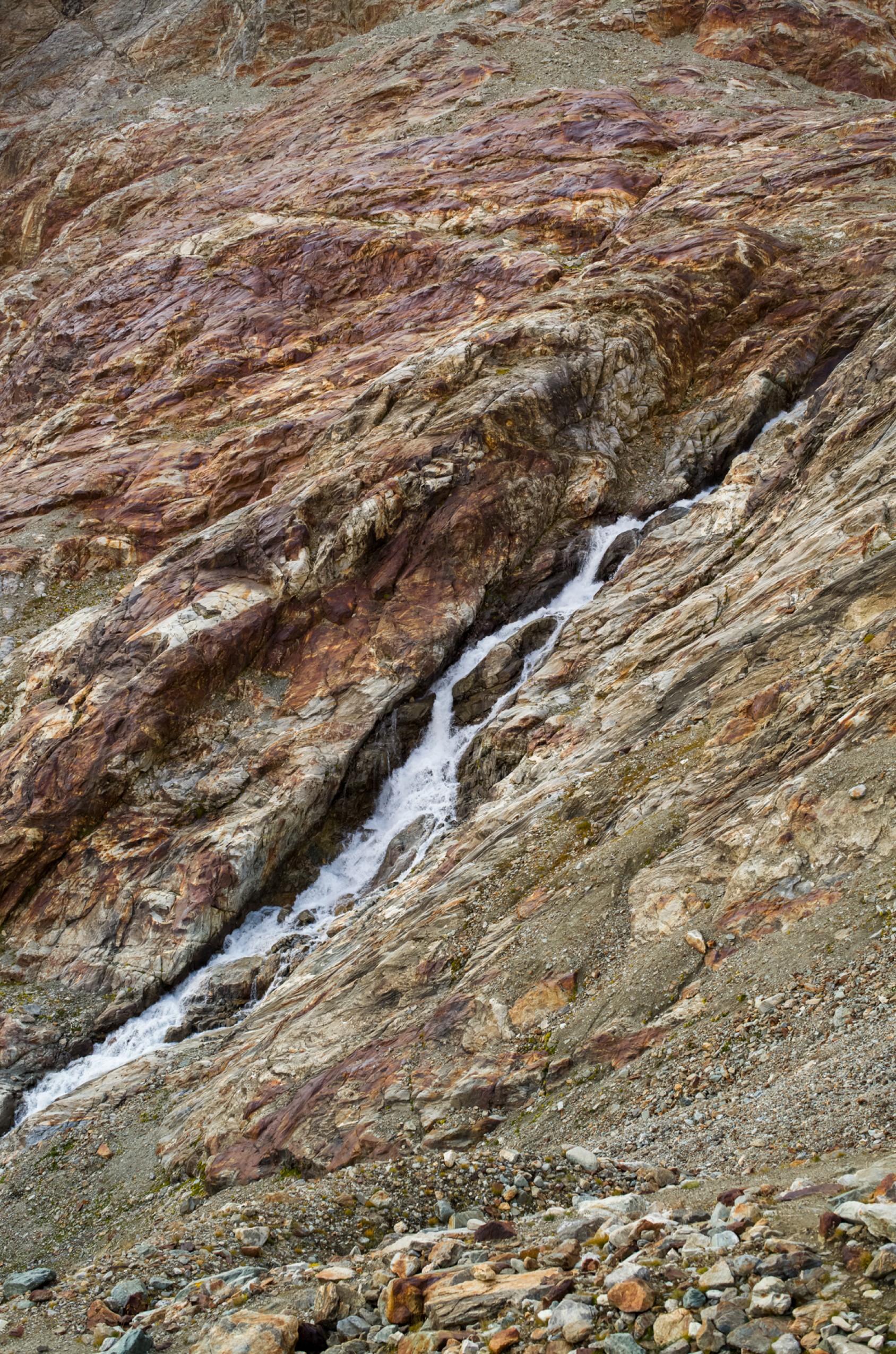 Je parcours cette section dans une sorte de transe géologique. Rien ne reste de l’effort, seulement la mémoire du rocher que je touche : couleurs, textures, grain, température. C’est surtout de l’orthogneiss issu de la transformation de roches magmatiques originelles, et du paragneiss, dérivé d’anciens sédiments métamorphisés. Des veines de quartz, feldspath et mica s’entrelacent comme un filigrane dans la structure de la roche. La paroi n’est pas massive : un millefeuille de lames incisives, traversées de diaclases perpendiculaires à la pente. Une architecture fragile, prête à se déliter. Chaque prise doit être vérifiée, tâtée, tapotée avant d’y poser friends ou sangles. J’avance sans autre souvenir, absorbée par ce toucher abrasif.