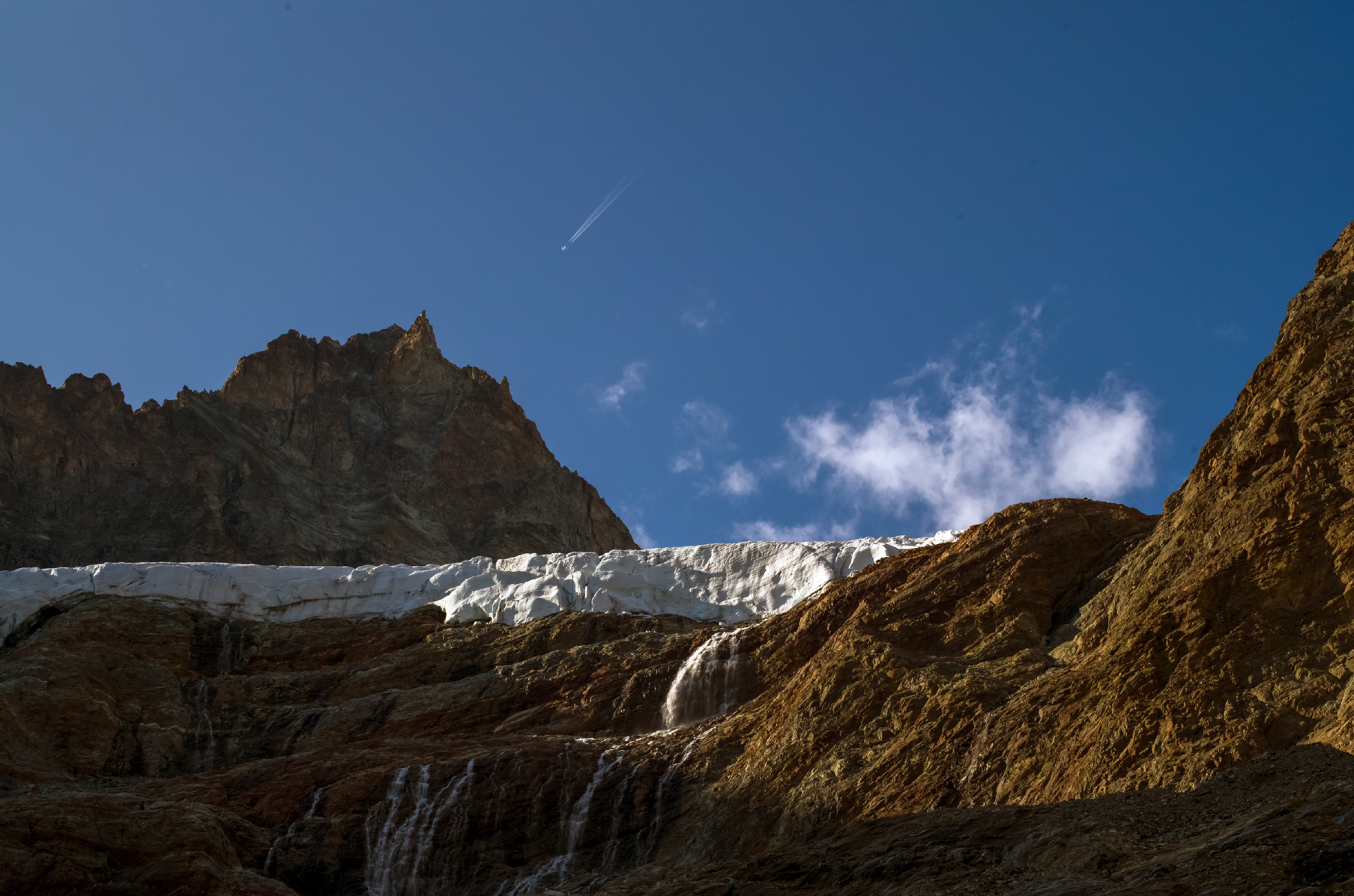 Pour atteindre la voie normale, il faut monter un gradin de plus, jusqu’à 3 700 m. Nous continuons donc vers l’est, le long de deux grandes crevasses béantes qui barrent la base de la face sud-ouest. Aucun pont de neige pour accéder aux dales rocheuses. La seule option – faisable, mais extrêmement exposée –, serait tout à droite, sur la commissure de la crevasse, où une pente raide de neige rejoint le rocher au-dessus du vide. Vue d’ici, cette voie n’a rien de « normal » ; en tout cas, pas à ce moment tardif de la saison.