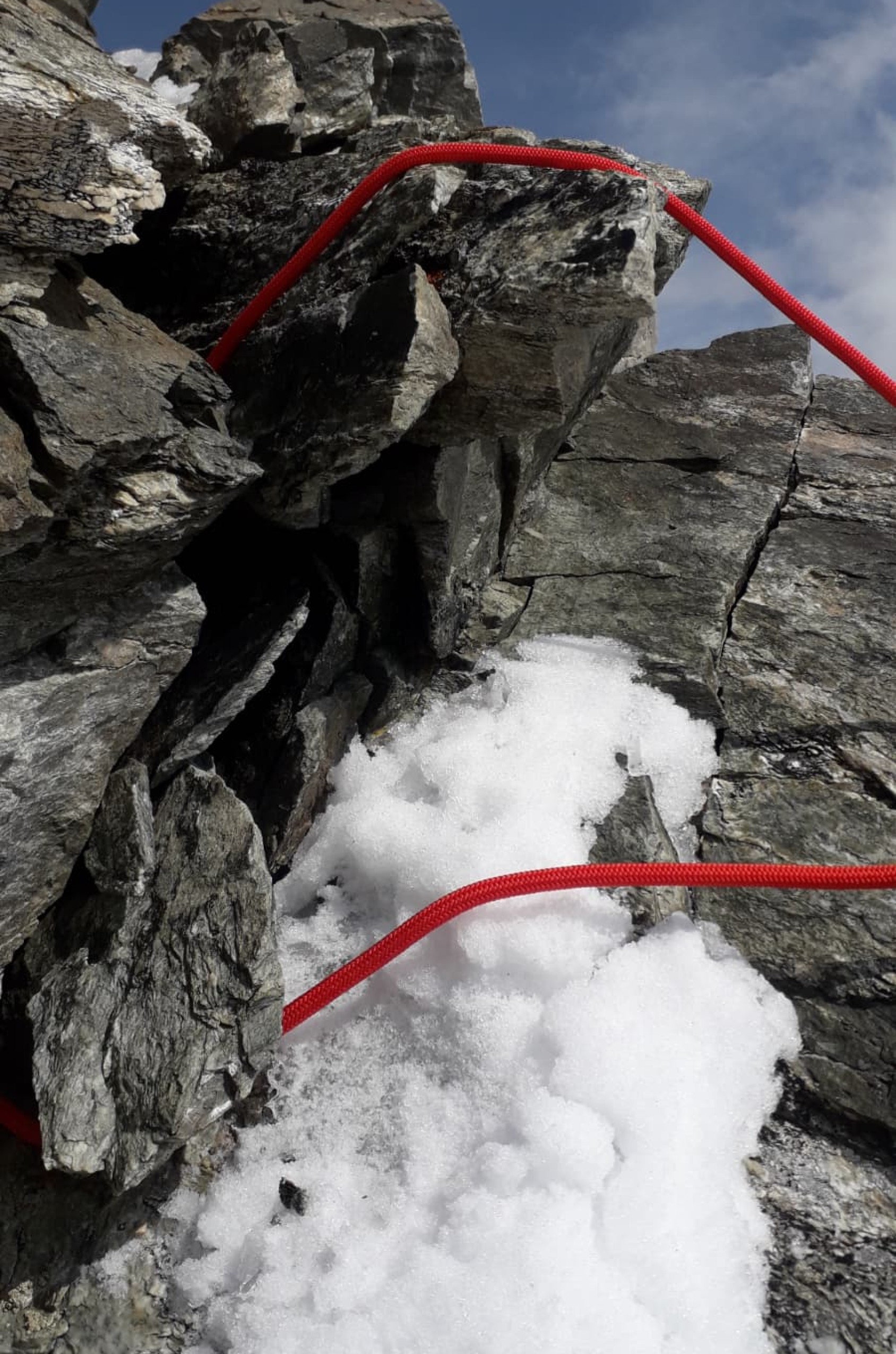 Depuis le gendarme est, on commence la traversée descendante d’une pente de neige à 60–70°, jusqu’à un ressaut rocheux qui trône au milieu. C’est mon tour. Lancelot m’assure d’en haut, Julien m’attend déjà sur le ressaut. J’avance avec diligence face à la pente, dans une neige qui a la consistance des aigrettes de pissenlit. Au début, elle tient ; puis, d’un coup, je ne sens plus rien sous mes pieds. Je glisse — je gliiiiiiisse ! Le piolet ne mord plus. Je culbute entre les brins de corde, qui arrêtent ma glissade une dizaine de mètres plus bas. Mon kit crevasse — broche à glace, deux poulies autobloquantes, descendeur — s’arrache de mon baudrier et file dans le vide. Une seconde glissade, plus courte, achève de me déstabiliser. Je hyperventile ; mon corps se met à trembler. « Tu vas bien ? ». Non. Non, pas vraiment. Réunis sur le ressaut, on regarde le glacier tout en bas, très loin. Comment redescendre ? Pour l’instant, je suis défaite, prête à capituler, à appeler les secours coûte que coûte. Mais Lancelot, d’un calme glacial, trace une stratégie de descente. Il demande l’heure. Il dit que c’est faisable. Une part de moi le croit, l’autre reste incrédule.