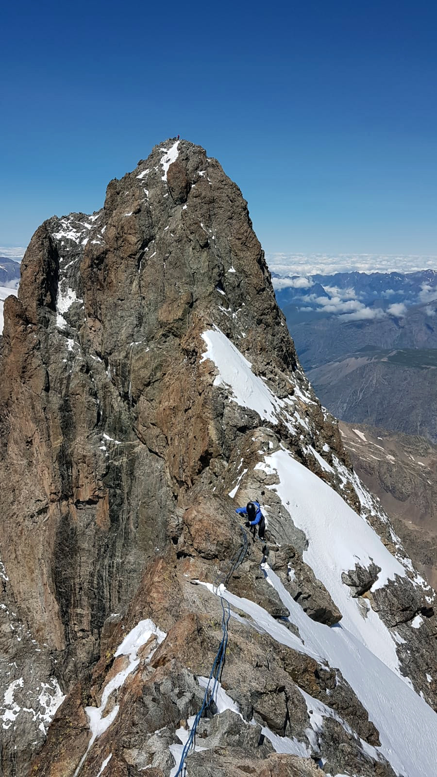Eau, nourriture et selfies, la routine du sommet. Joie modérée, car je vois mieux ce que Mathieu veut dire par « au sommet, c’est loin d’être fini ». Trois rappels sont nécessaires pour descendre du Grand Pic sur la Brèche Zsigmondy. Lentement, très lentement, je me laisse glisser sur ce brin de corde qui me livre au vide. En plein jour, le vide est omnipotent. Si seulement il pouvait faire encore nuit, juste le temps des rappels !