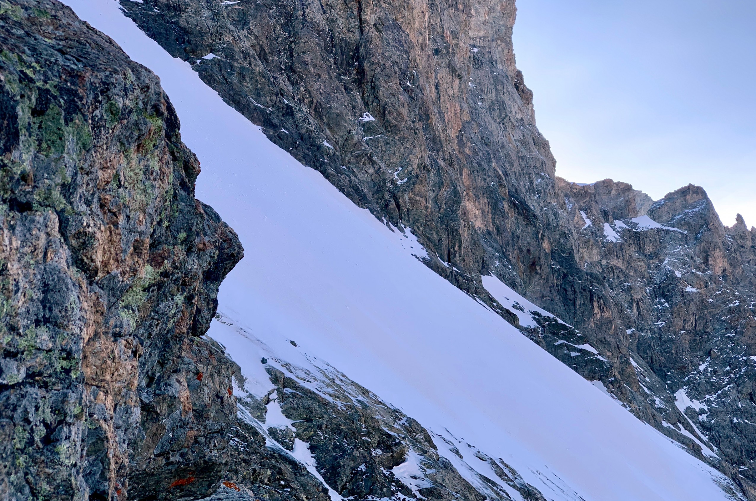 Au départ de la gare intermédiaire du téléphérique de la Grave (2400 m), l’approche commence par l’éperon gauche des Enfetchores, un talus de granite gris, amorphe, oublié par le temps et les glaciations. En patois, s’enfetcher ça veut dire se perdre, m’explique Mathieu, mais il connaît ce dédale par cœur et il trouve rapidement l’issue sur le Glacier de la Meije. Pour rejoindre la Brèche de la Meije (3357 m), nous traversons le glacier en contournant la rimaye sur le versant gauche. Ici, un émietté géologique de gneiss remplace le granite basal offrant à nos semelles un défi inattendu. Entre la Meije et le Râteau, la brèche nous ouvre la porte vers le monde incroyable du bassin versant du Vénéon et du Glacier des Etançons, avec une vue plongeante sur le refuge du Promontoire (3092 m). Après une descente assez escarpée, les traces dans la neige ramollie nous mènent aussitôt au refuge. 14h30. Première mission accomplie. Mathieu sourit, rassuré. Je souris aussi et commande le jus de pomme que j’avais en tête depuis la rimaye. Les rimayes donnent soif.