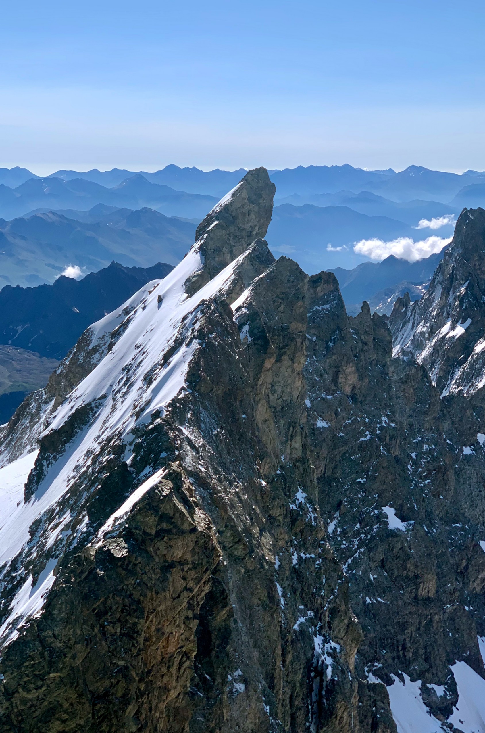 Mathieu me descend en moulinette dans une autre brèche, celle qui précède le Doigt de Dieu. Appelé aussi le Pic Central de la Meije, ce sommet sera les derniers mètres de dénivelé positif de notre traversée — je pourrais presque m’en passer, mais il n’y a pas de voie alternative. Ici, à 3973 m, nouveau dilemme mystique : pourquoi l’appelle-t-on Doigt de Dieu, mise à part sa forme de relique surhumaine ? Son orientation de bas en haut et non de haut en bas est une vraie énigme. Cela veut dire que soit (1) il n’appartient pas à Dieu, céleste par nature, soit (2) Dieu même siège dans cette montagne, de façon animiste. Après 8h d’effort et un certain manque d’oxygène, je conclus que ce doigt doit appartenir à une déesse chthonienne, maîtresse du granite et du gneiss, en colère contre le cosmos pour ses foudres et inconstances. Appelons le « le Doigt de la Déesse », ça me paraît plus plausible.