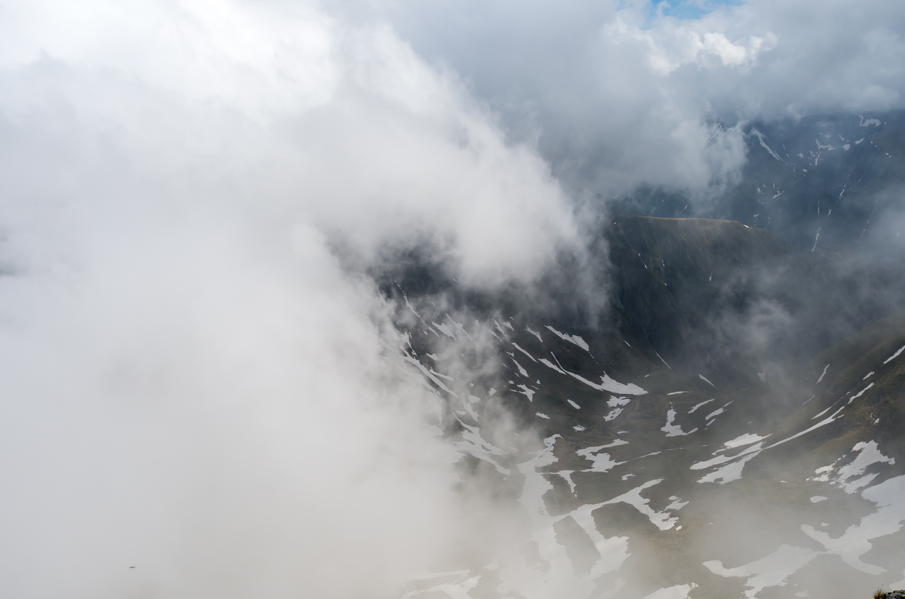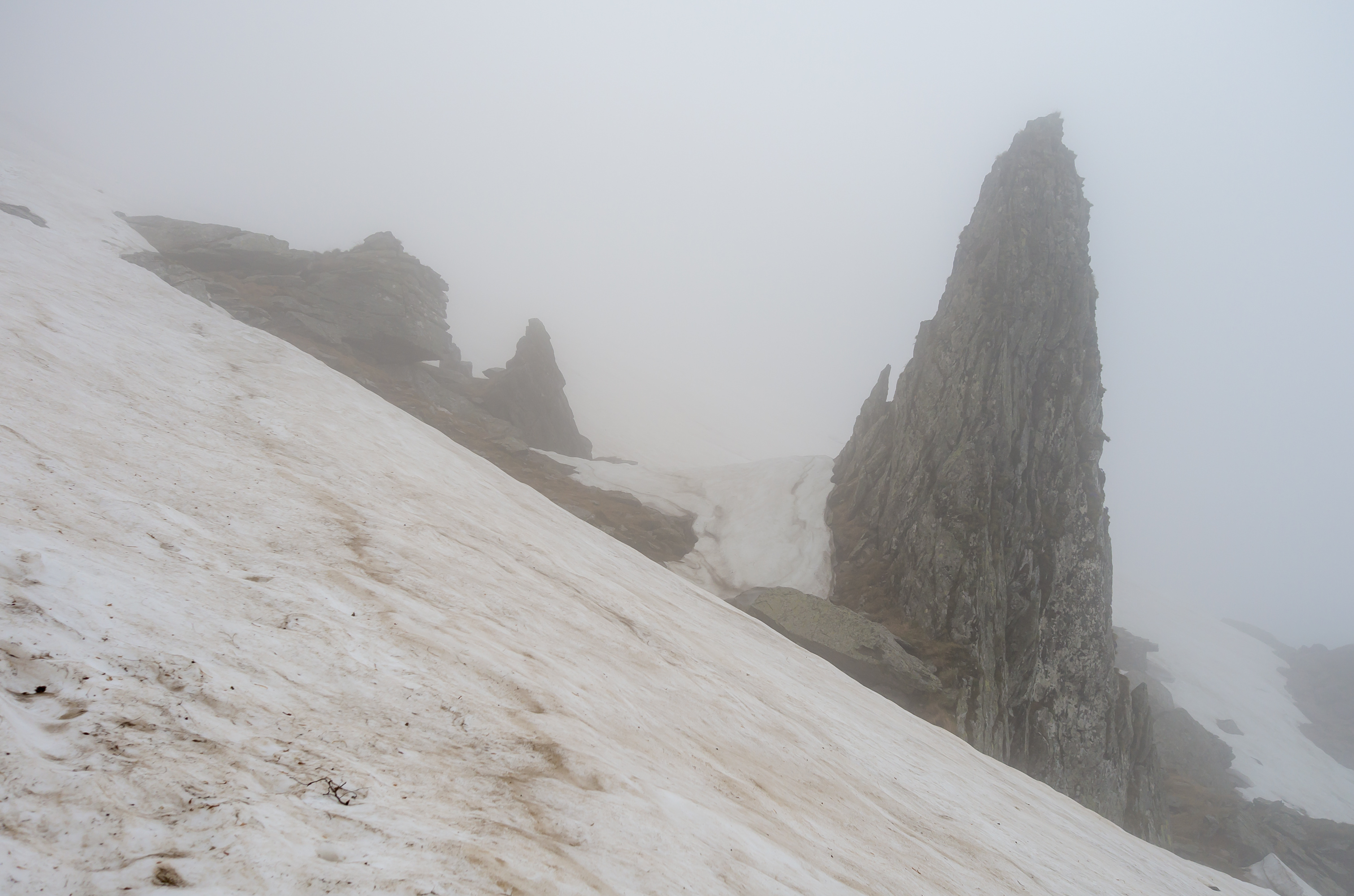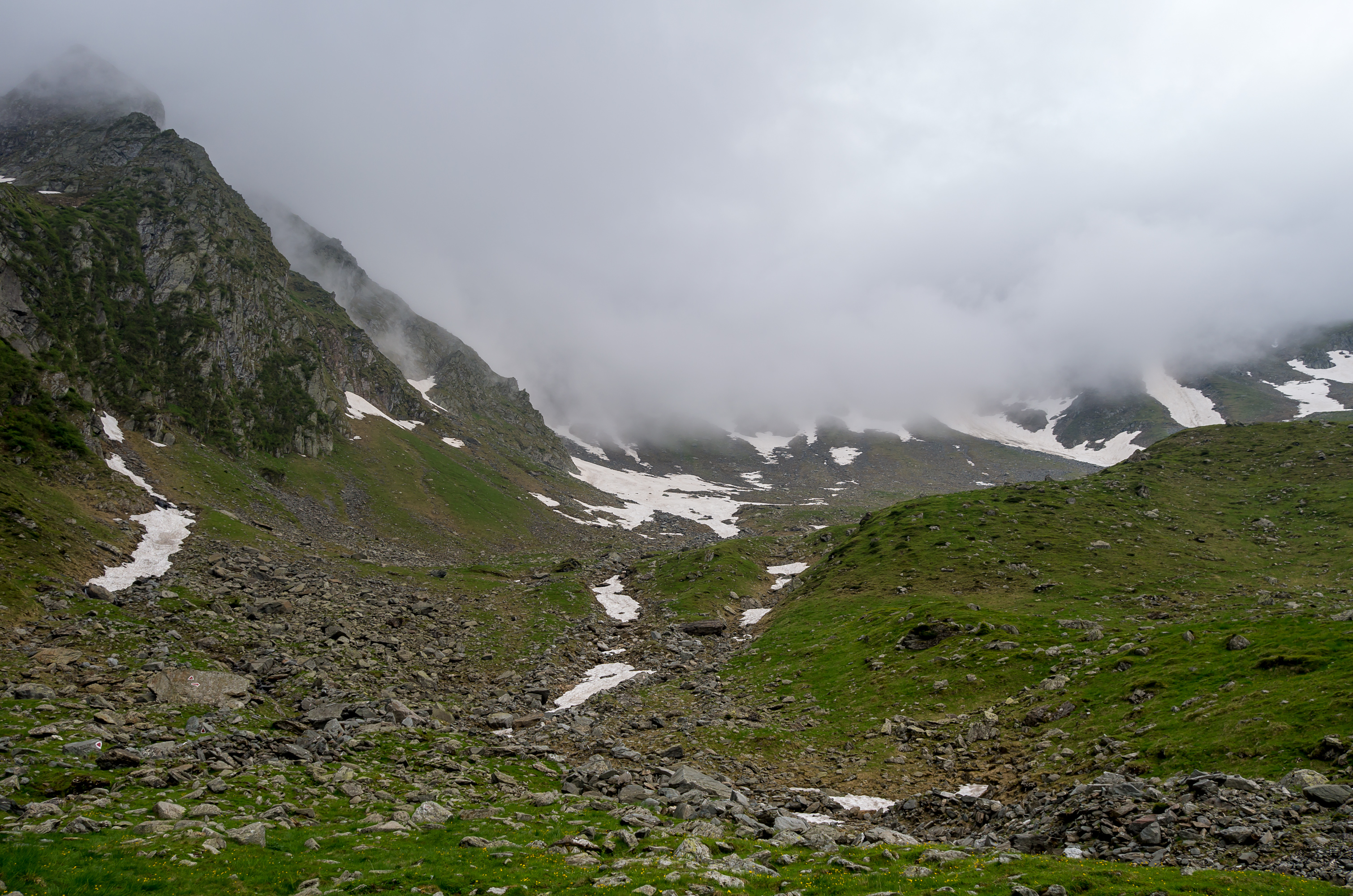 Si le sentier jusqu'au refuge, malgré ses pentes et ses jungles de bardane, nous a paru plutôt une promenade dans un parc, la partie la plus intéressante (pour ne pas dire "inquiétante") commence ici. En partant du refuge d'Izvorul Viștei, le paysage forestier laisse lentement place aux genévriers et aux éboulis, quand apparaissent les pâturages alpins et leurs torrents sous-glaciaires. La vallée en auge nous entoure de ses crêtes vertigineuses faites de schistes cristallins, parfois rocheux, parfois couverts de vert. Il pleut. Le brouillard s'installe et ne nous laisse pas deviner la paroi nord du versant, que nous savons pourtant quasi-verticale et austère. Mais, de cette façon, je ne me sens ni enivrée, ni accablée par les hauteurs. Sans voir le sommet, je peux me concentrer sur mes pas, sur là où je mets les pieds, et c'est bien, car juste au-dessus du cirque glaciaire, la pente se raidit. Vraiment. Éboulis, vieilles herbes et neiges : tout glisse. Nous avons à franchir des nombreuses rimayes et des marches à façonner dans la neige glacée. Après une heure de peines sur le versant, nous sommes soulagés d'arriver en haut de la brèche de Portița Viștei ("la petite porte de Viștea").