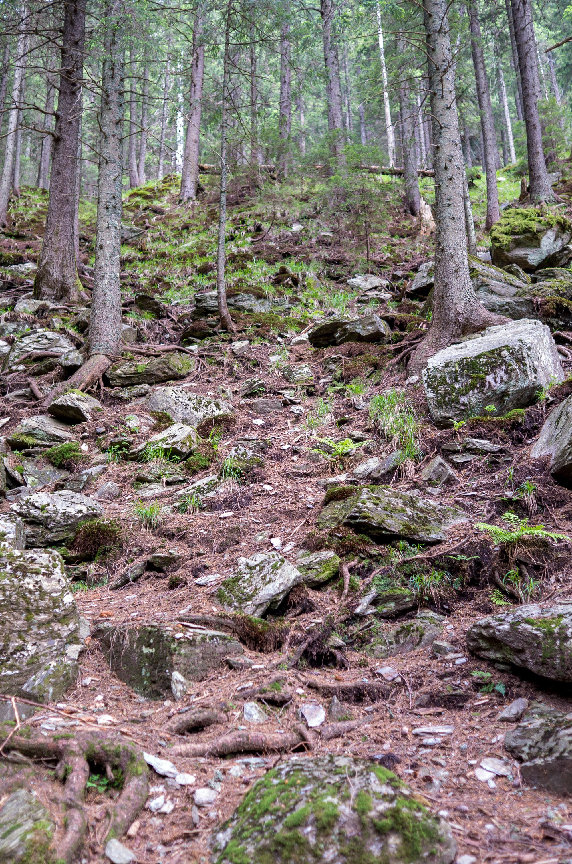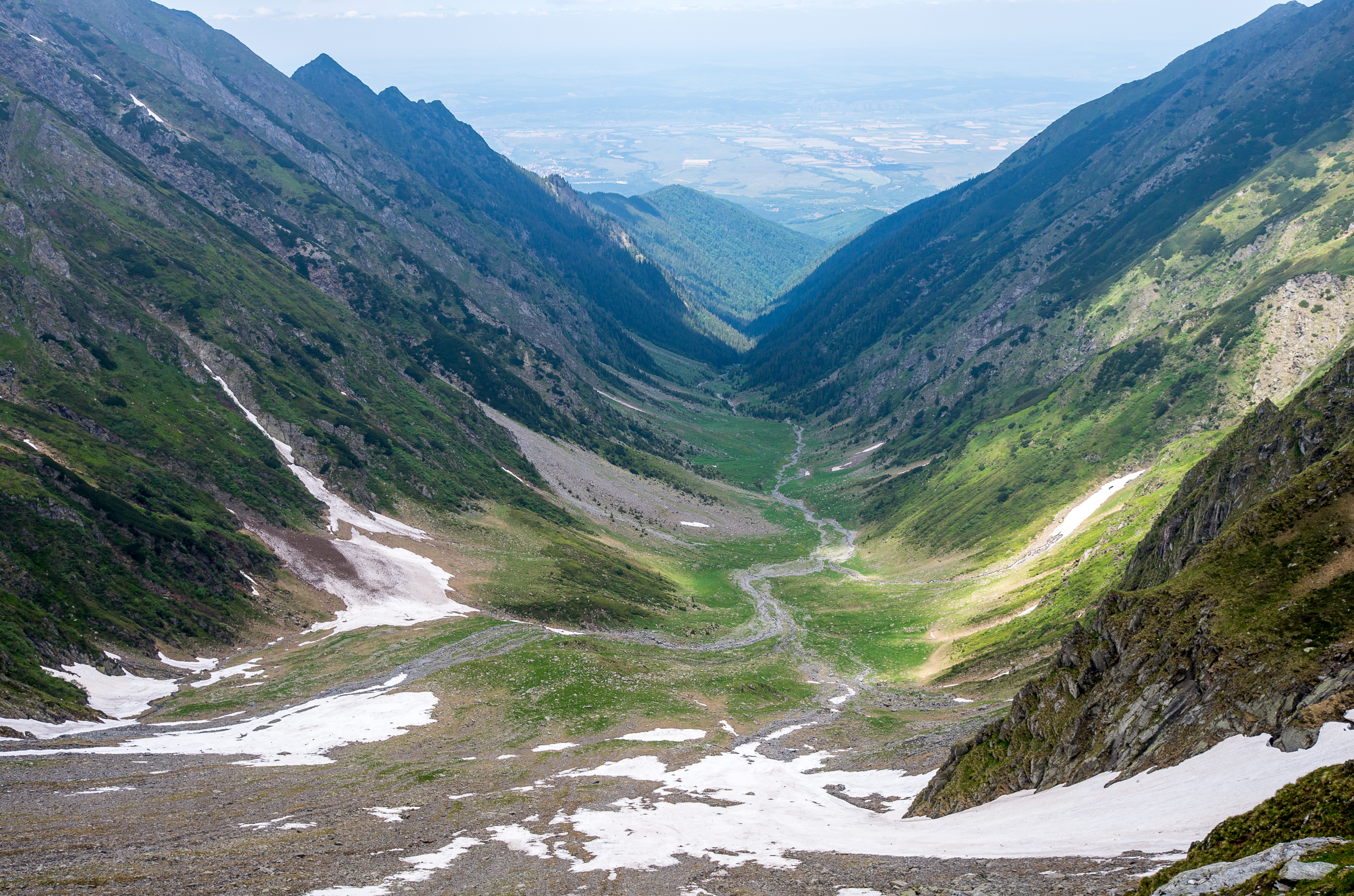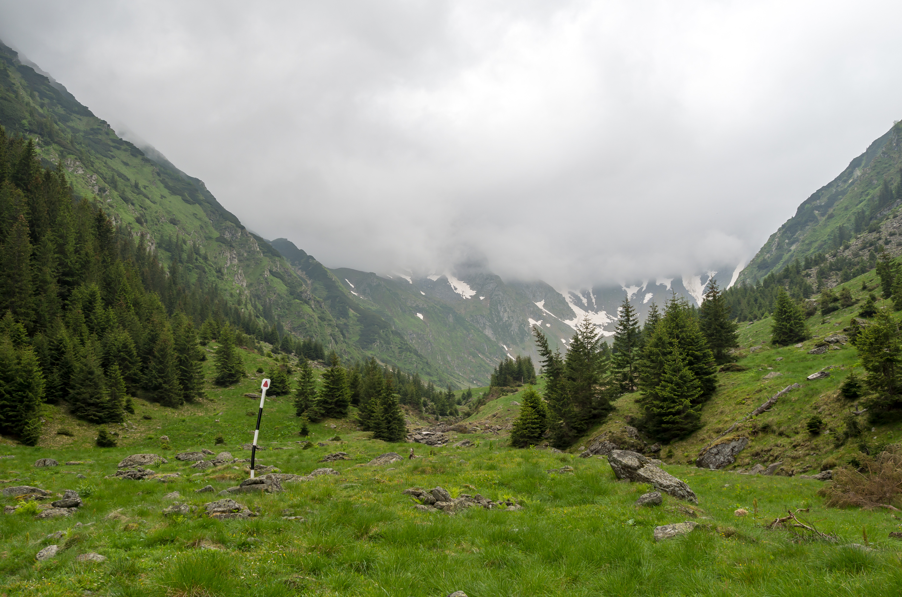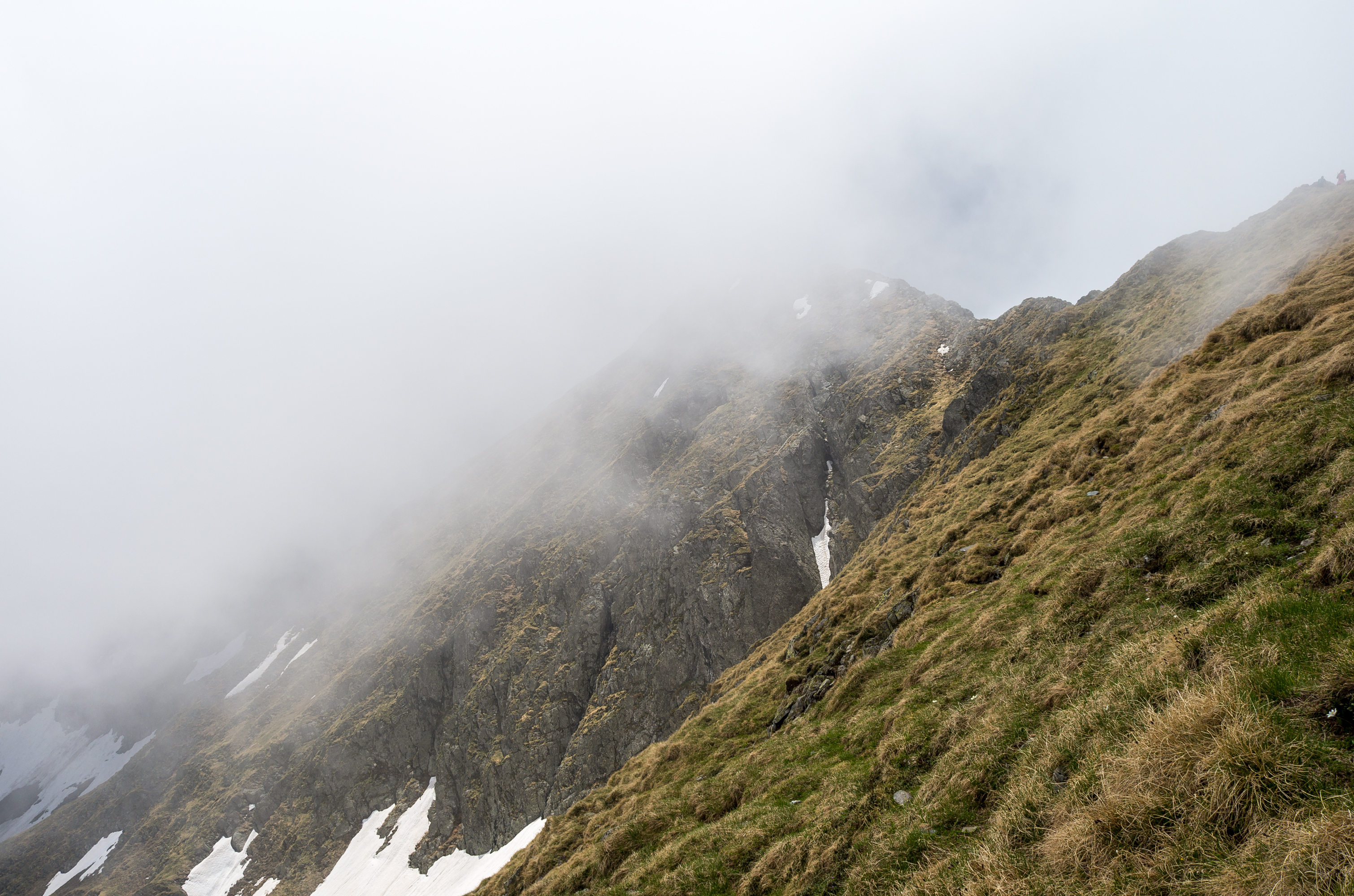 Si le sentier jusqu'au refuge, malgré ses pentes et ses jungles de bardane, nous a paru plutôt une promenade dans un parc, la partie la plus intéressante (pour ne pas dire "inquiétante") commence ici. En partant du refuge d'Izvorul Viștei, le paysage forestier laisse lentement place aux genévriers et aux éboulis, quand apparaissent les pâturages alpins et leurs torrents sous-glaciaires. La vallée en auge nous entoure de ses crêtes vertigineuses faites de schistes cristallins, parfois rocheux, parfois couverts de vert. Il pleut. Le brouillard s'installe et ne nous laisse pas deviner la paroi nord du versant, que nous savons pourtant quasi-verticale et austère. Mais, de cette façon, je ne me sens ni enivrée, ni accablée par les hauteurs. Sans voir le sommet, je peux me concentrer sur mes pas, sur là où je mets les pieds, et c'est bien, car juste au-dessus du cirque glaciaire, la pente se raidit. Vraiment. Éboulis, vieilles herbes et neiges : tout glisse. Nous avons à franchir des nombreuses rimayes et des marches à façonner dans la neige glacée. Après une heure de peines sur le versant, nous sommes soulagés d'arriver en haut de la brèche de Portița Viștei ("la petite porte de Viștea").