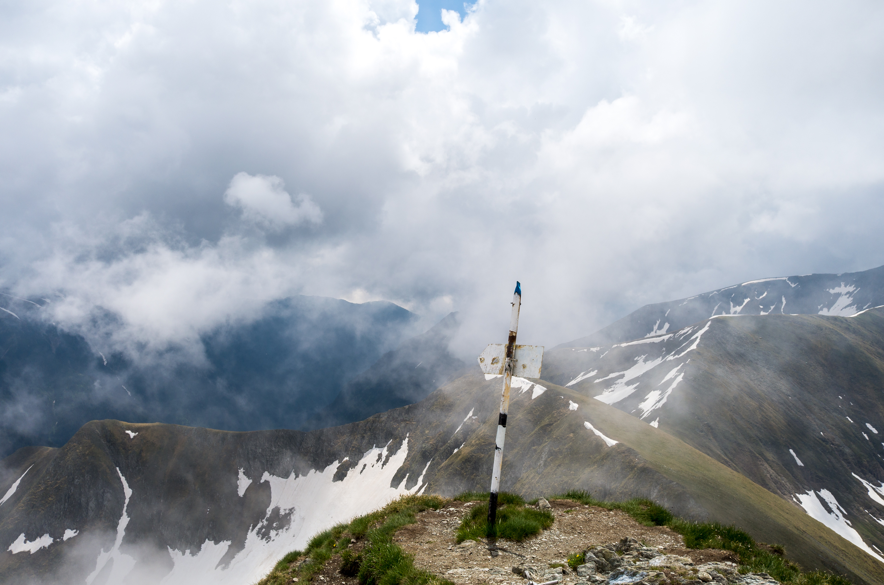 En moins de 30 minutes, nous arrivons en haut du Viștea Mare. Nous prenons quelques photos, mais la ferveur et l'adrénaline nous poussent vite vers notre terminus, le Moldoveanu. Toujours rocheuse, la sente de la crête redescend, traverse ensuite une brèche enneigée un peu plus technique et remonte de nouveau jusqu'à 2544 m au sommet du Moldoveanu. Là, nous sommes seuls. Nous respirons. Sourions. Baignés de soleil et de brouillards mouvants, entourés de vallées glaciaires parsemées de neige, le panorama nous fait oublier la difficulté de l'ascension et le soleil doux nous réchauffe les cheveux mouillés. Nous déjeunons assis sur le toit des Carpates.
