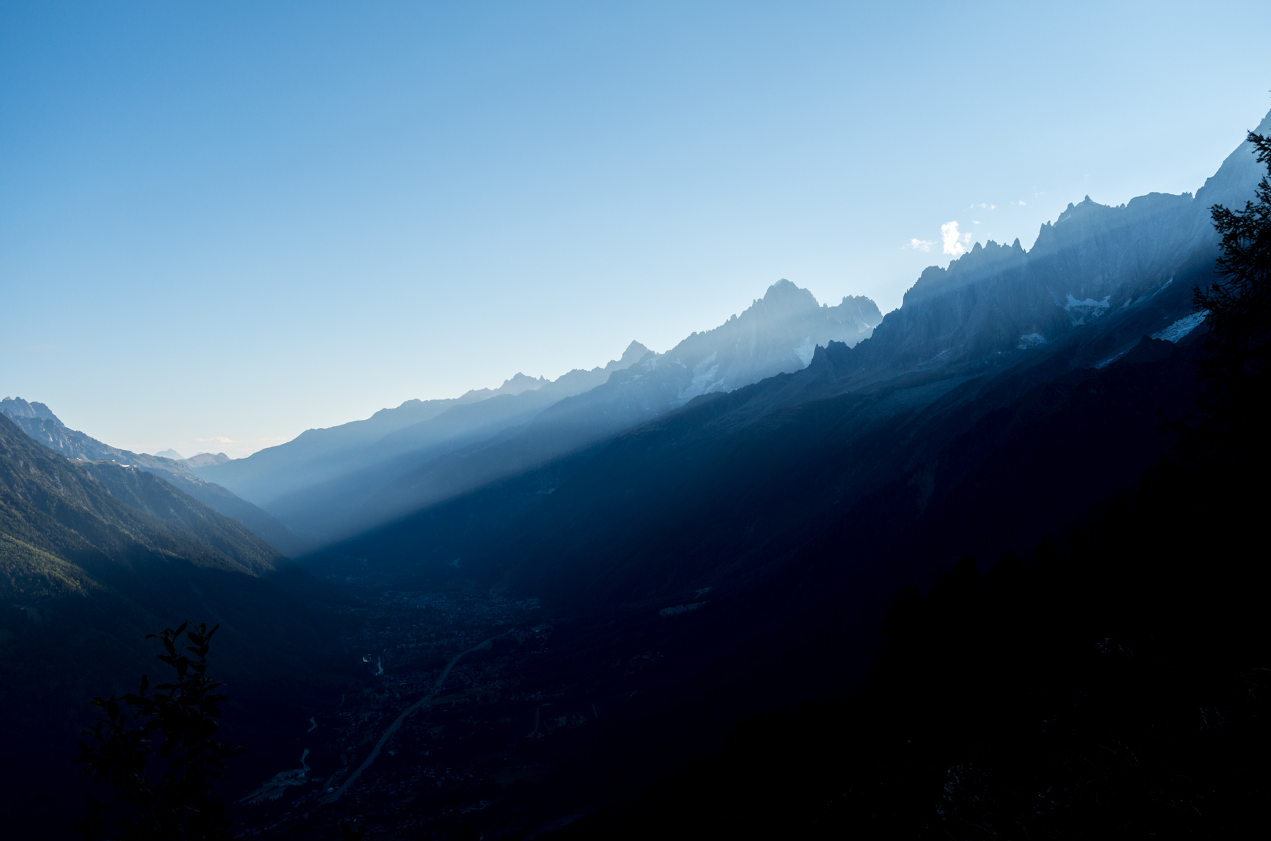 Le sentier qui part de Bellevue vers Mont Lachat monte au-dessus de la Vallée de Chamonix, encore endormie.
