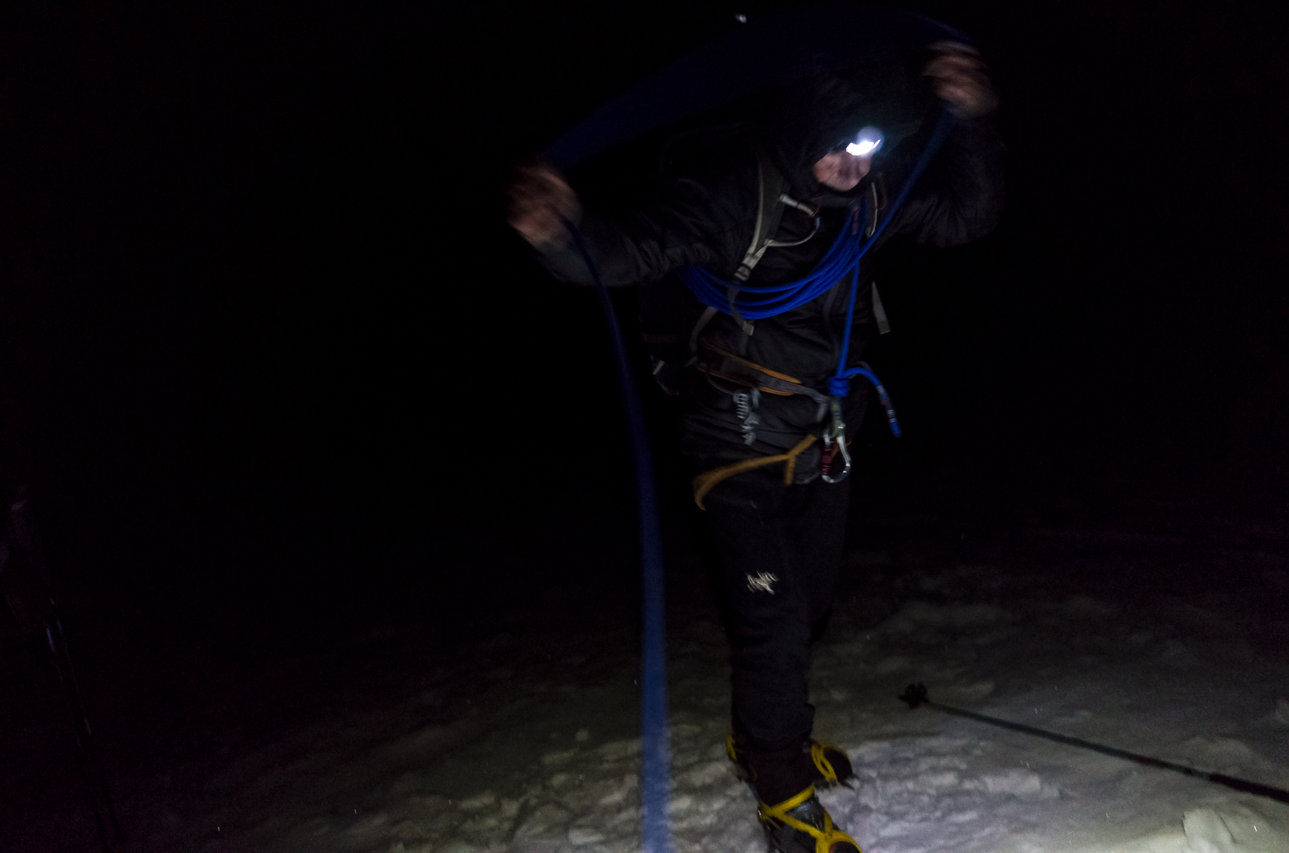 L’ascension commence dans le noir de la nuit, où l’élément le plus présent est le silence envahi du grincement des crampons dans la neige, un SCRUNCH ! SCRUNCH ! aigü, frais et vivifiant, qui chasse le dernier sillon de sommeil et aiguise sans délai nos esprits. Ensuite, il y a les différentes lumières : les faisceaux des lampes frontales, les étoiles en haut et, en bas à gauche, les colliers entrelacés de l'éclairage public de la vallée de Chamonix. Le froid ne manque pas à l’appel. Il fait environ -10°C à la sortie du refuge et ça n’ira pas en s’améliorant vers le haut.