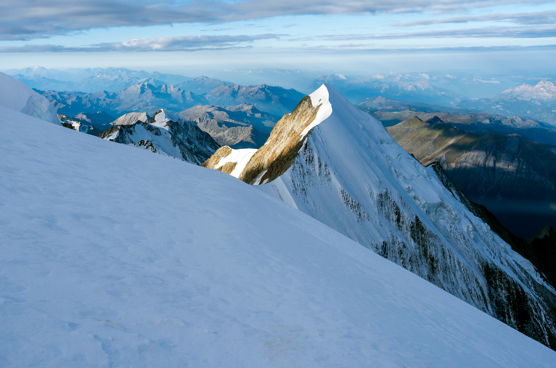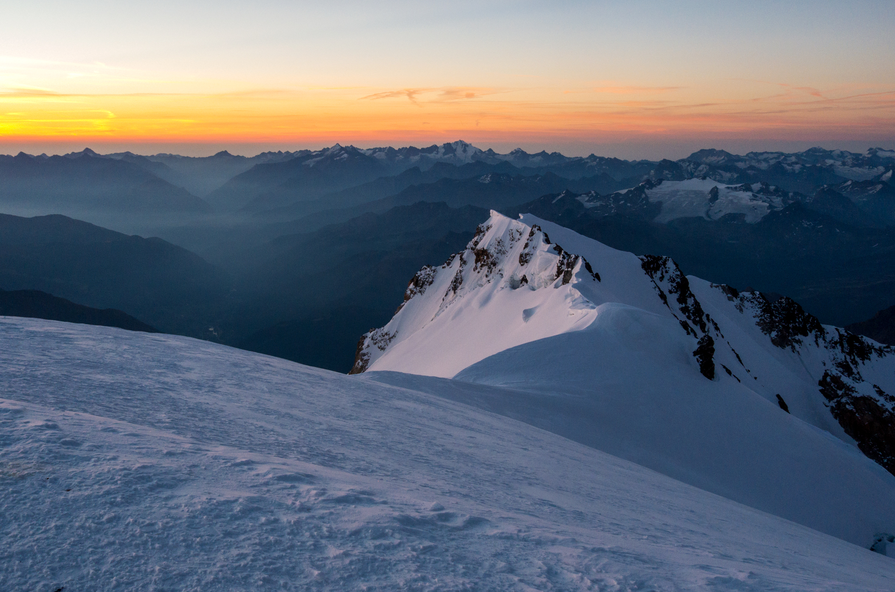À 7h06, un grand WOOOOW ! retentit au sommet, car le soleil vient de sortir derrière le massif du Mont-Rose, comme un joyau aux reflets oranges et roses. Tout paraît irréel et invraisemblable, au moment du passage-même entre rêve et réalité. Muets d’émoi, nous devons déjà dire au revoir au Mont-Blanc et commencer machinalement la longue descente.