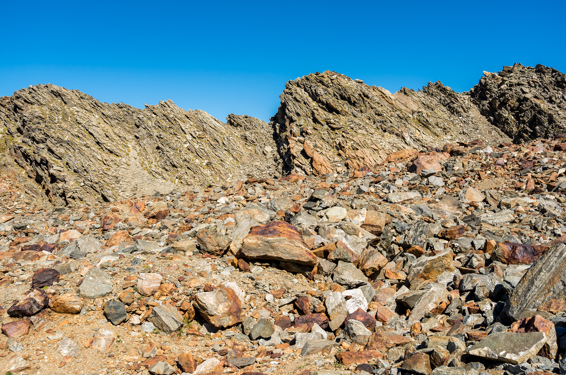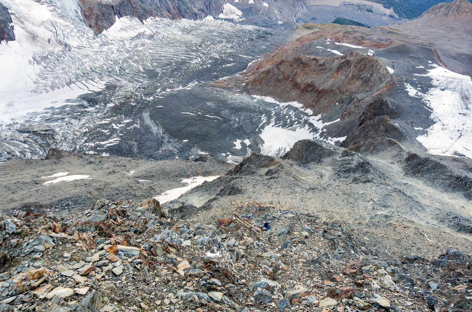 Dans le Couloir de la Mort, pas plus large que 50 m, les câbles avaient été récemment arrachés par les chutes de pierres et nous le traversons prestement, exhortés par les « Allez, allez, allez ! » de Jean-Claude. Les brisures de gneiss, empilées les unes au-dessus des autres dans un fragile équilibre, comme un chateau de cartes, n’attendent qu’à s’effondrer.