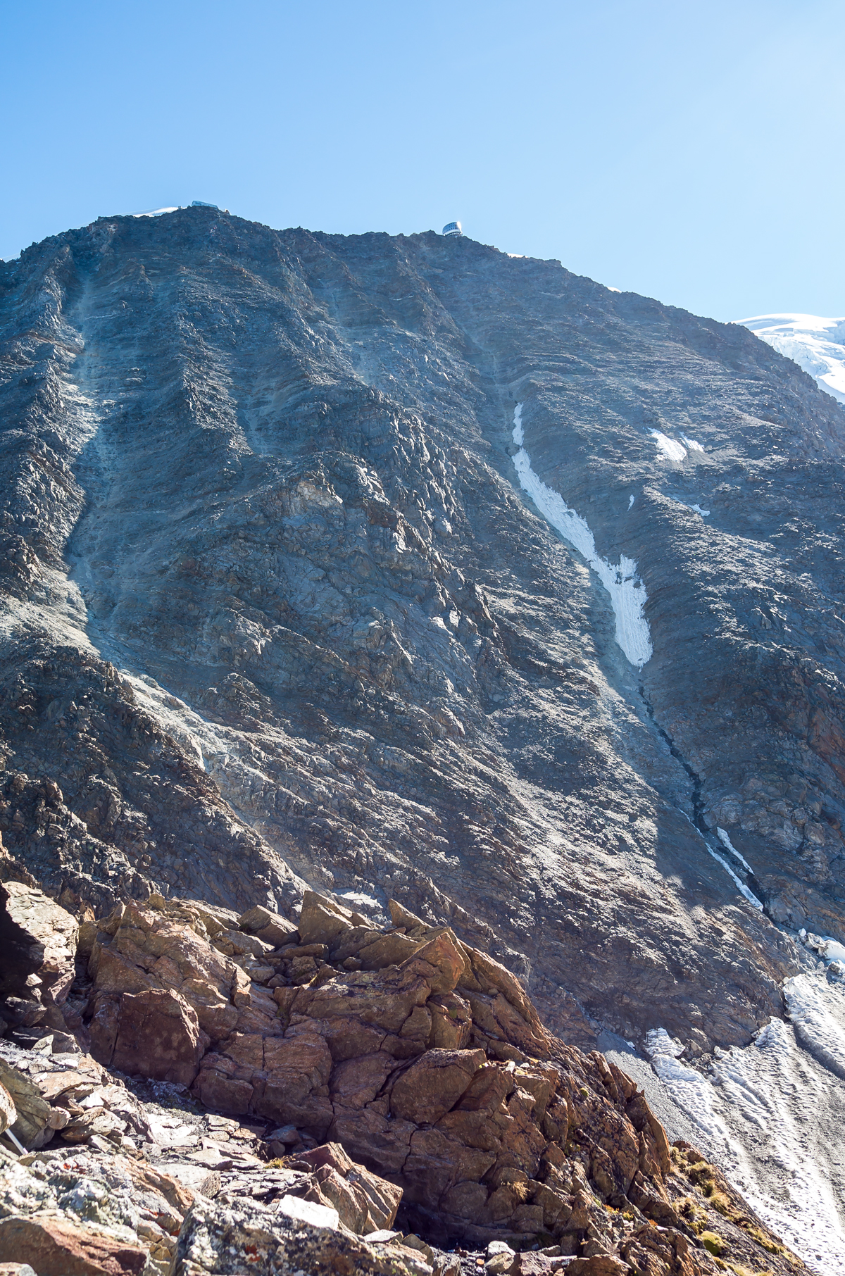 L’ancien Refuge du Goûter vu depuis le nouveau et un aperçu du Grand Couloir.
