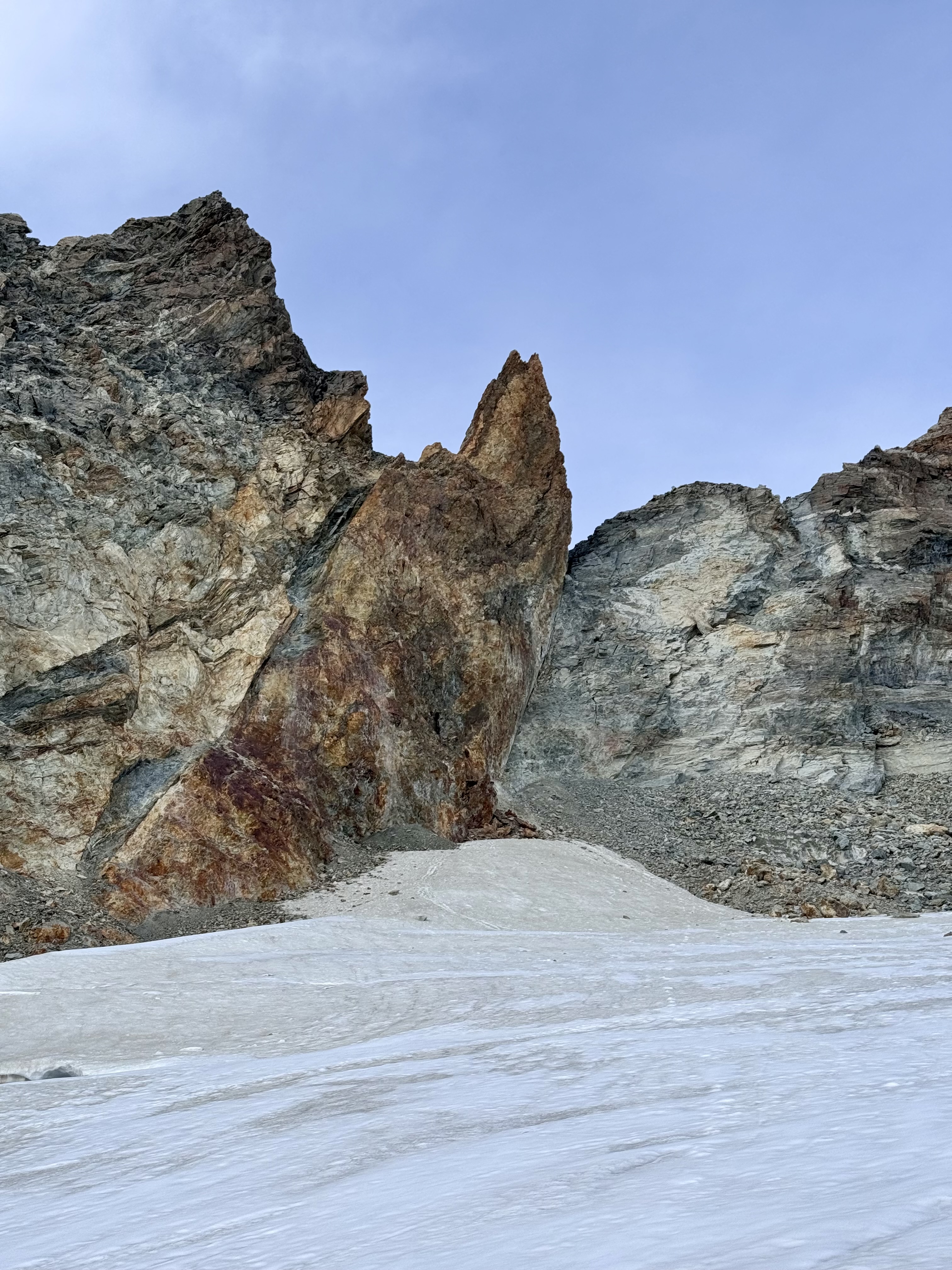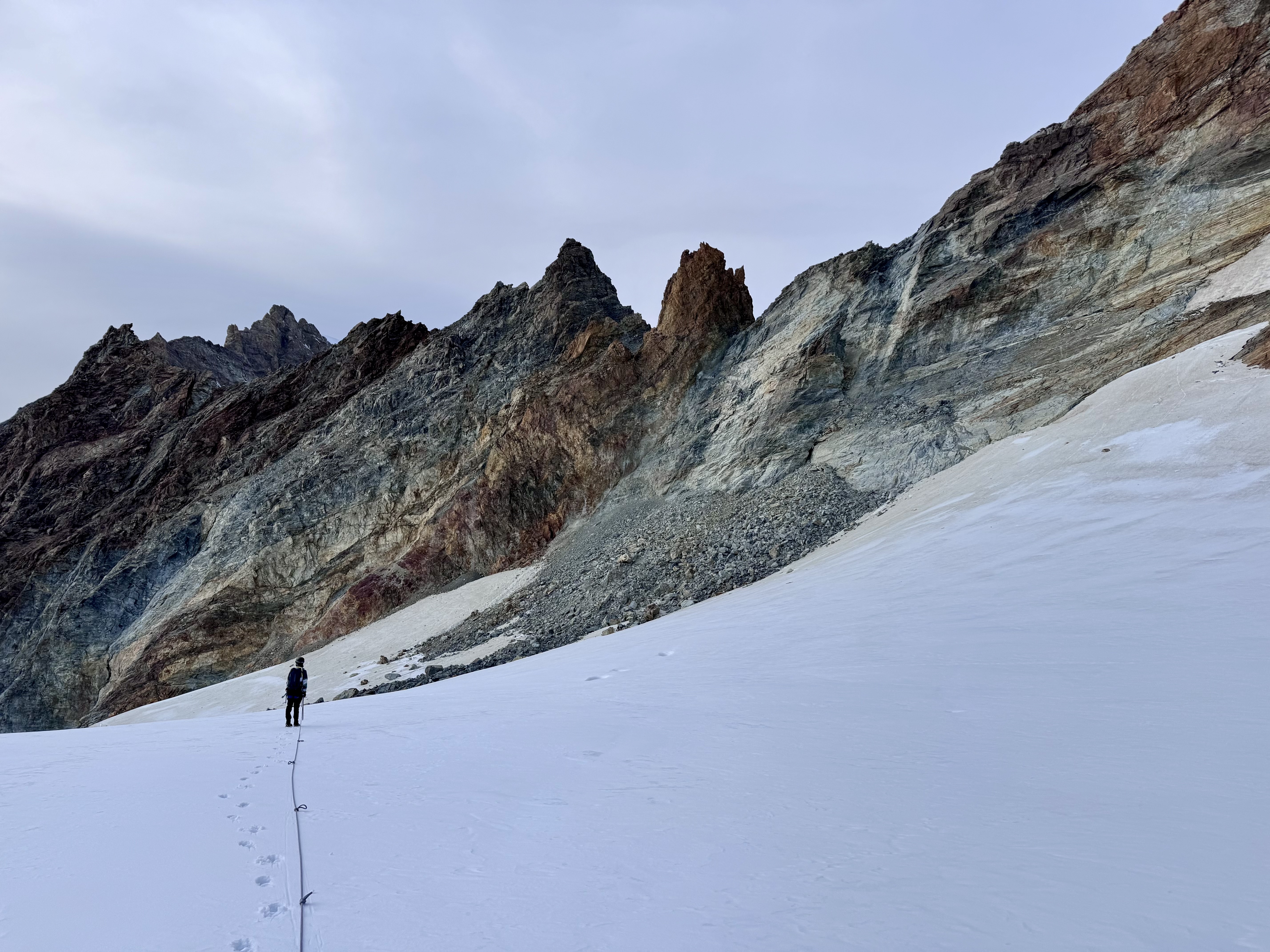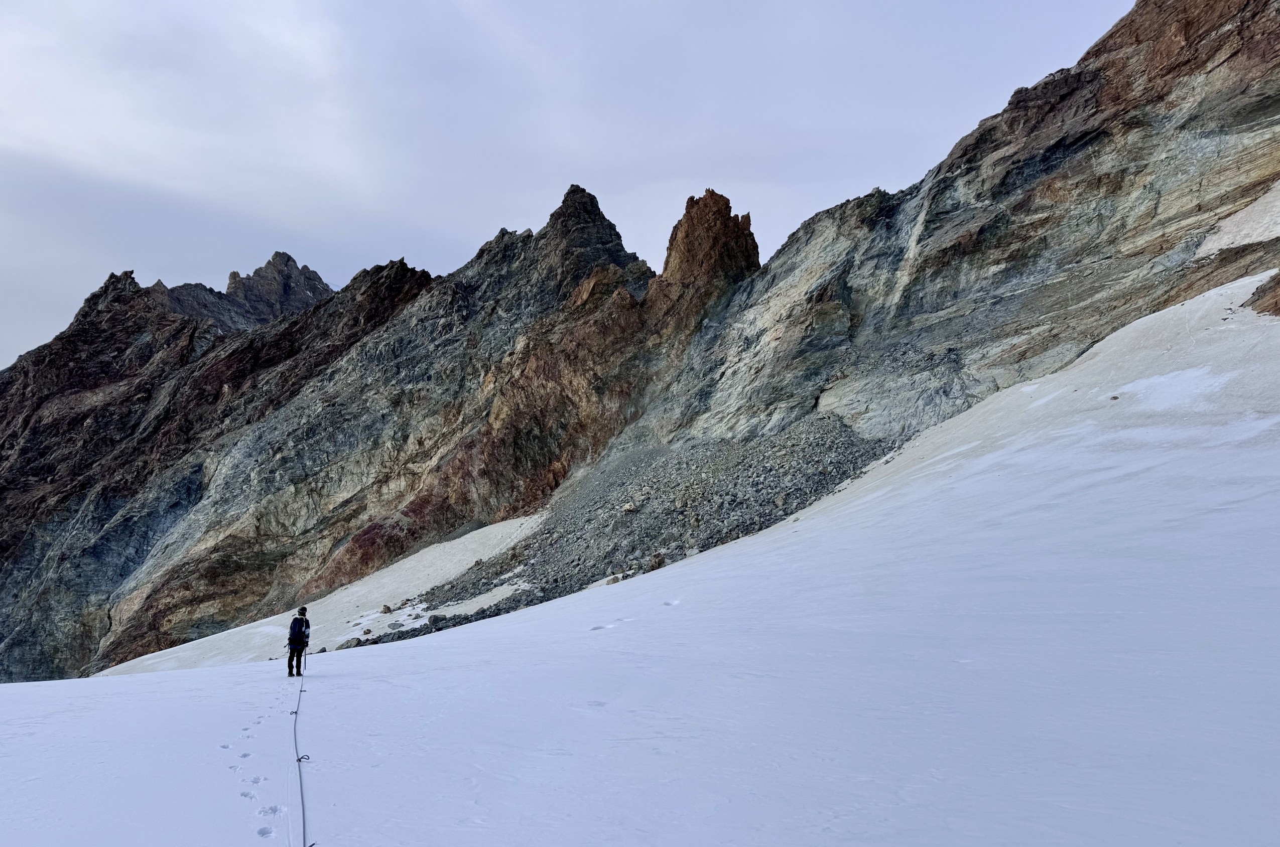 Depuis le gendarme est, on commence la traversée descendante d’une pente de neige à 60–70°, jusqu’à un ressaut rocheux qui trône au milieu. C’est mon tour. Lancelot m’assure d’en haut, Julien m’attend déjà sur le ressaut. J’avance avec diligence face à la pente, dans une neige qui a la consistance des aigrettes de pissenlit. Au début, elle tient ; puis, d’un coup, je ne sens plus rien sous mes pieds. Je glisse — je gliiiiiiisse ! Le piolet ne mord plus. Je culbute entre les brins de corde, qui arrêtent ma glissade une dizaine de mètres plus bas. Mon kit crevasse — broche à glace, deux poulies autobloquantes, descendeur — s’arrache de mon baudrier et file dans le vide. Une seconde glissade, plus courte, achève de me déstabiliser. Je hyperventile ; mon corps se met à trembler. « Tu vas bien ? ». Non. Non, pas vraiment. Réunis sur le ressaut, on regarde le glacier tout en bas, très loin. Comment redescendre ? Pour l’instant, je suis défaite, prête à capituler, à appeler les secours coûte que coûte. Mais Lancelot, d’un calme glacial, trace une stratégie de descente. Il demande l’heure. Il dit que c’est faisable. Une part de moi le croit, l’autre reste incrédule.