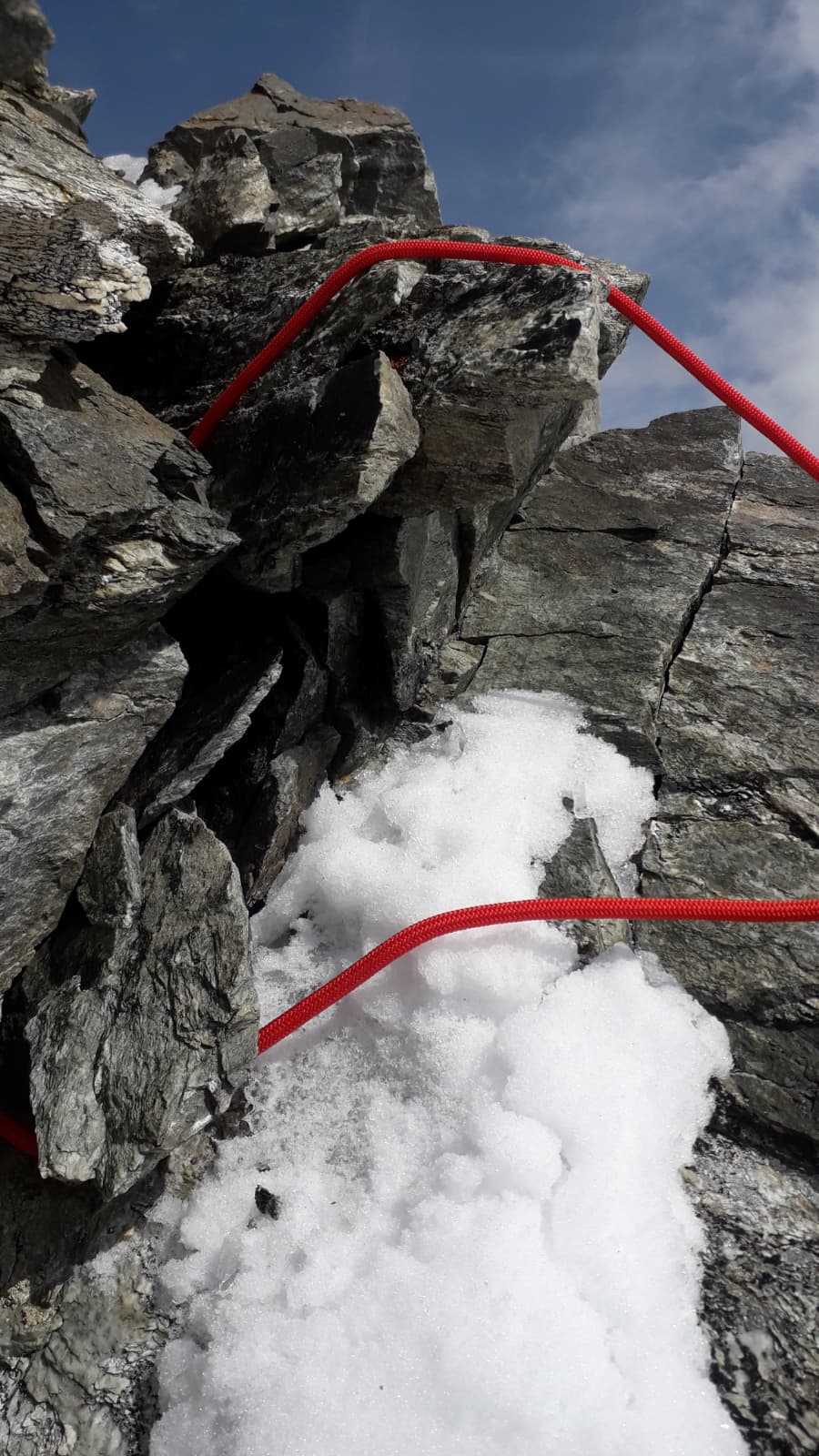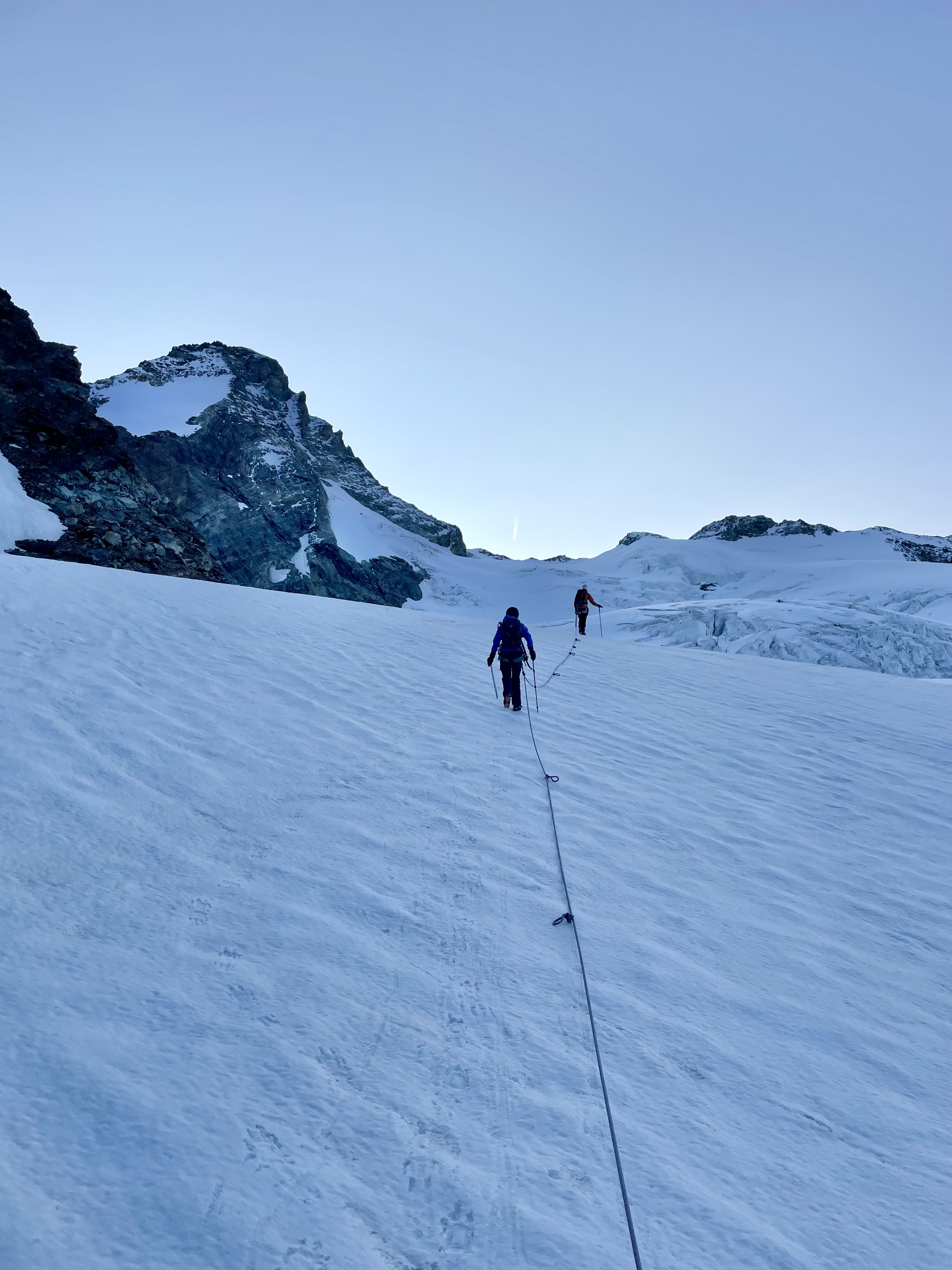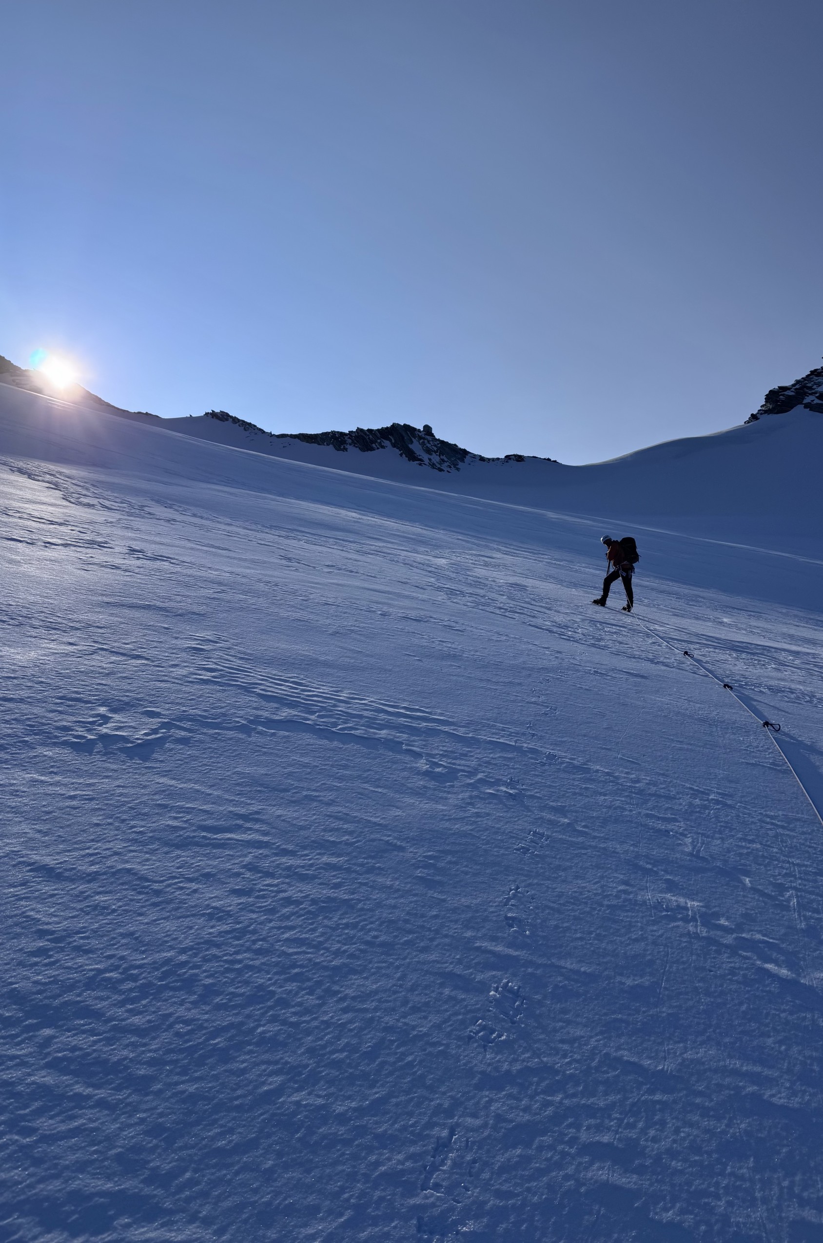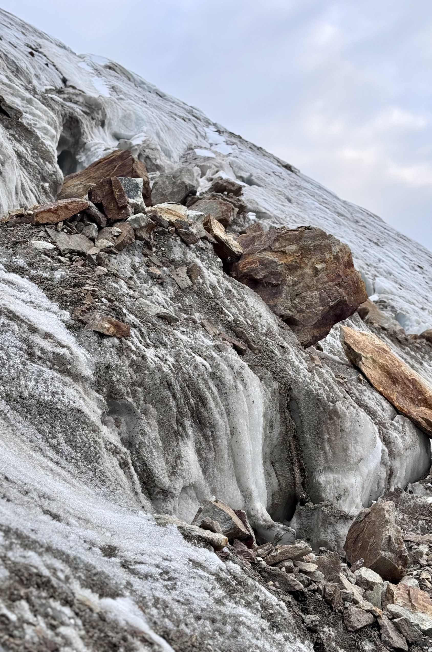 Depuis le gendarme est, on commence la traversée descendante d’une pente de neige à 60–70°, jusqu’à un ressaut rocheux qui trône au milieu. C’est mon tour. Lancelot m’assure d’en haut, Julien m’attend déjà sur le ressaut. J’avance avec diligence face à la pente, dans une neige qui a la consistance des aigrettes de pissenlit. Au début, elle tient ; puis, d’un coup, je ne sens plus rien sous mes pieds. Je glisse — je gliiiiiiisse ! Le piolet ne mord plus. Je culbute entre les brins de corde, qui arrêtent ma glissade une dizaine de mètres plus bas. Mon kit crevasse — broche à glace, deux poulies autobloquantes, descendeur — s’arrache de mon baudrier et file dans le vide. Une seconde glissade, plus courte, achève de me déstabiliser. Je hyperventile ; mon corps se met à trembler. « Tu vas bien ? ». Non. Non, pas vraiment. Réunis sur le ressaut, on regarde le glacier tout en bas, très loin. Comment redescendre ? Pour l’instant, je suis défaite, prête à capituler, à appeler les secours coûte que coûte. Mais Lancelot, d’un calme glacial, trace une stratégie de descente. Il demande l’heure. Il dit que c’est faisable. Une part de moi le croit, l’autre reste incrédule.