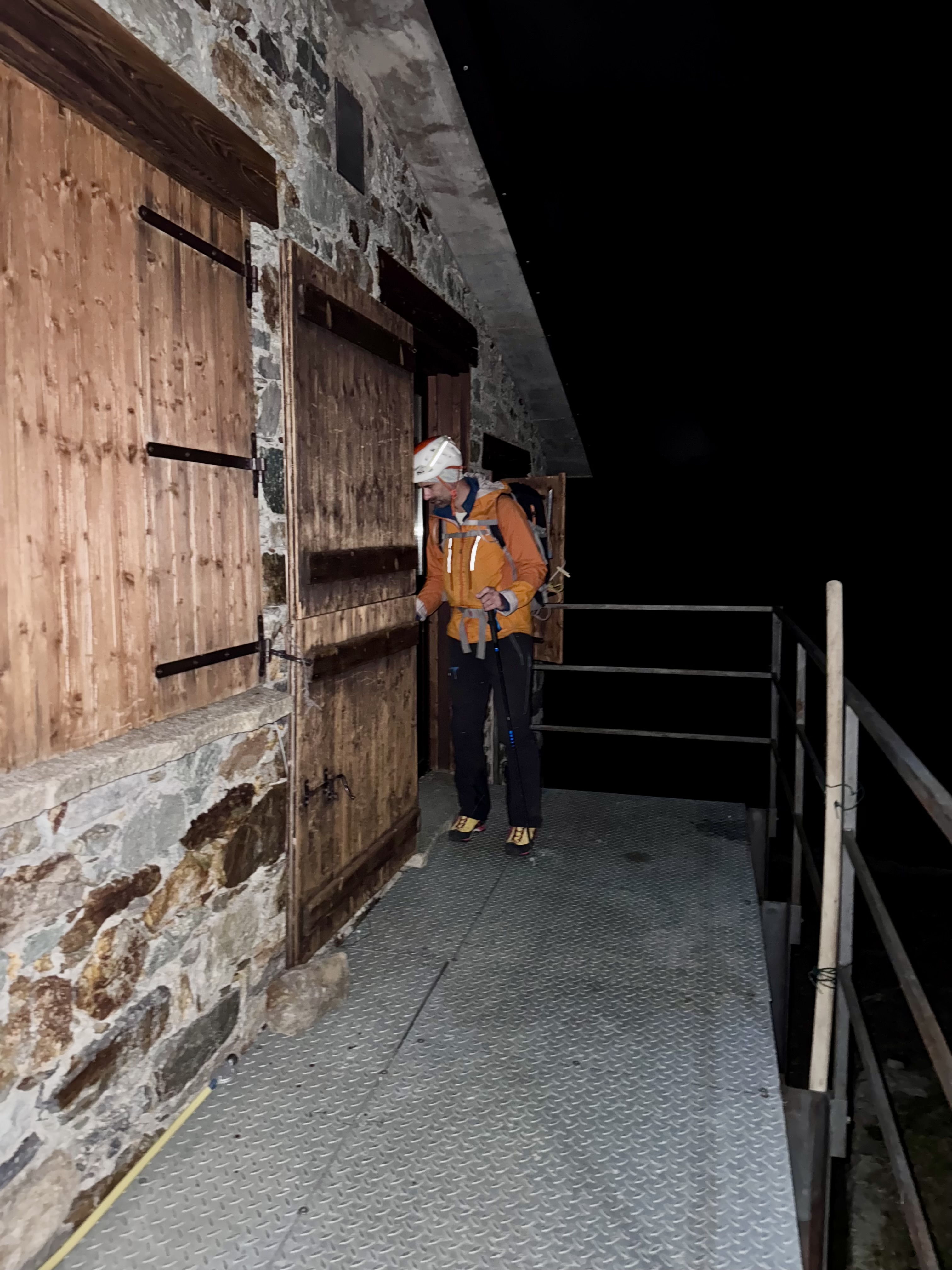 20h50. Deux guides de Valpelline aperçoivent nos frontales sur la moraine et viennent à notre rencontre. Ils prennent nos sacs, la corde ; ils nous aident à gravir les derniers quarante mètres de D+ jusqu’au refuge. Leur geste, simple et humain, me touche. Diego, le gardien — revenu aujourd’hui pour les derniers détails de la fermeture hivernale — nous sert une énorme assiette de pâtes, puis une viande marinée et une purée. Aucune purée n’aura jamais été aussi bonne ! La nuit est agitée ; le sommeil m’échappe. En pleine nuit, je sors prendre de l’air. Les pieds plantés dans la pelouse d’edelweiss, la tête plongée dans la Voie lactée, je respire la lumière pâle de la lune gibbeuse et cela m’apaise. Le sommeil finit par venir.