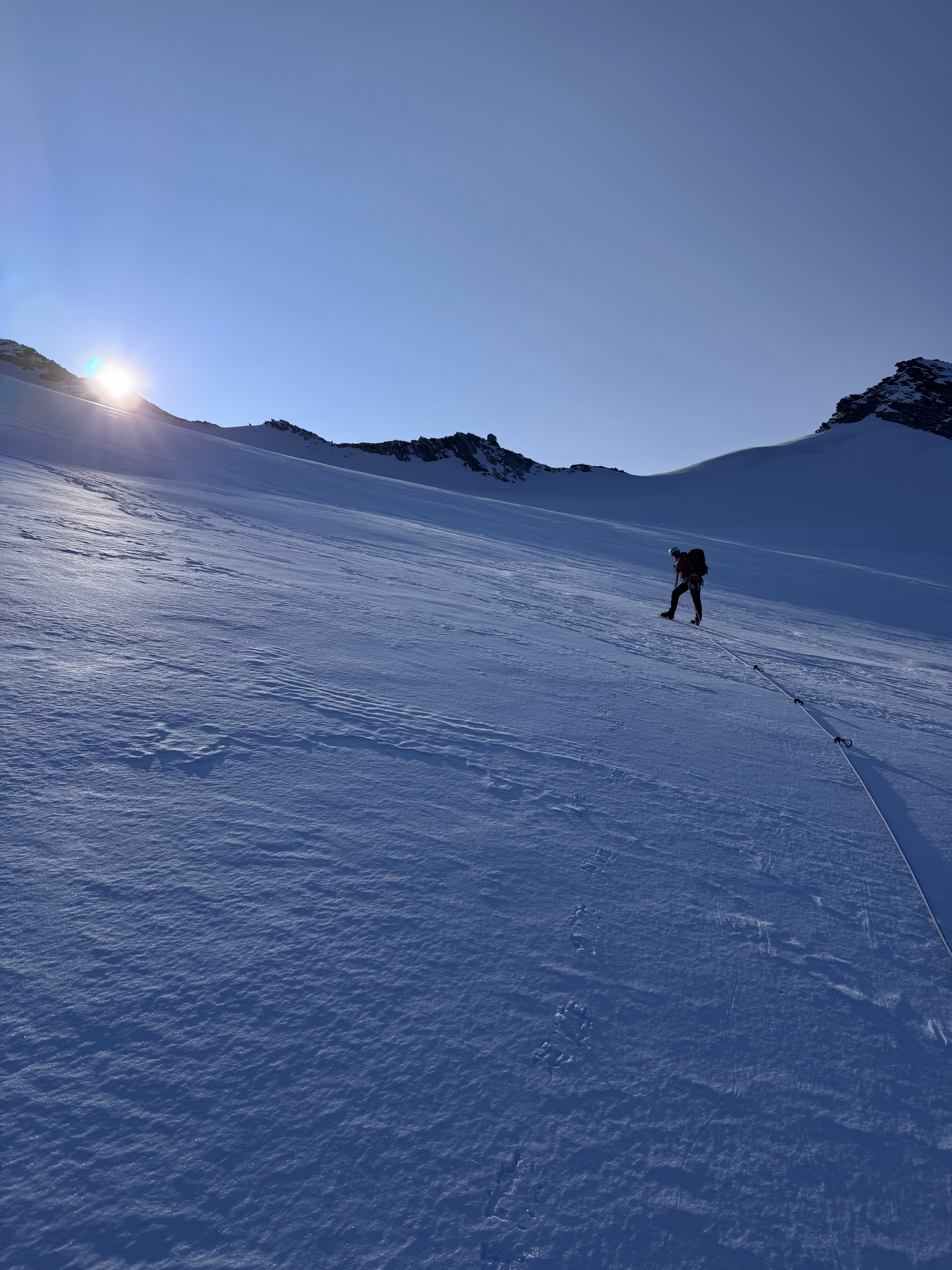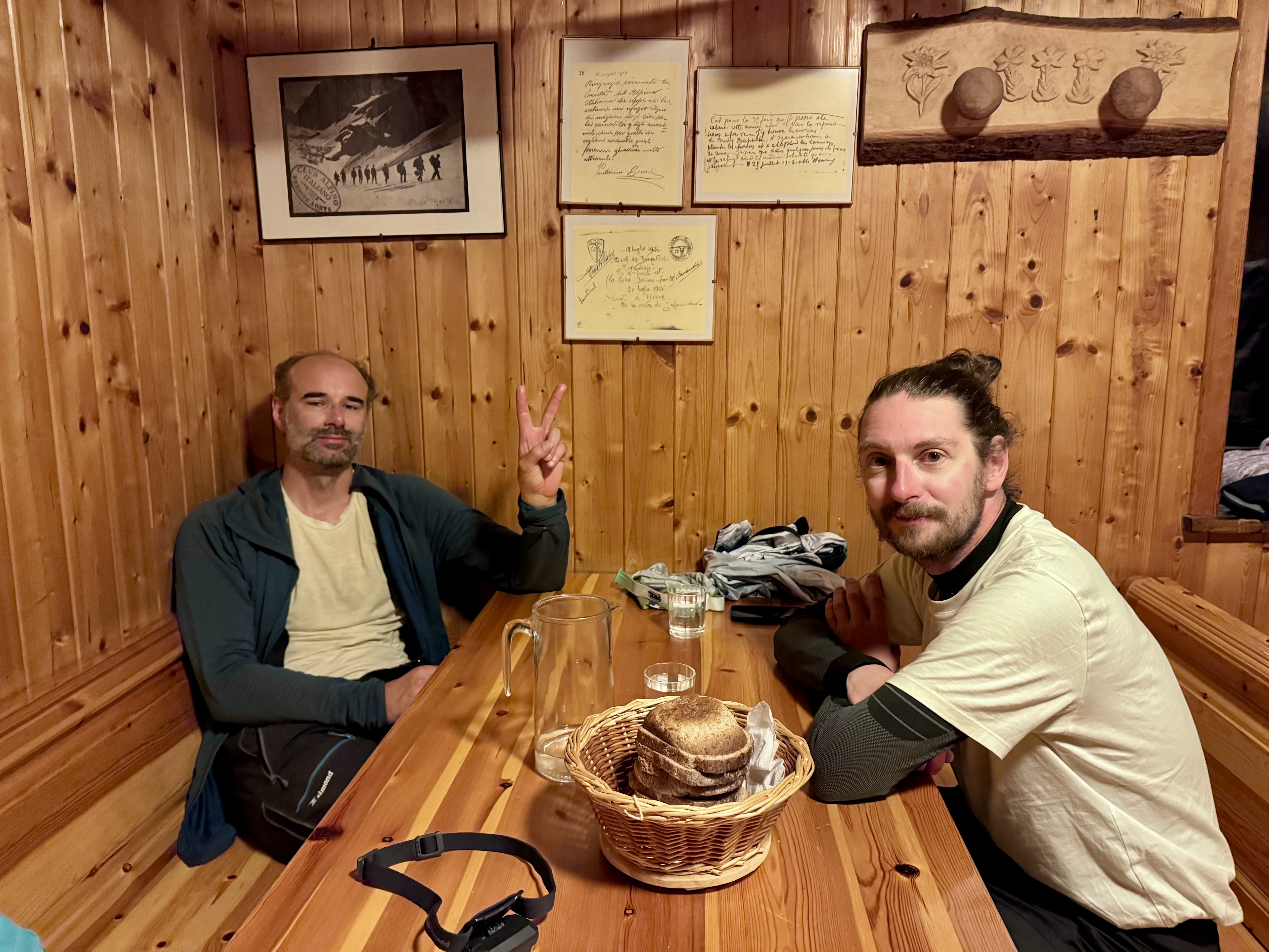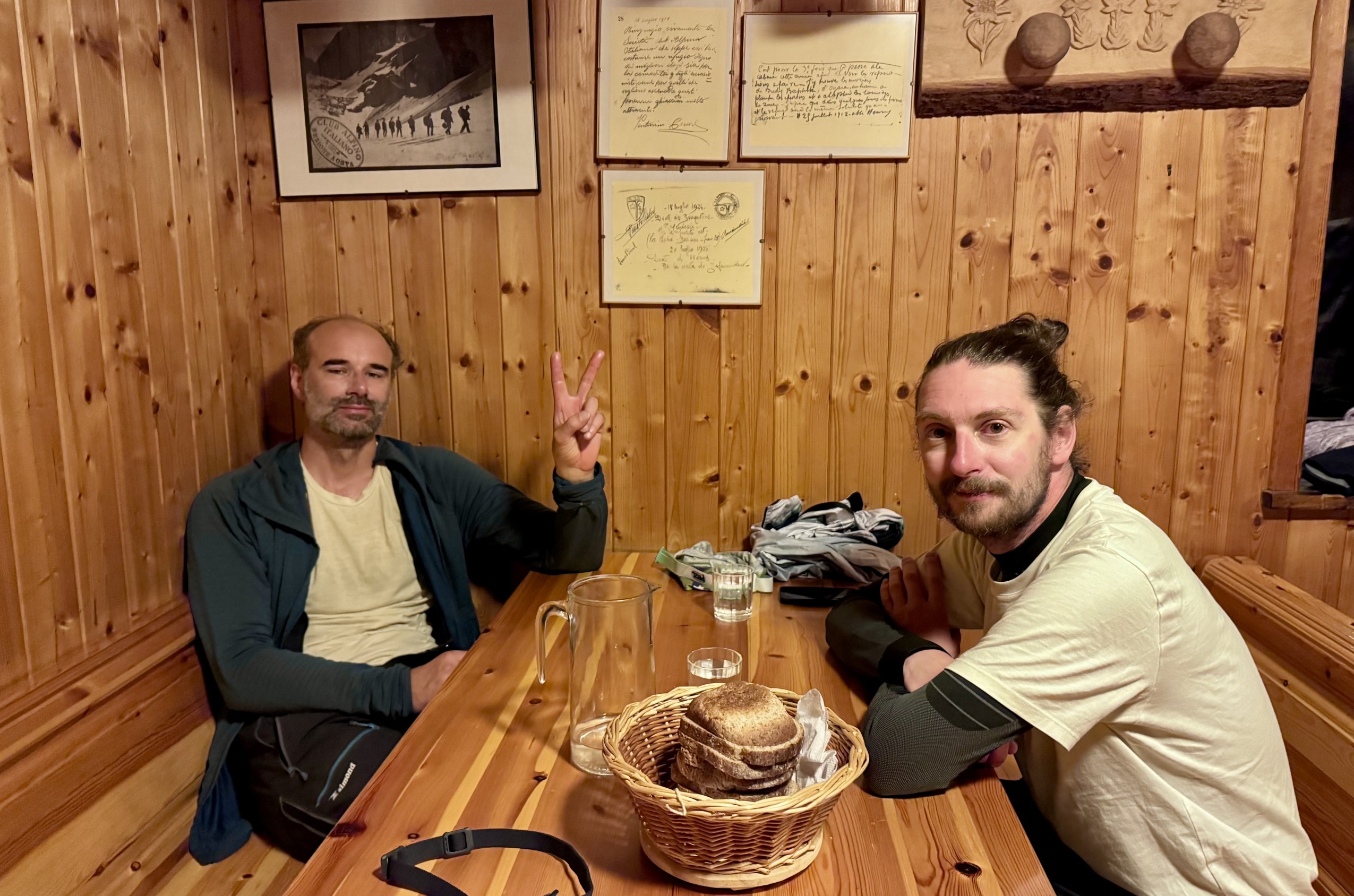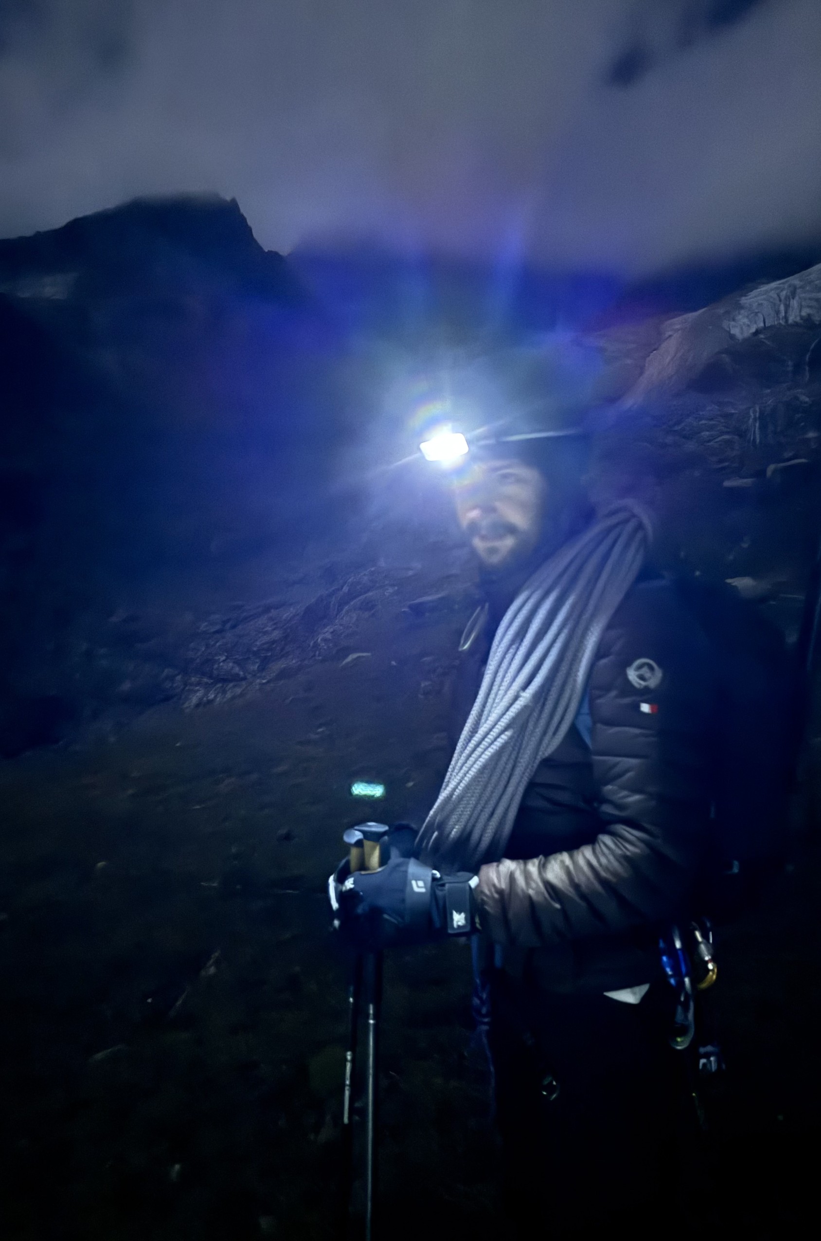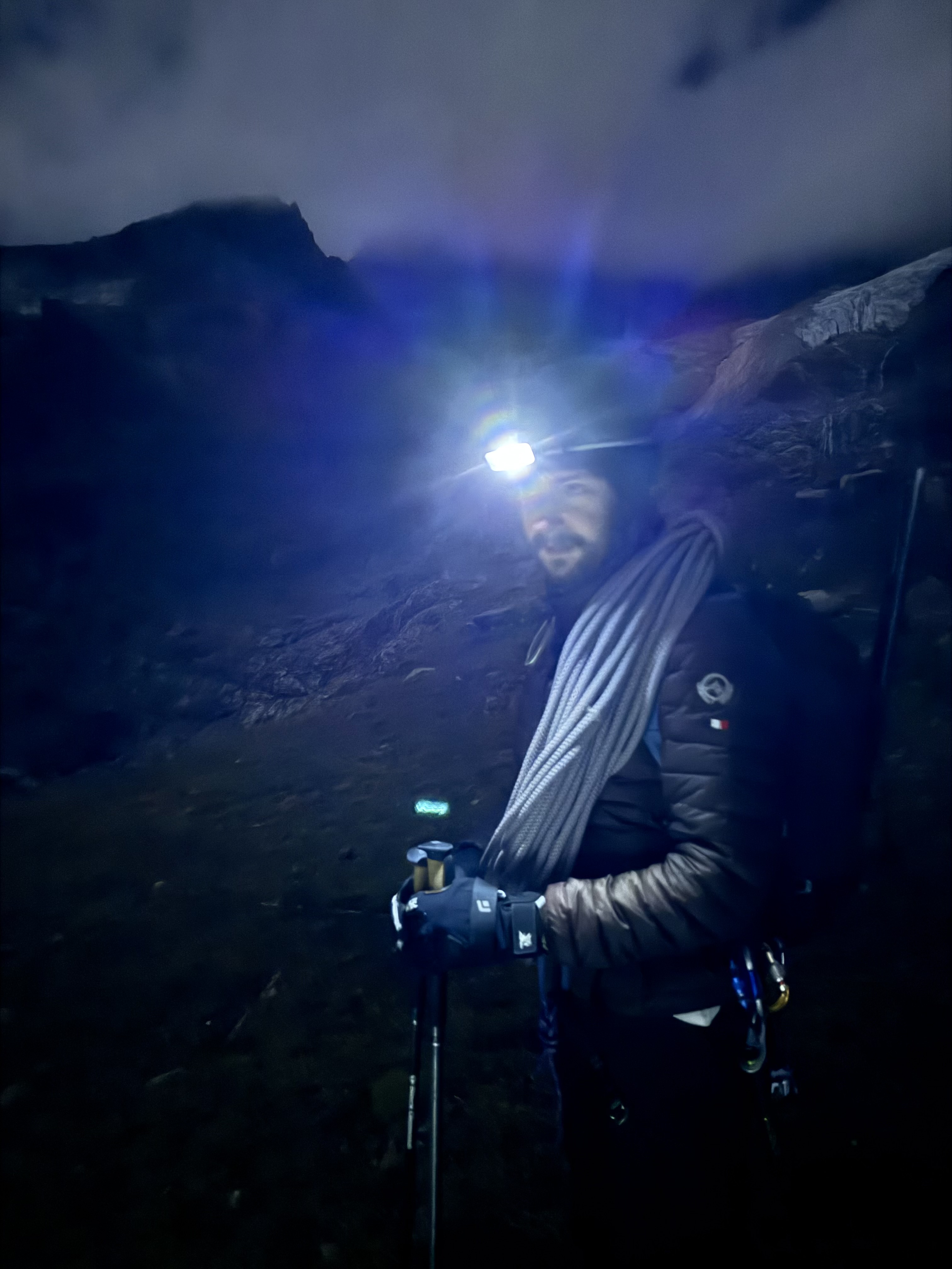 Bonne fenêtre météo les 12–13 septembre. Nous sommes trois : Lancelot, Julien et moi. Trois niveaux différents d’expérience, de motivation et de forme physique. Lancelot, l’aguerri ; Julien, dont la motivation est la plus grande force en ce moment ; et moi, plutôt en forme, encore sous l’effet de la récente sortie au Weissmies et au Lagginhorn.
