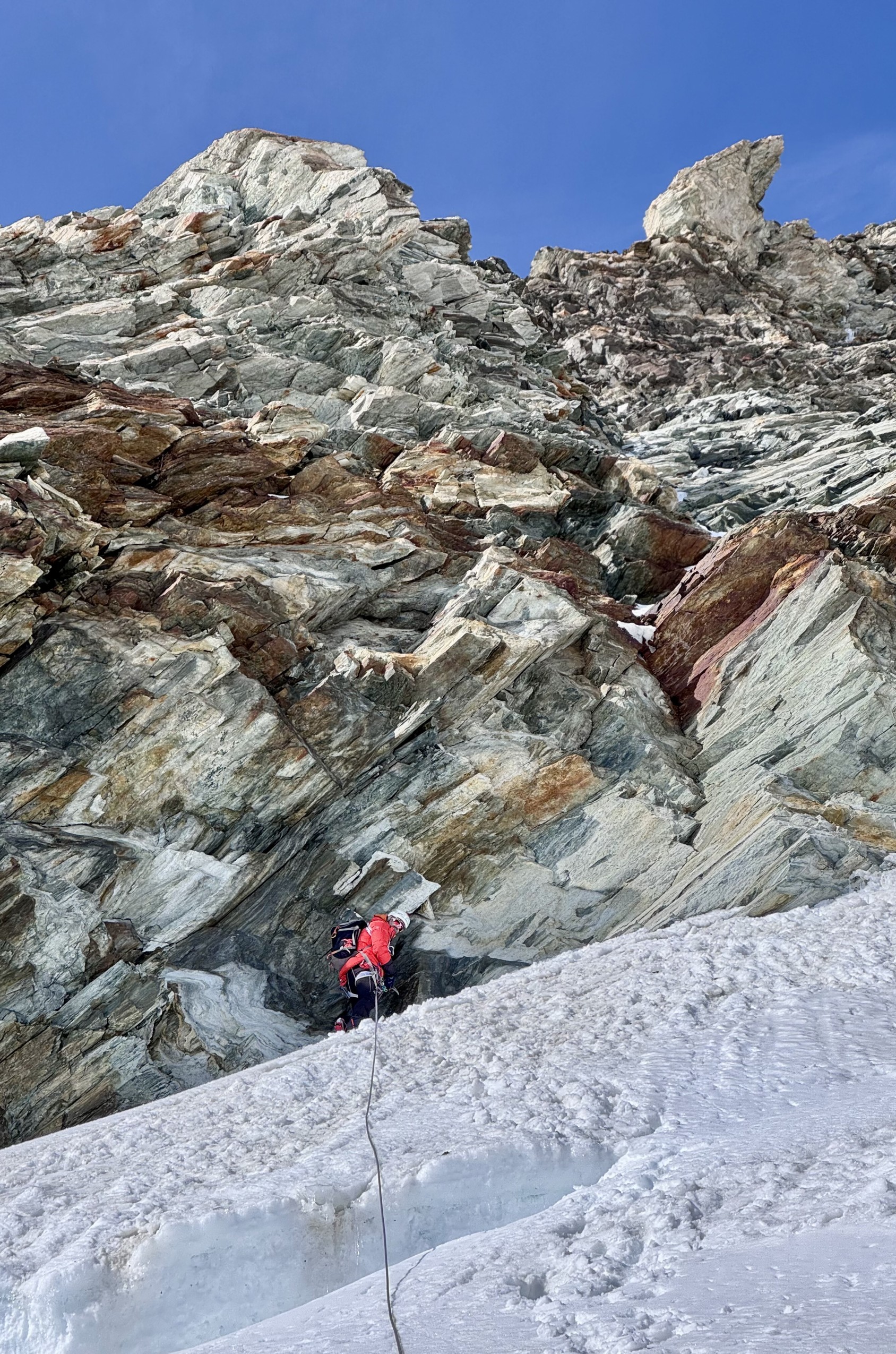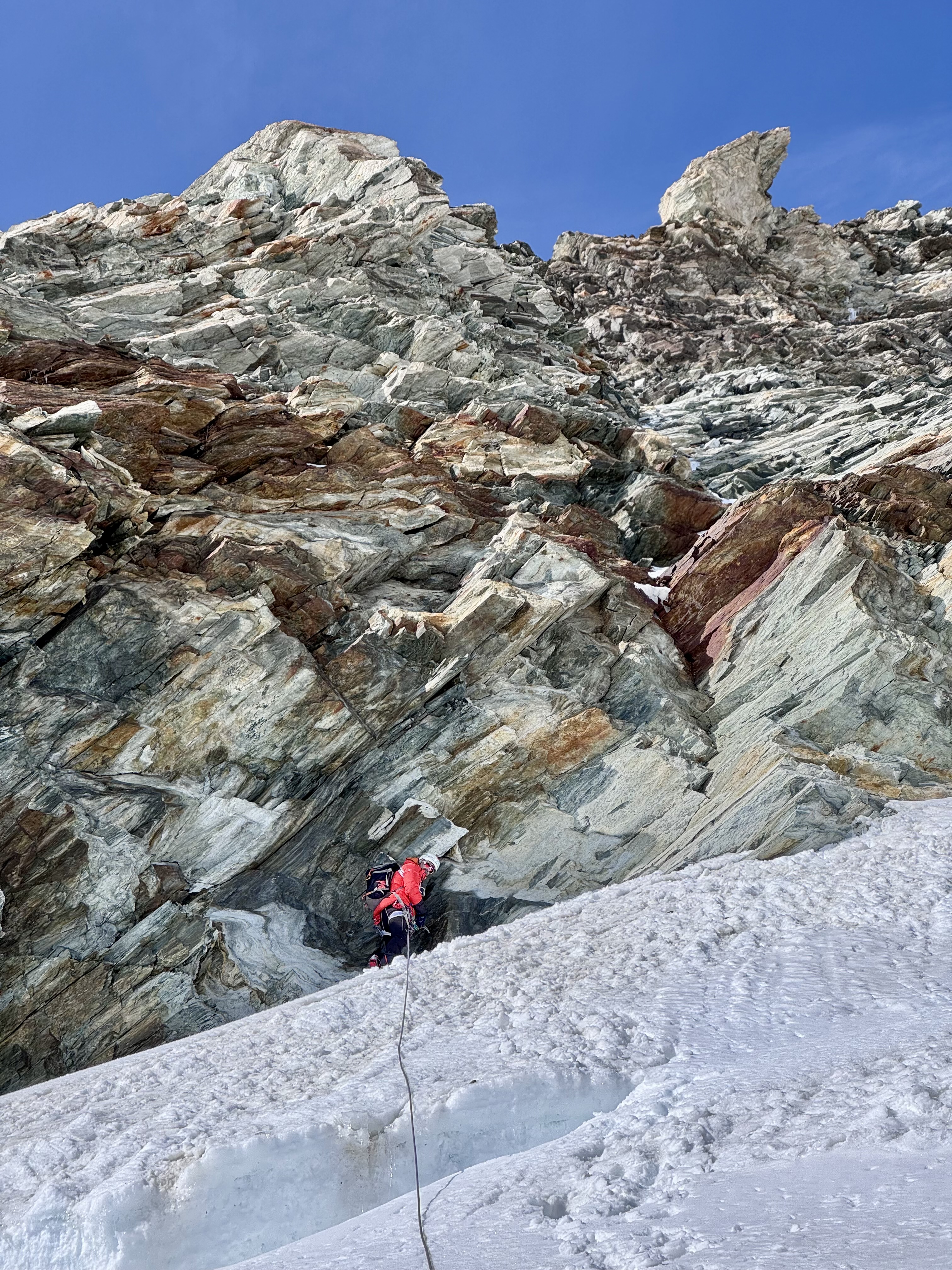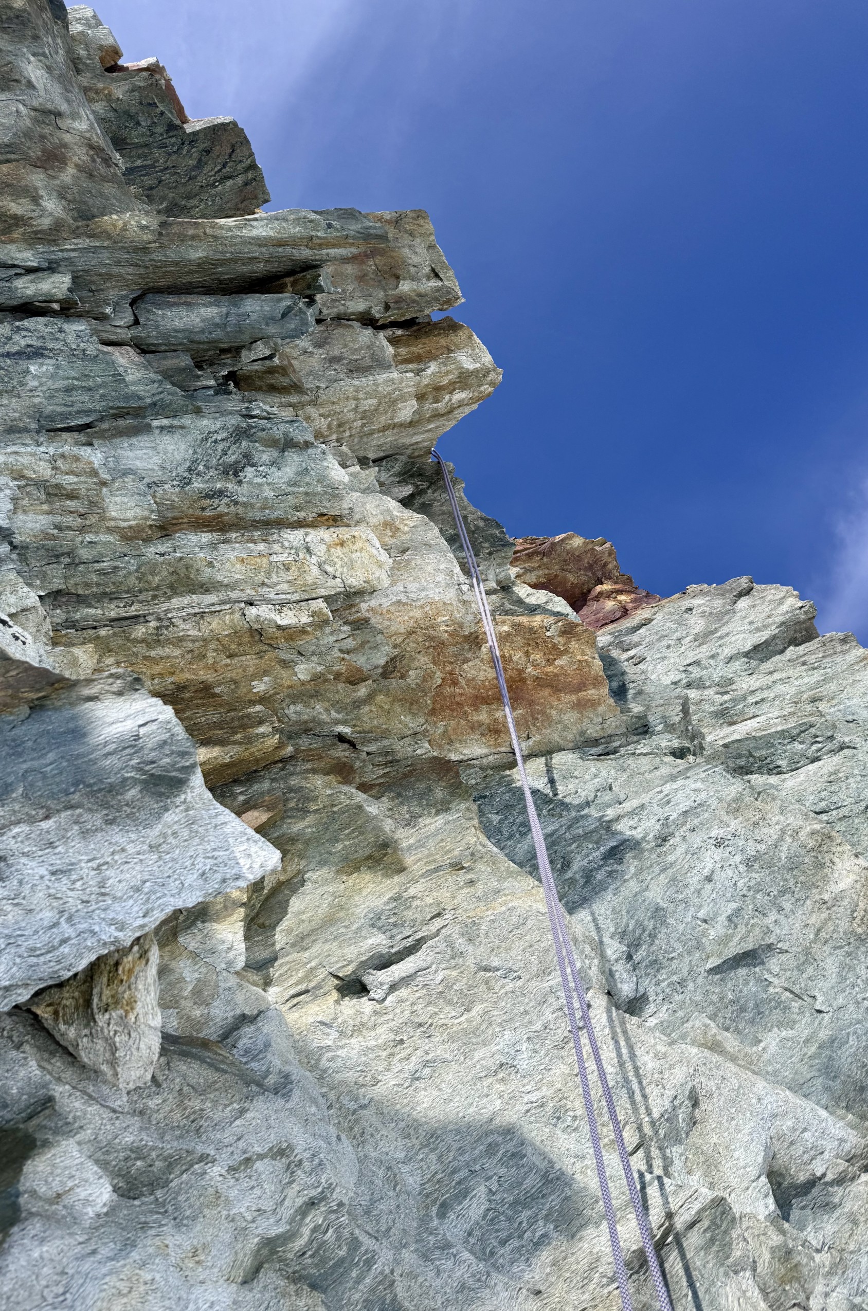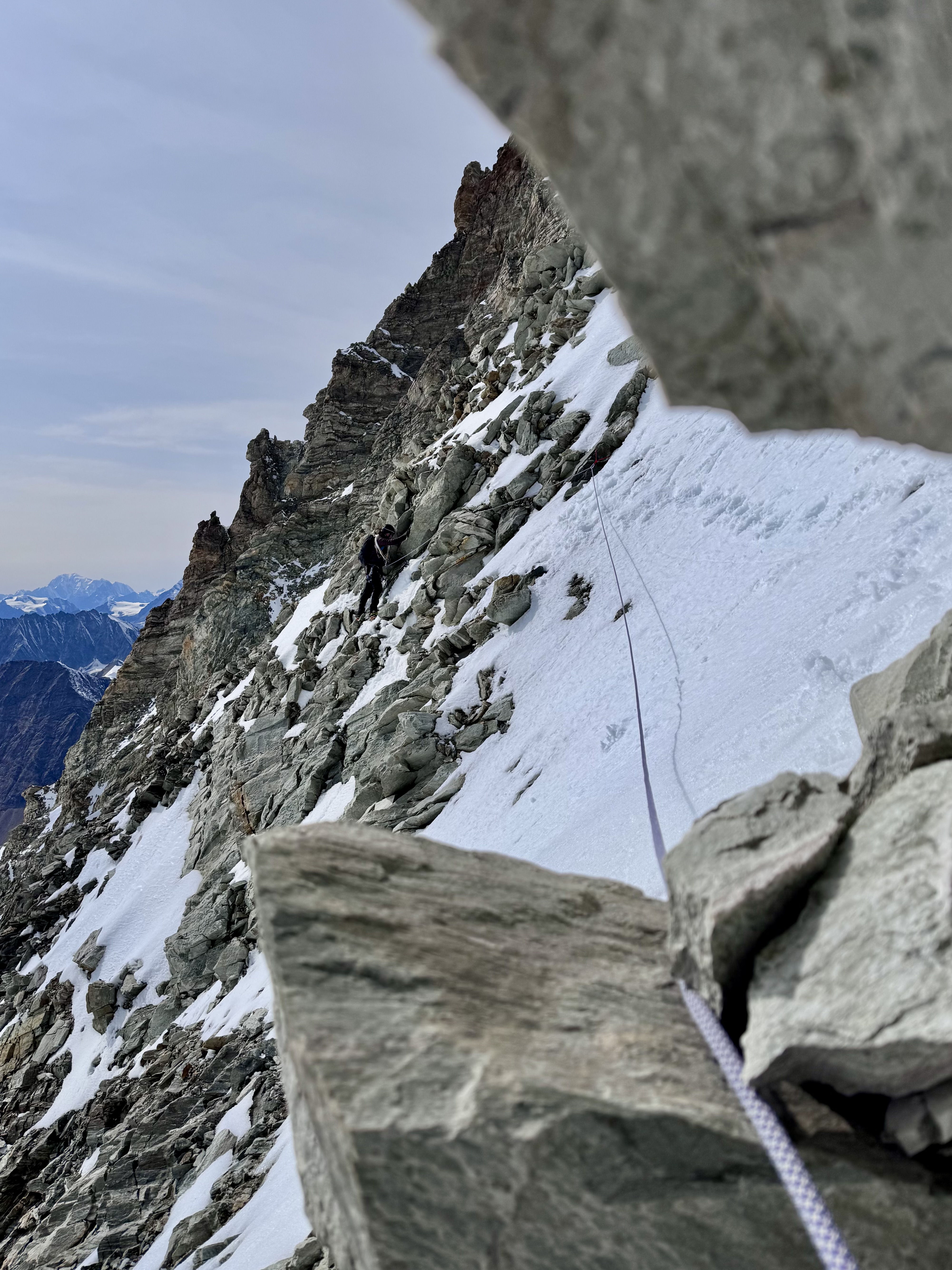 11h39. Nous sommes au sommet du gendarme crochu de l’arête est (4 075 m). Devant nous, à l’ouest, la Corne d’Hérens (4 148 m) s’élance contre le ciel, strate après strate. Ce n’est pas une corne, mais une carnassière de gneiss prête à déchirer quiconque s’y hasarde. Au nord, la Dent Blanche. À l’est, l’arête du Lion du Cervin, noyée dans le brouillard. Je sors de ma rêverie minérale. Nos regards sondent des voies possibles — et impossibles. Mais Julien n’est pas bien, il est au bout. À seulement 98 m du sommet, un seul choix s’impose : battre en retraite. « On est clairement trop lents, on redescend. »