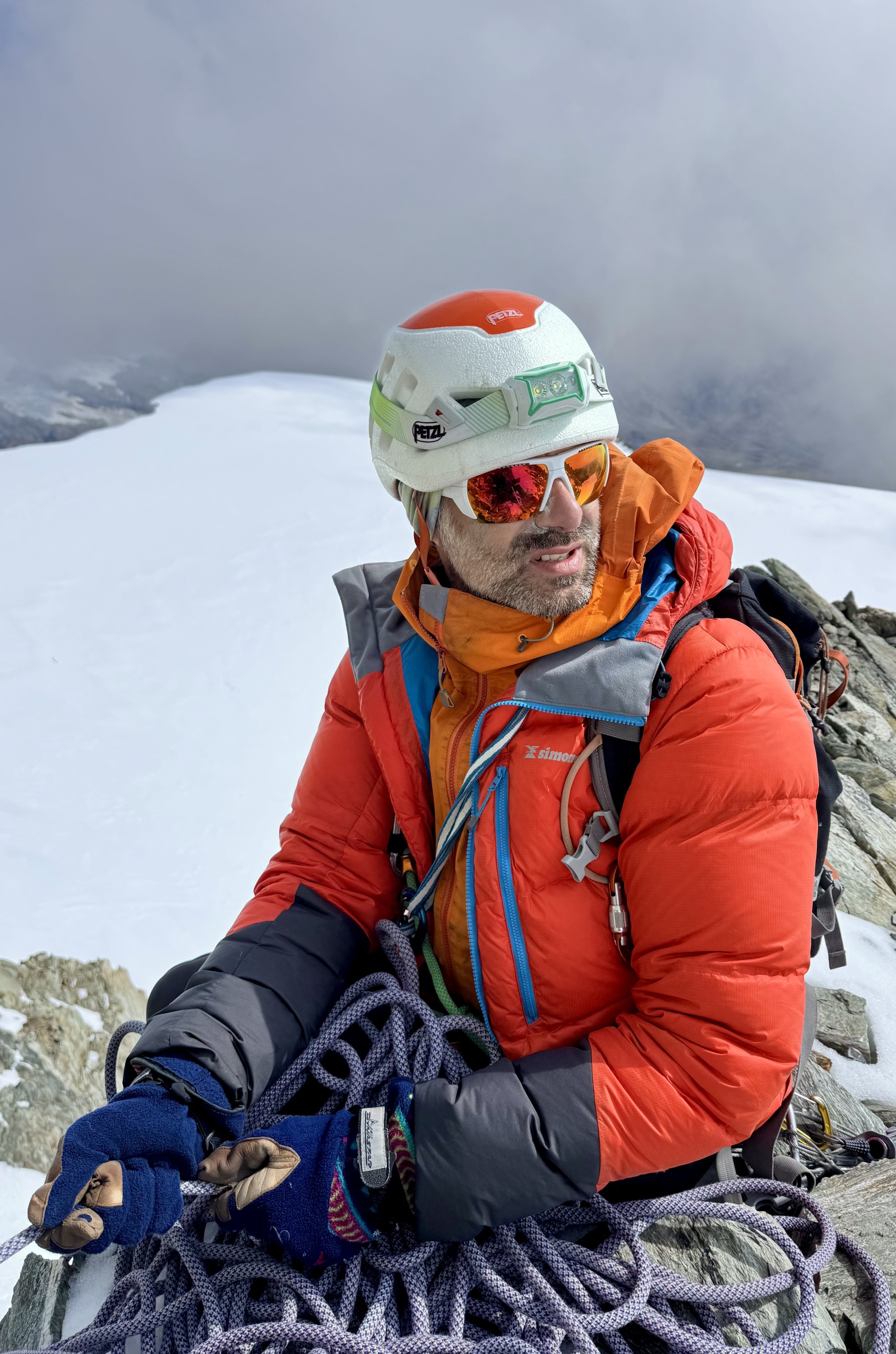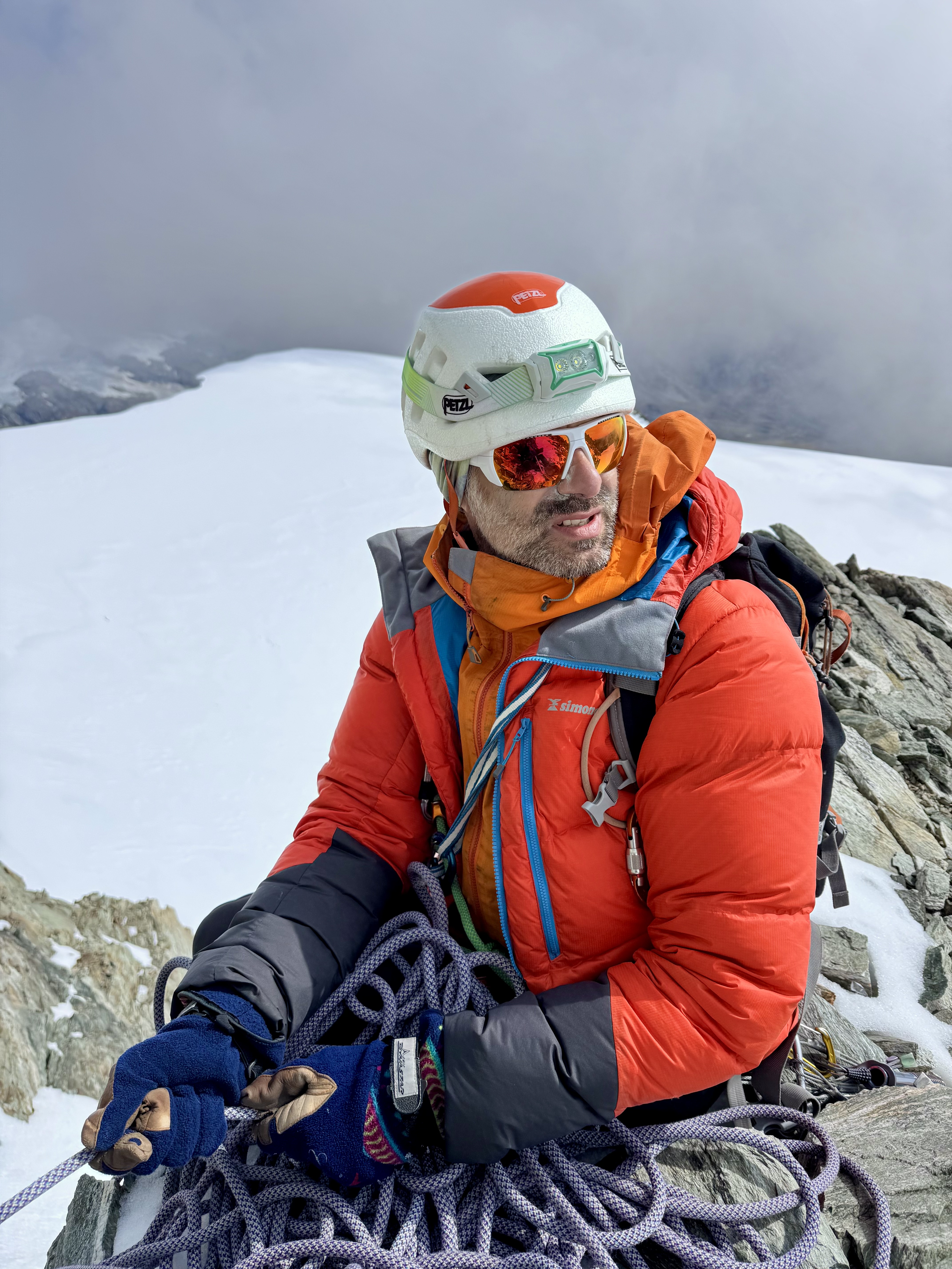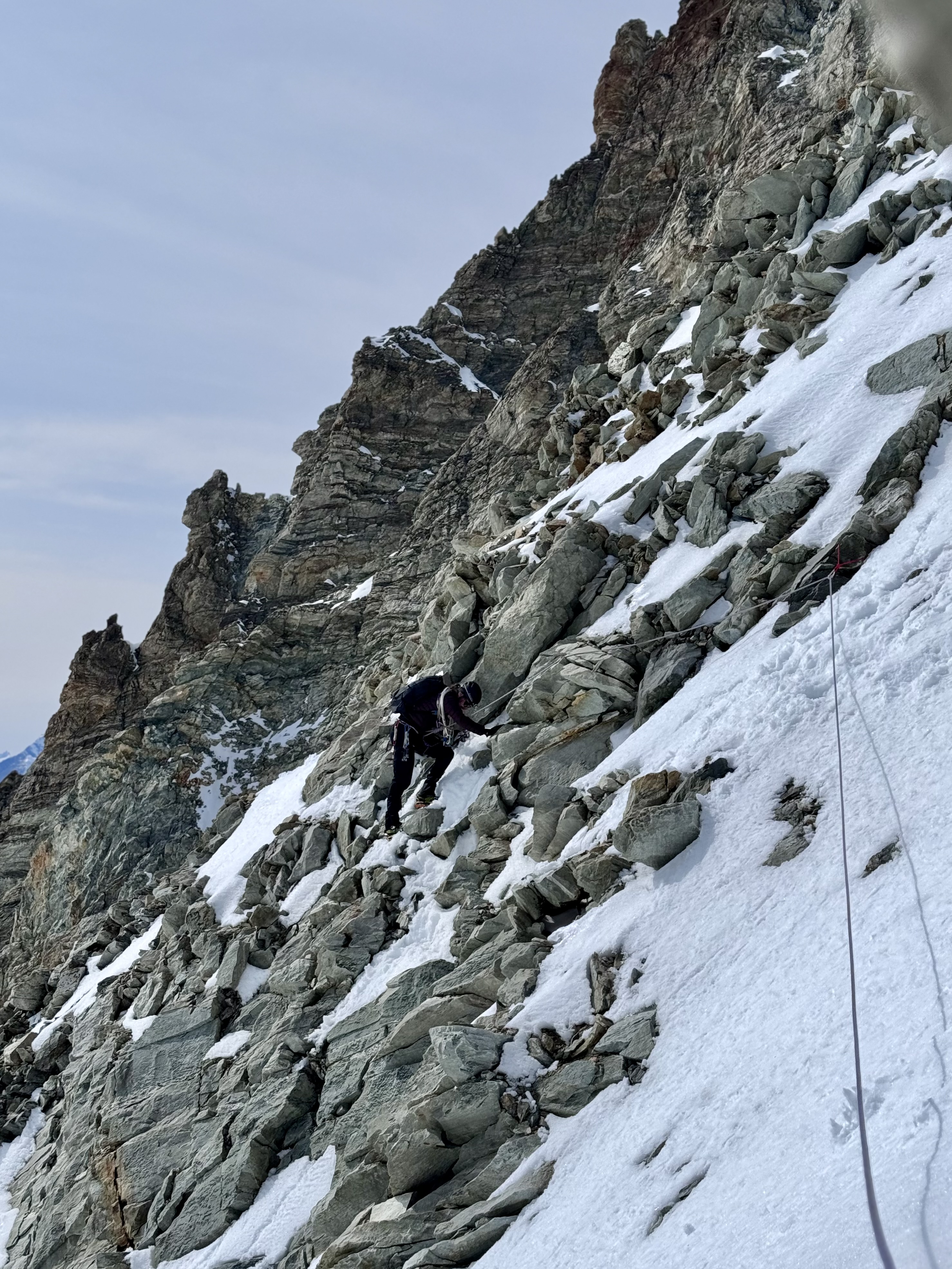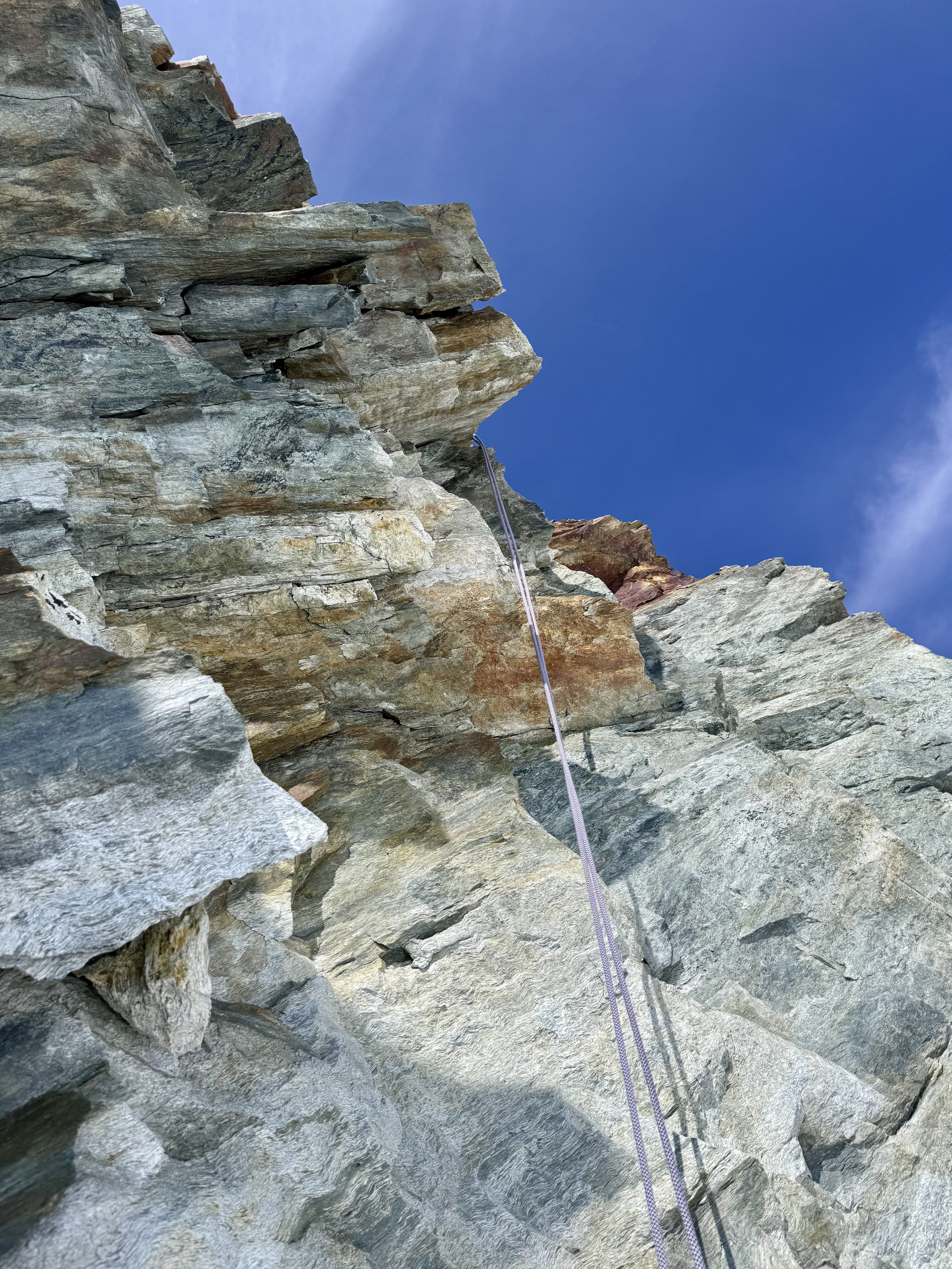 11h39. Nous sommes au sommet du gendarme crochu de l’arête est (4 075 m). Devant nous, à l’ouest, la Corne d’Hérens (4 148 m) s’élance contre le ciel, strate après strate. Ce n’est pas une corne, mais une carnassière de gneiss prête à déchirer quiconque s’y hasarde. Au nord, la Dent Blanche. À l’est, l’arête du Lion du Cervin, noyée dans le brouillard. Je sors de ma rêverie minérale. Nos regards sondent des voies possibles — et impossibles. Mais Julien n’est pas bien, il est au bout. À seulement 98 m du sommet, un seul choix s’impose : battre en retraite. « On est clairement trop lents, on redescend. »