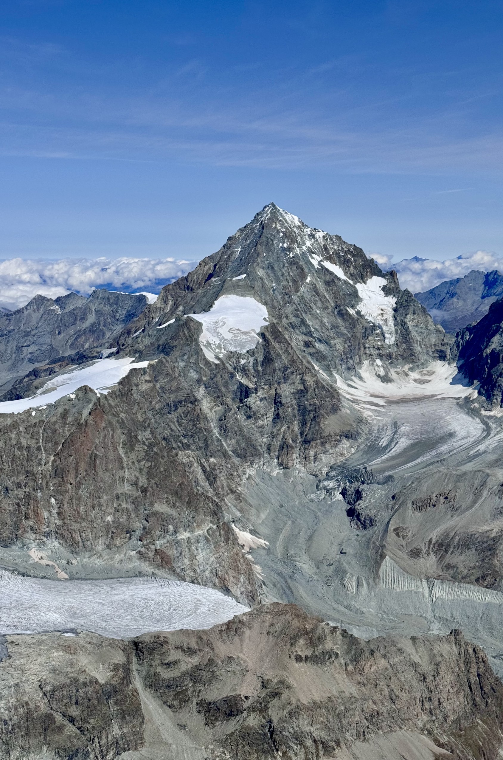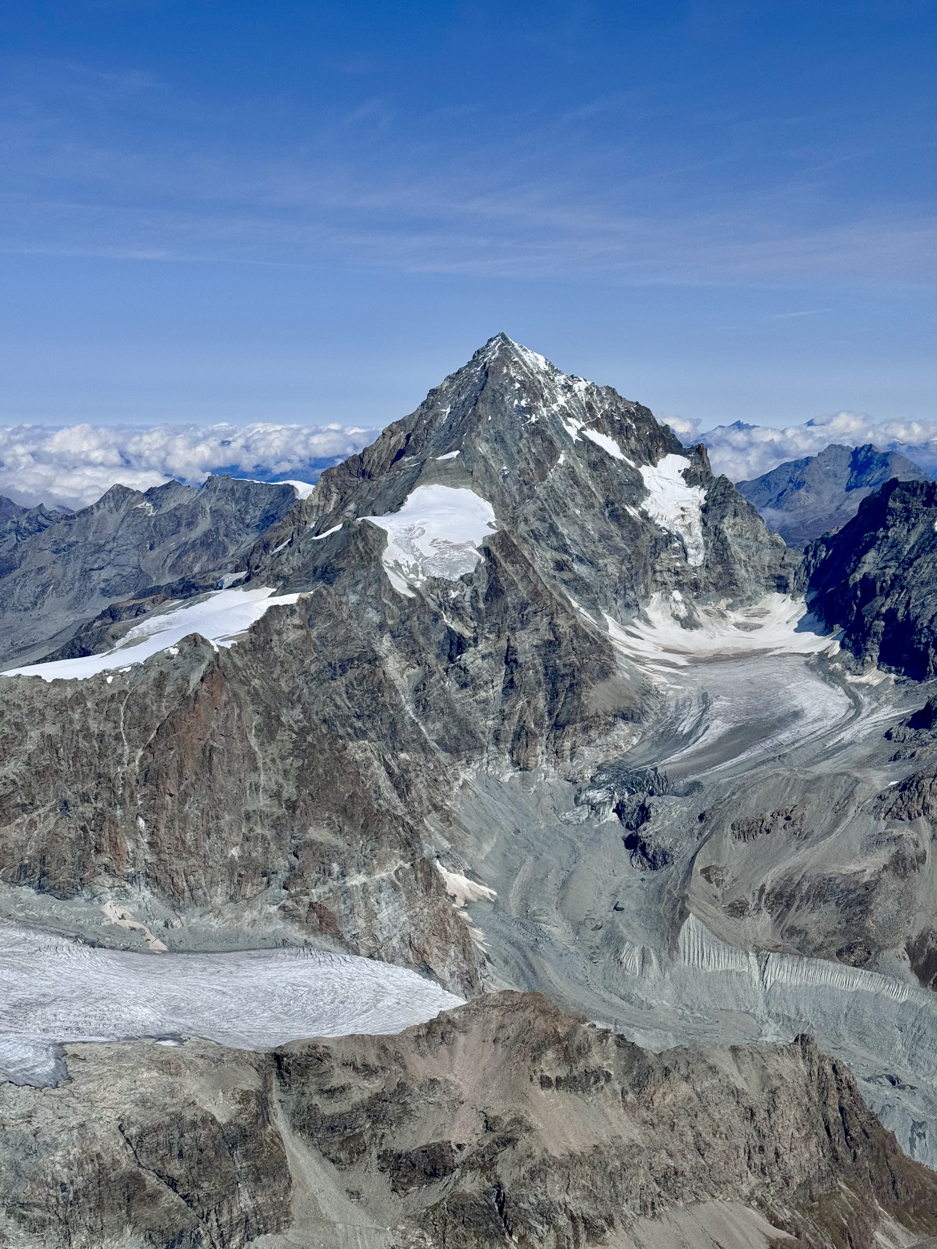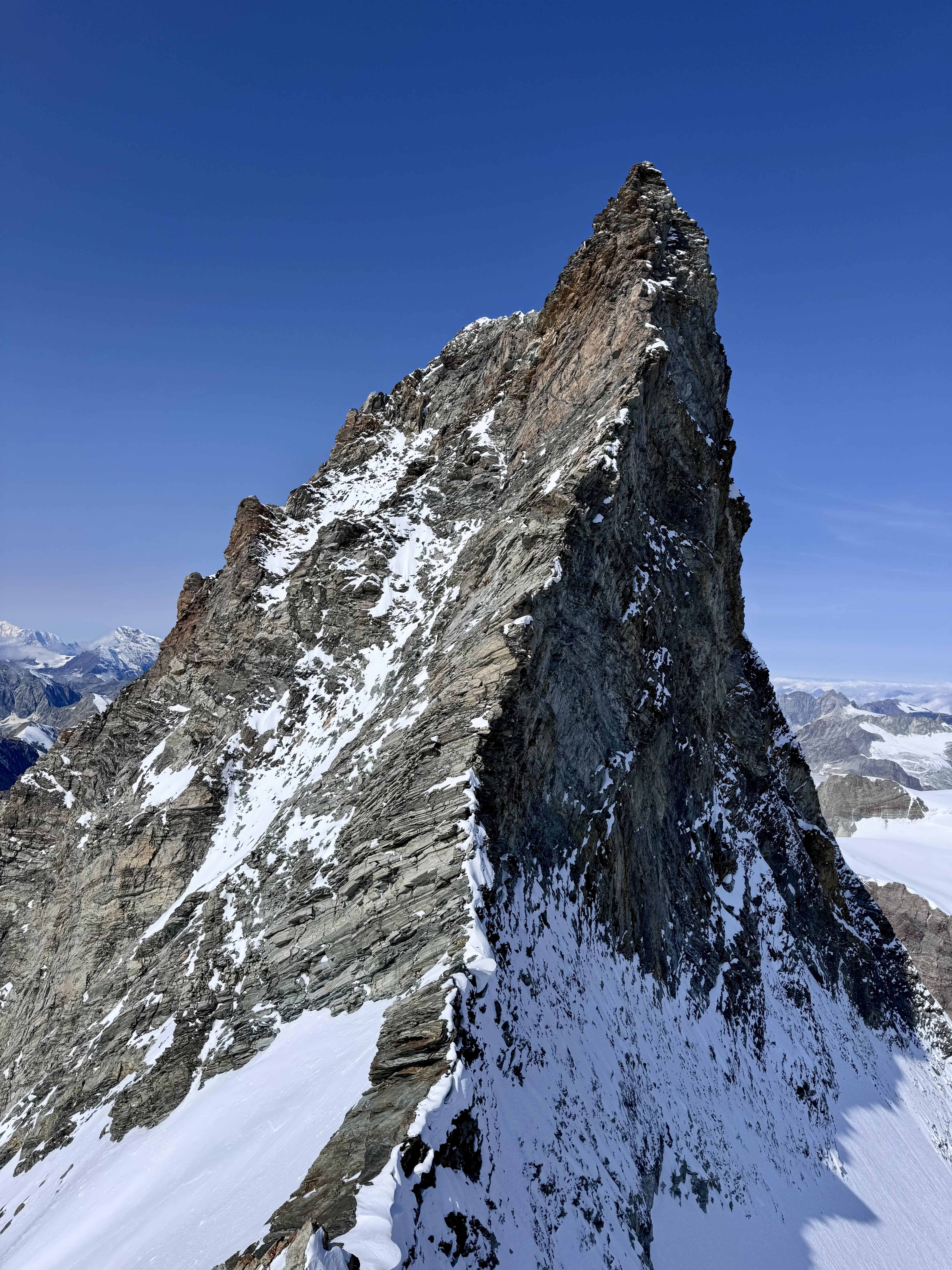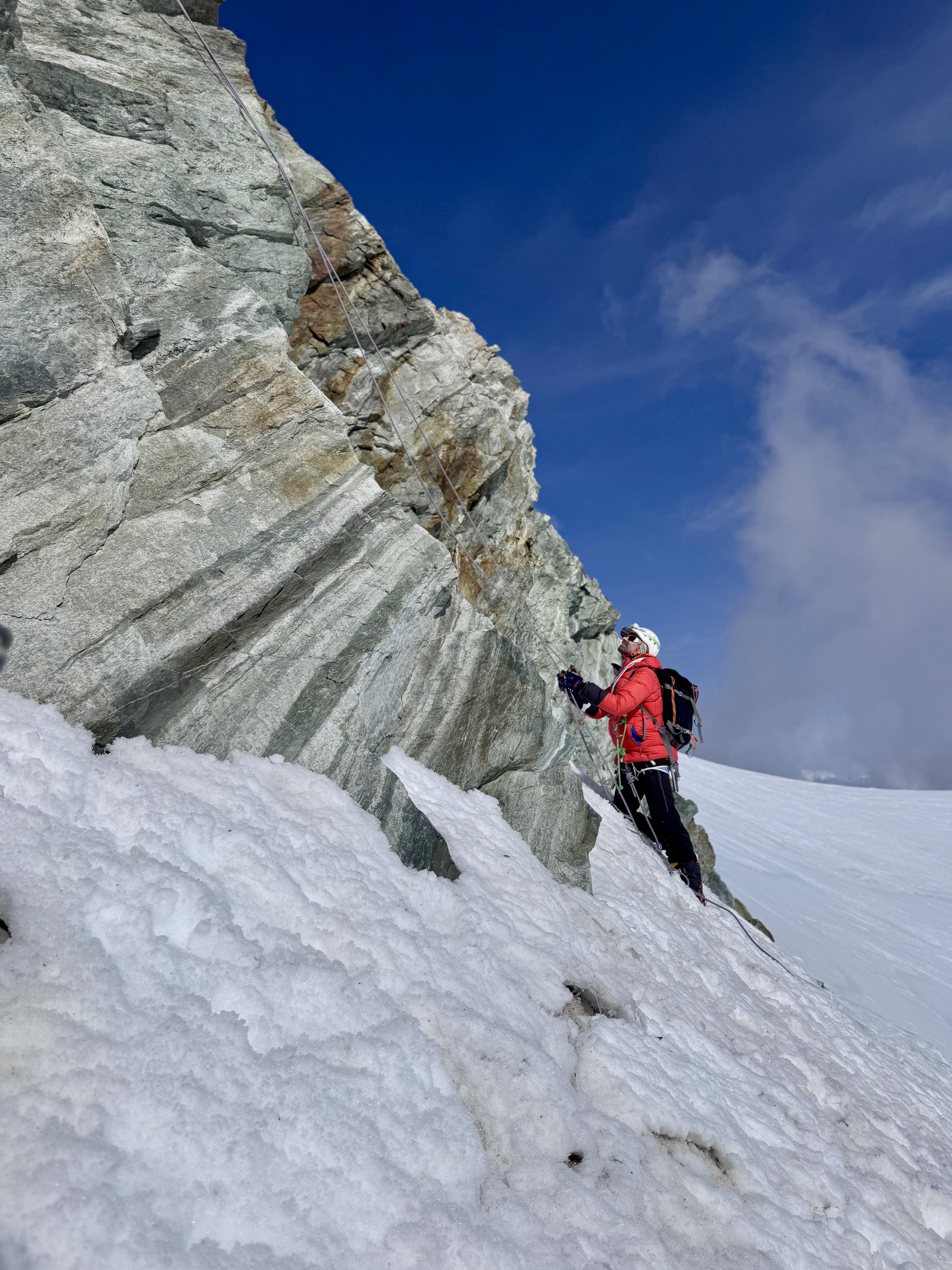 11h39. Nous sommes au sommet du gendarme crochu de l’arête est (4 075 m). Devant nous, à l’ouest, la Corne d’Hérens (4 148 m) s’élance contre le ciel, strate après strate. Ce n’est pas une corne, mais une carnassière de gneiss prête à déchirer quiconque s’y hasarde. Au nord, la Dent Blanche. À l’est, l’arête du Lion du Cervin, noyée dans le brouillard. Je sors de ma rêverie minérale. Nos regards sondent des voies possibles — et impossibles. Mais Julien n’est pas bien, il est au bout. À seulement 98 m du sommet, un seul choix s’impose : battre en retraite. « On est clairement trop lents, on redescend. »
