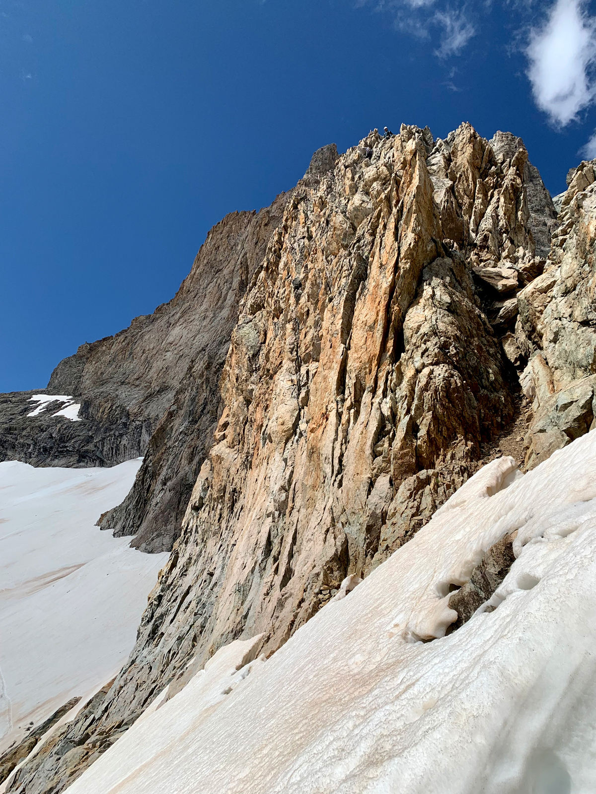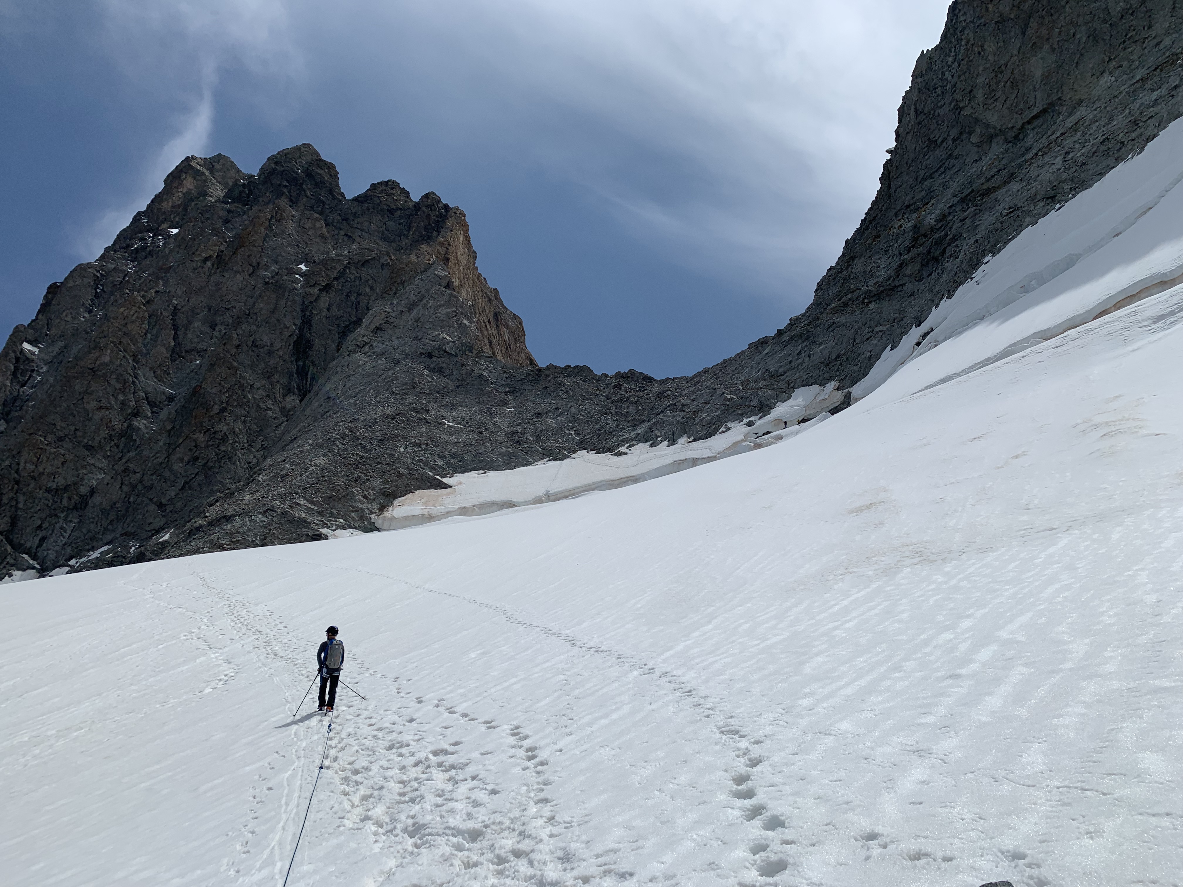 Prochaine épreuve : le Mur Castelnau, la plus dure partie de l’ascension, selon les avertissements de Mathieu. Cette immense dalle verticale sera l’occasion de me servir de toutes les ruses apprises à Fontainebleau, sans droit à l’erreur. Un pas après l’autre, c’est moins dur que ça a l’air. Au fil de l’ascension, d’autres personnages mythiques nous donnent des gages : l’Âne nous fait passer sur son Dos, les Autrichiens nous accordent la faveur de traverser leur Dalle. Le Chat fait un Pas vers nous et nous avise à préparer les crampons pour la rencontre avec le Glacier Carré. Suspendu aux parois de granite à 45º, ce glacier chenu et rabougri nous emmène gentiment jusqu’à la base du Grand Pic. Il nous reste encore 333 m précis de dénivelé jusqu’en haut. Rien du tout. Je me vois déjà au sommet.