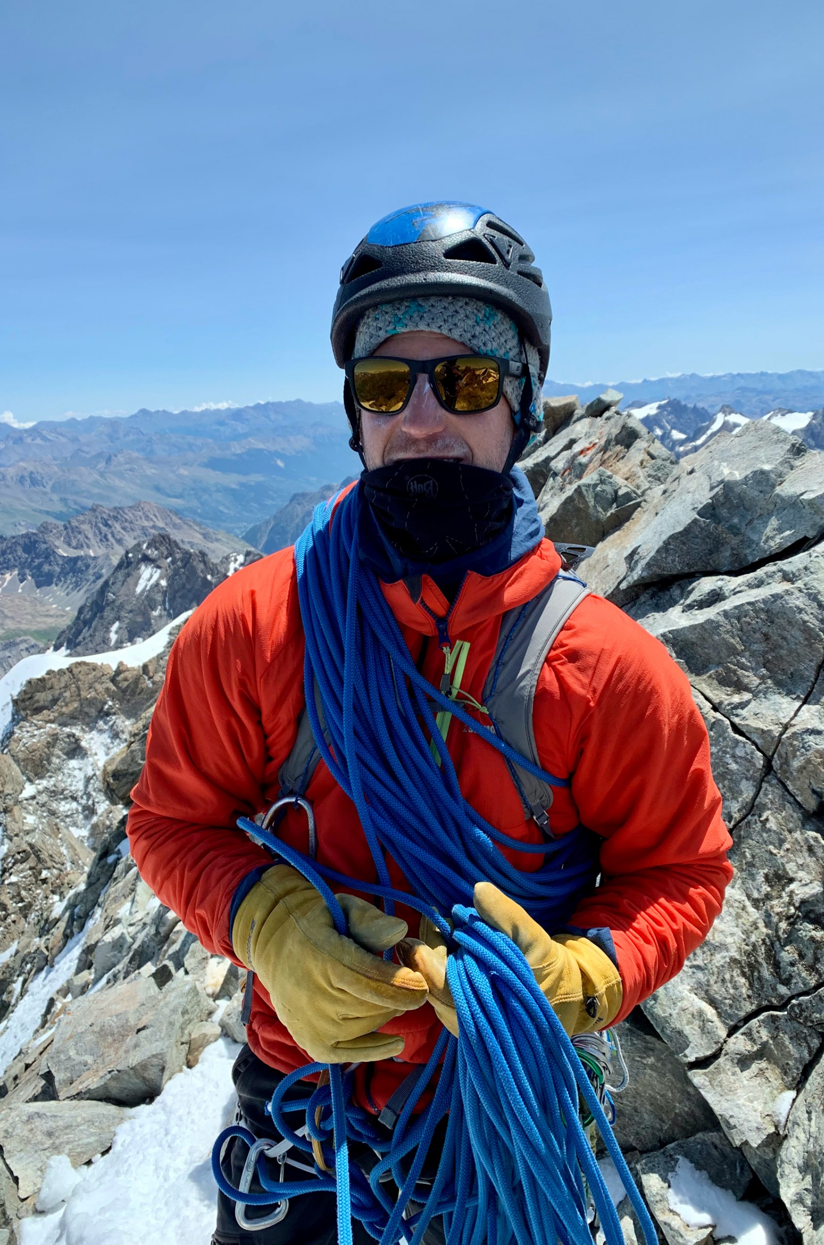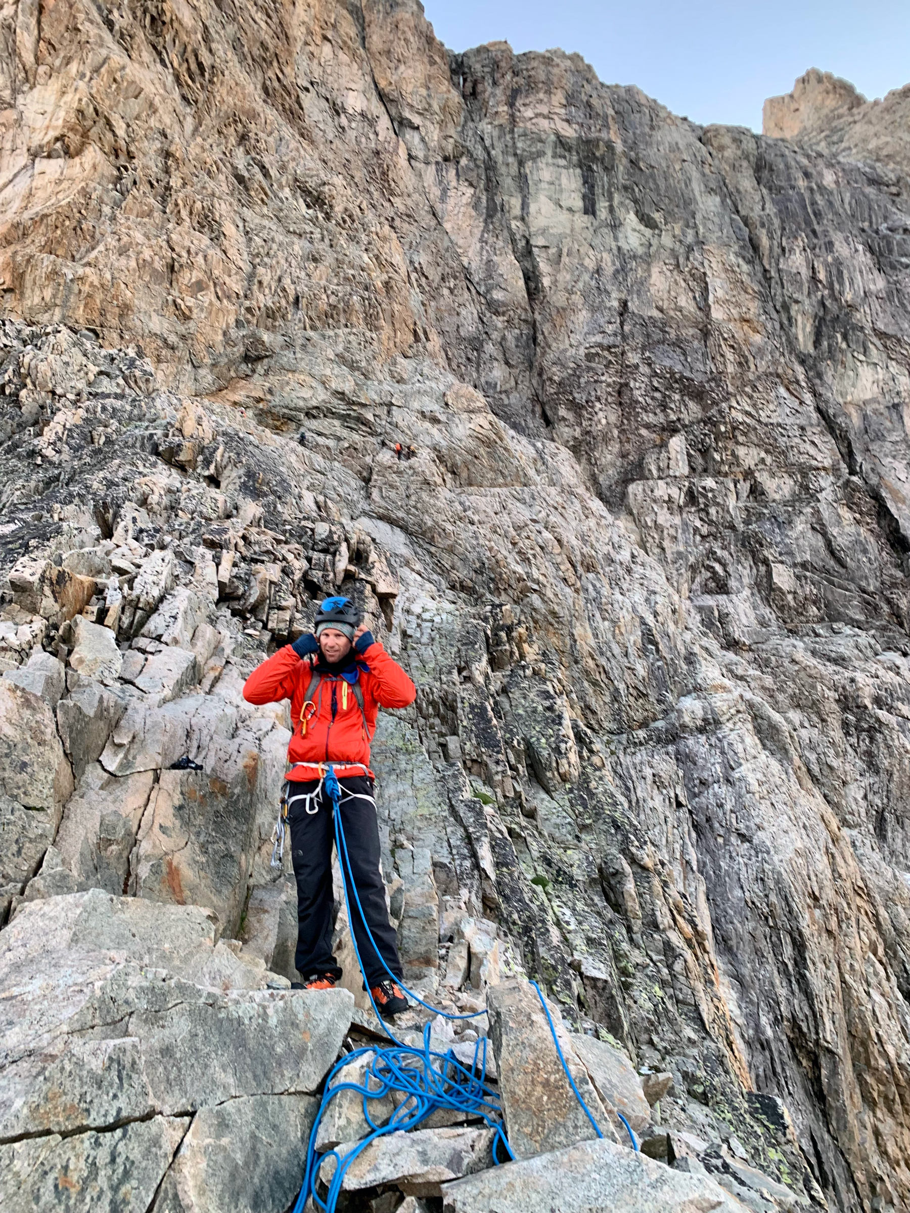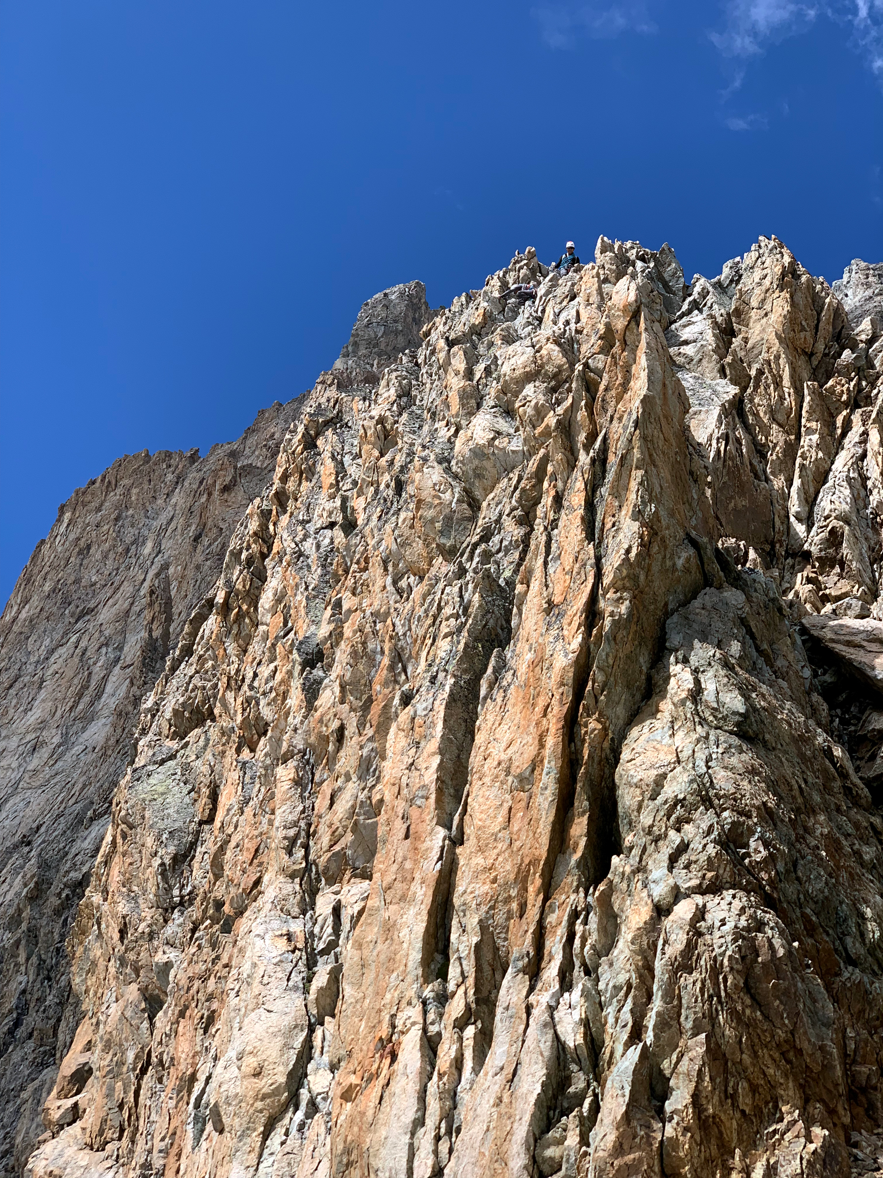 Eau, nourriture et selfies, la routine du sommet. Joie modérée, car je vois mieux ce que Mathieu veut dire par « au sommet, c’est loin d’être fini ». Trois rappels sont nécessaires pour descendre du Grand Pic sur la Brèche Zsigmondy. Lentement, très lentement, je me laisse glisser sur ce brin de corde qui me livre au vide. En plein jour, le vide est omnipotent. Si seulement il pouvait faire encore nuit, juste le temps des rappels !