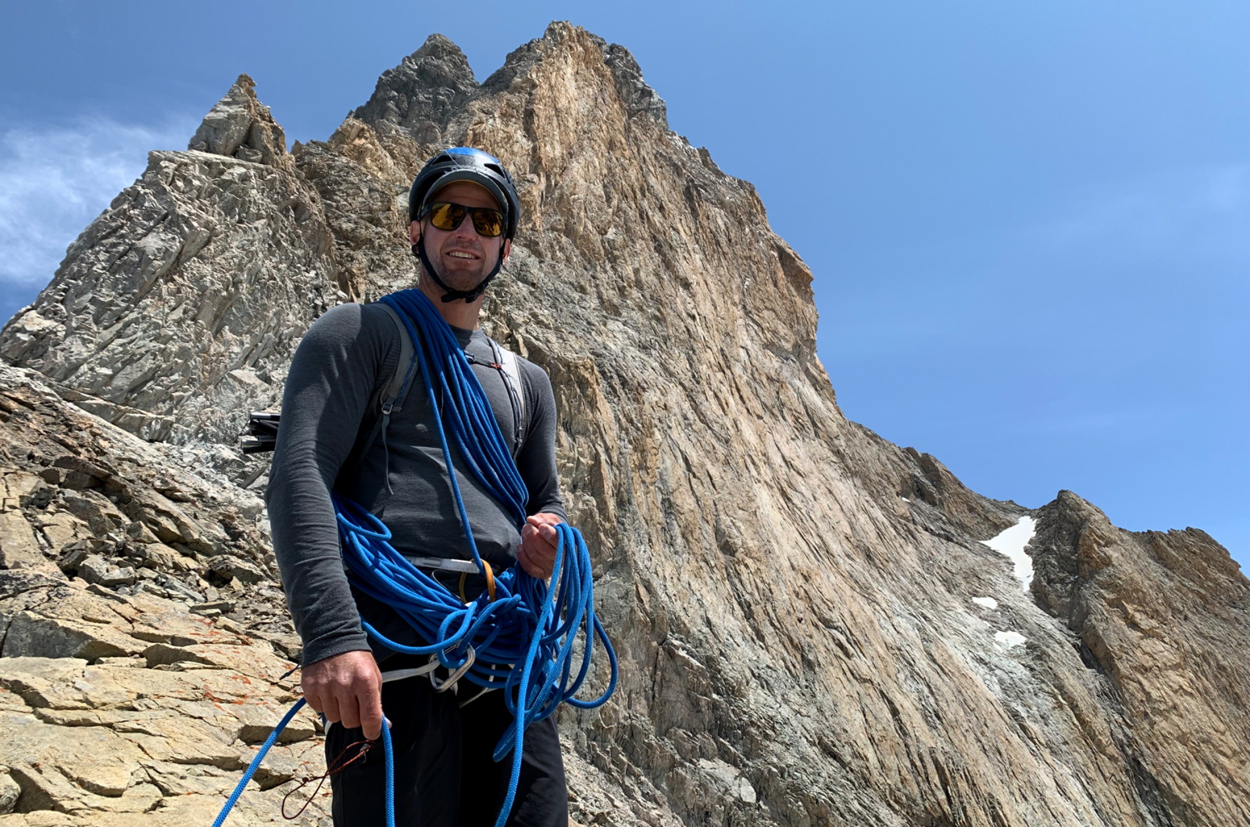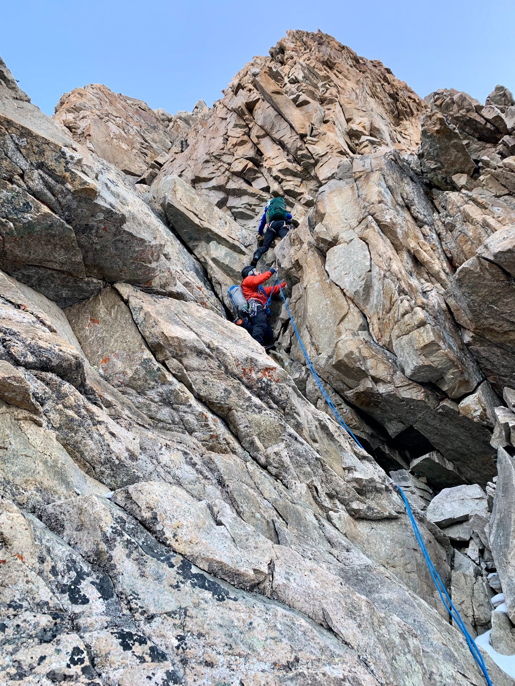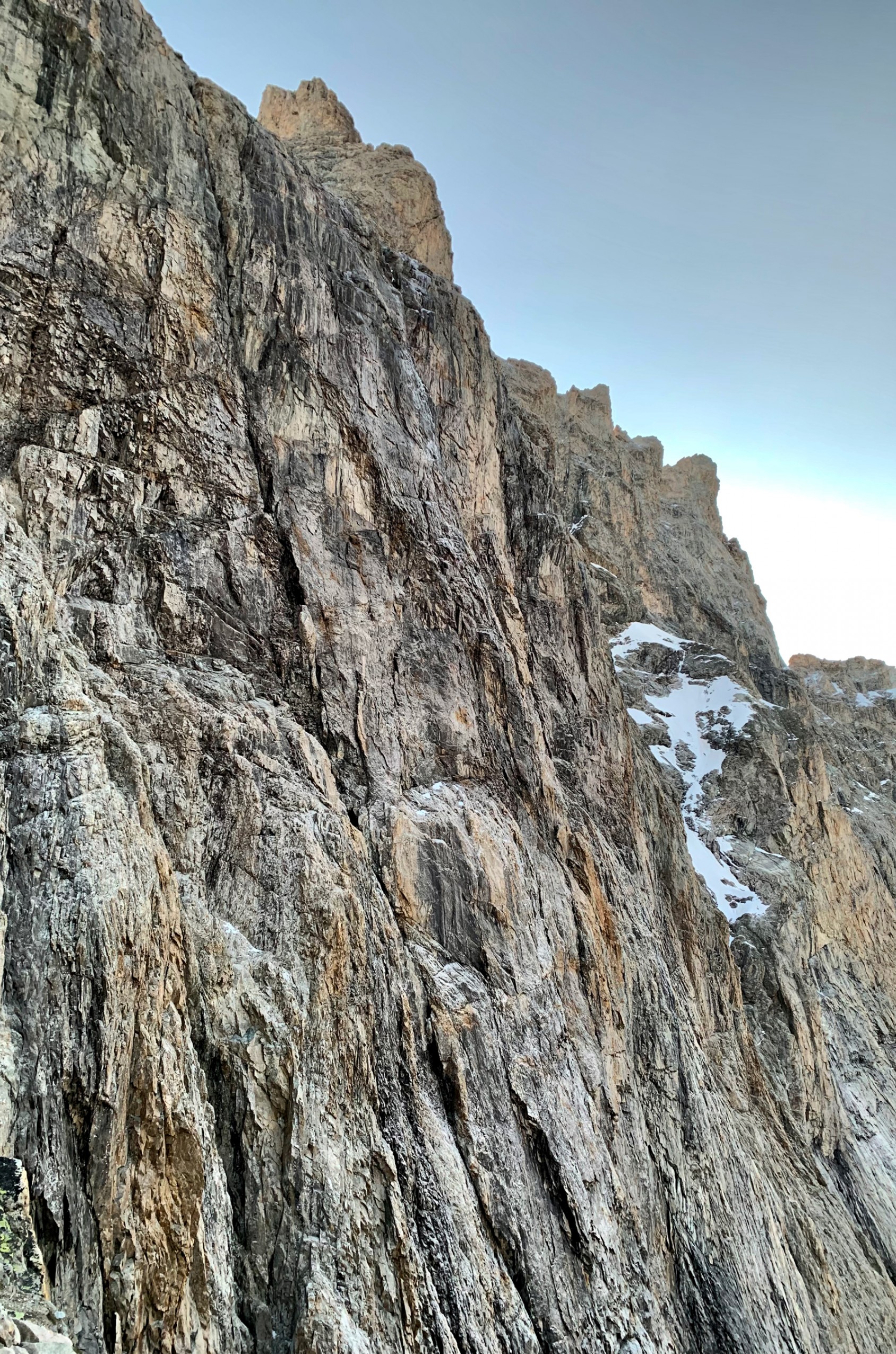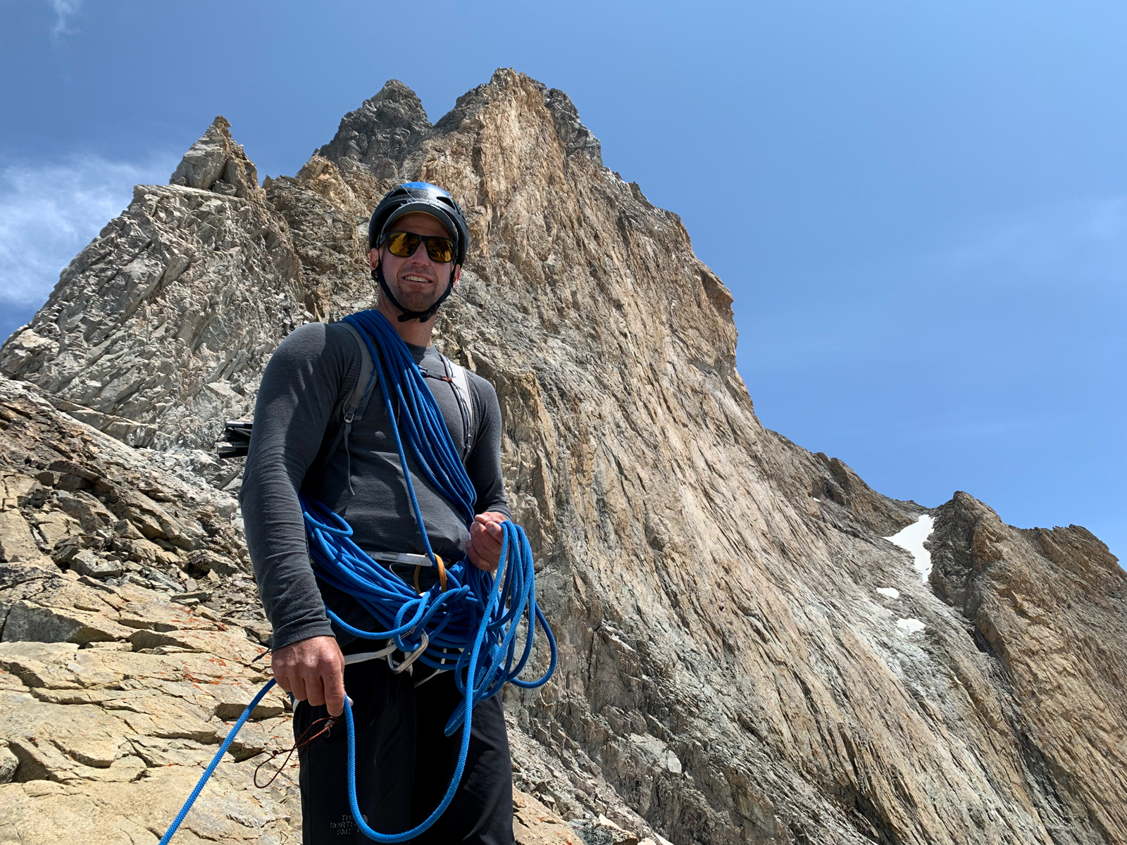 Eau, nourriture et selfies, la routine du sommet. Joie modérée, car je vois mieux ce que Mathieu veut dire par « au sommet, c’est loin d’être fini ». Trois rappels sont nécessaires pour descendre du Grand Pic sur la Brèche Zsigmondy. Lentement, très lentement, je me laisse glisser sur ce brin de corde qui me livre au vide. En plein jour, le vide est omnipotent. Si seulement il pouvait faire encore nuit, juste le temps des rappels !