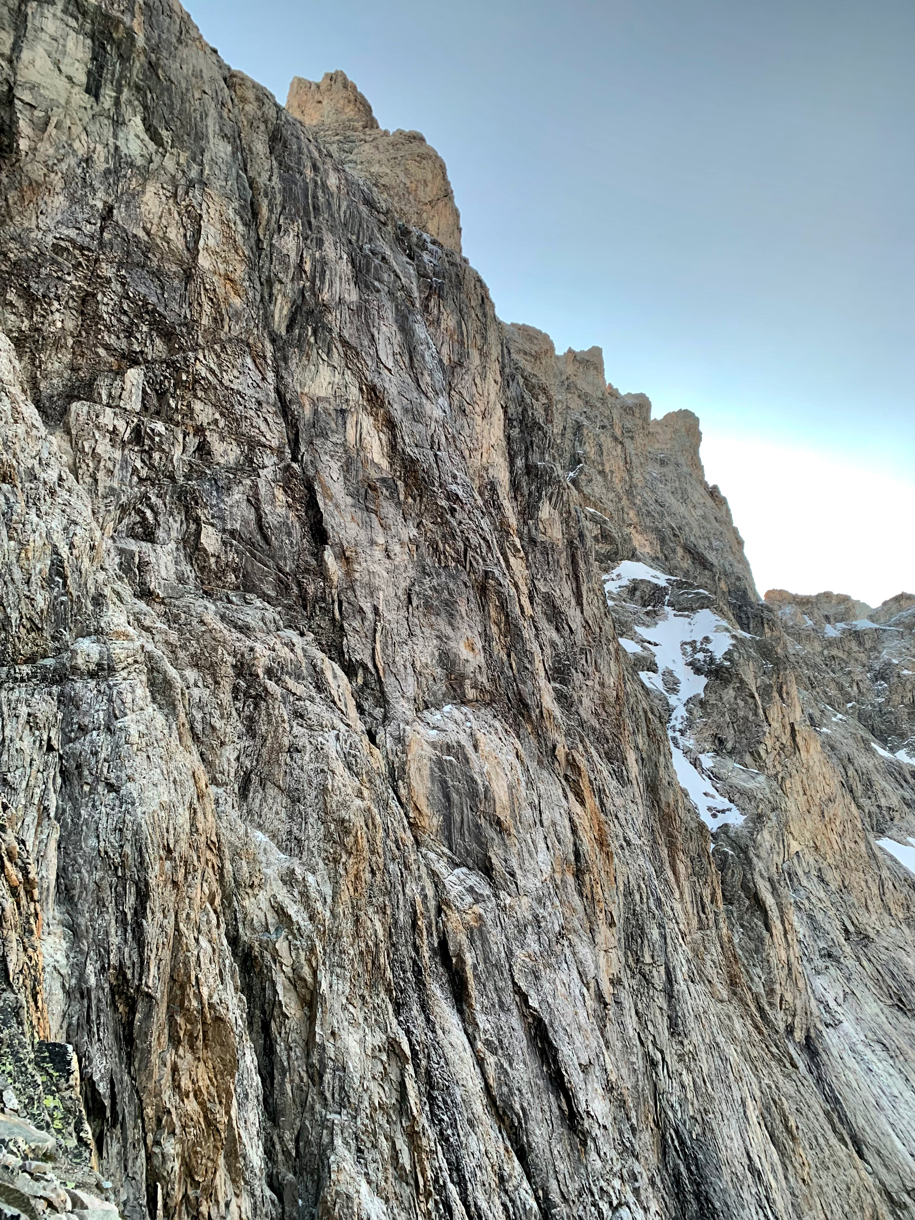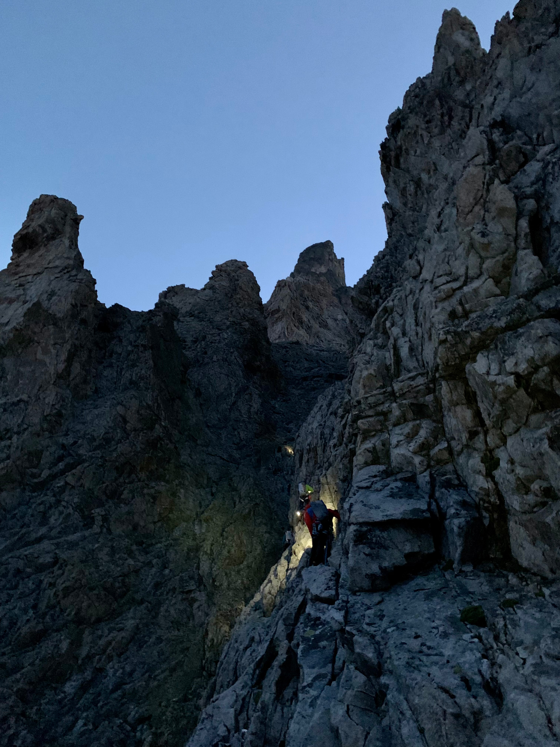 4h50. Dans le noir, le vide ne me fait pas peur. La nuit estompe la conscience de l’abîme. Dans le noir, j’oublie aussi le creux qui ronge mon estomac après un petit déjeuner sucré et frugal. Heureusement, l’escalade commence juste derrière le refuge, on n’a pas le temps de rêvasser à des oeufs brouillés à la truffe ou des saucissons imaginaires.