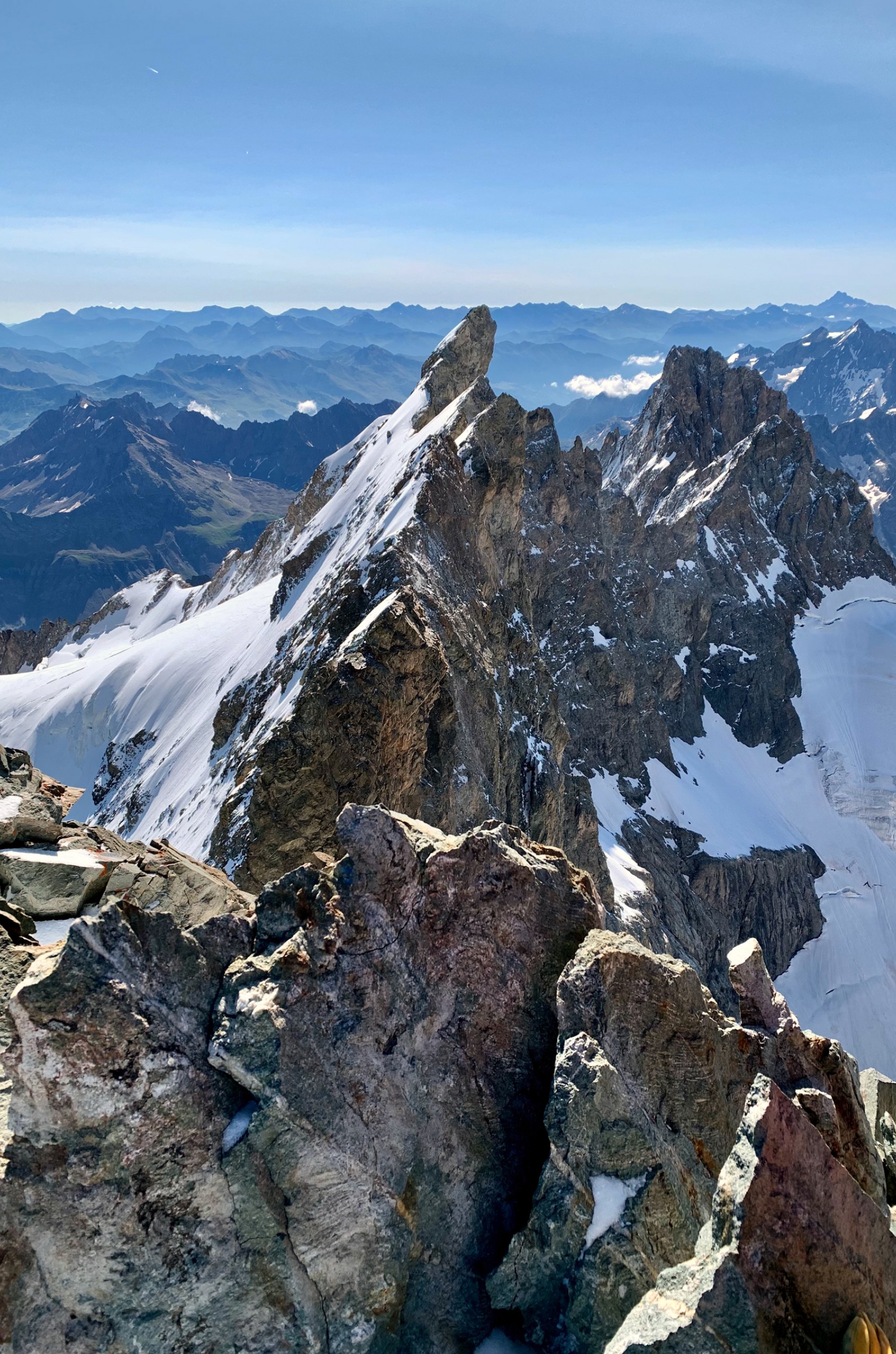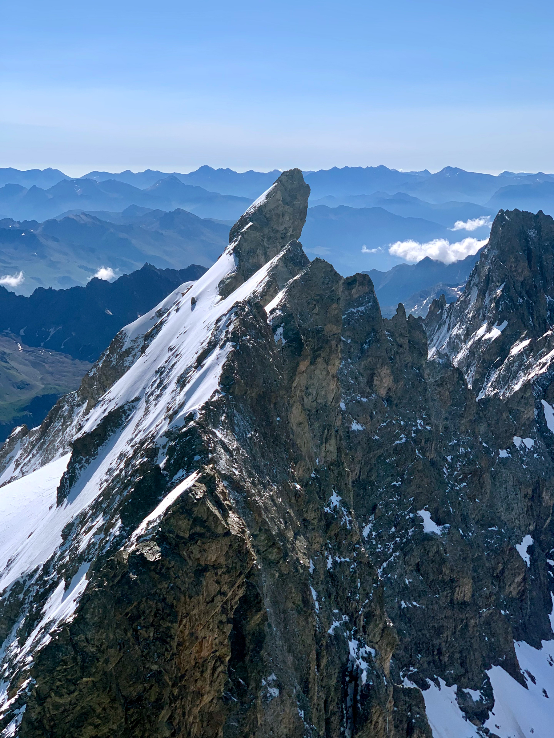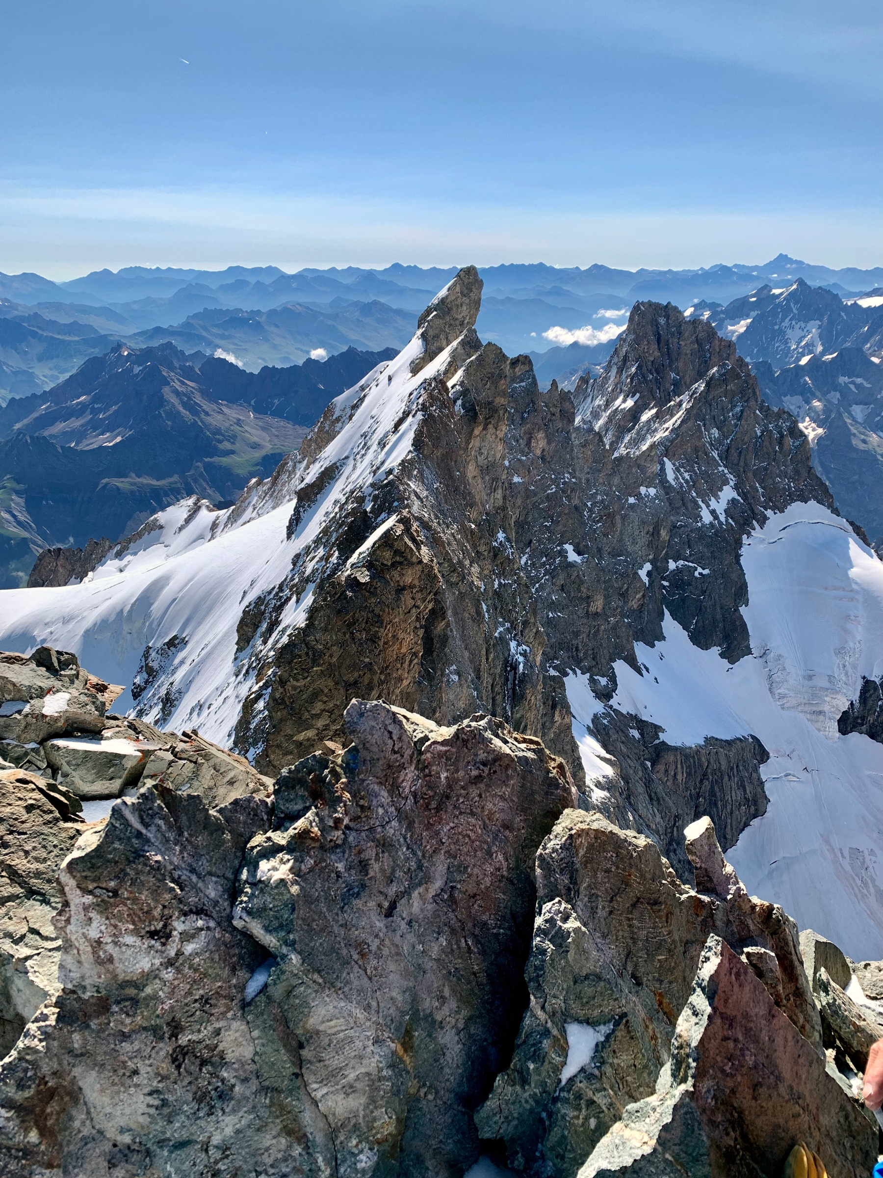 Mathieu me descend en moulinette dans une autre brèche, celle qui précède le Doigt de Dieu. Appelé aussi le Pic Central de la Meije, ce sommet sera les derniers mètres de dénivelé positif de notre traversée — je pourrais presque m’en passer, mais il n’y a pas de voie alternative. Ici, à 3973 m, nouveau dilemme mystique : pourquoi l’appelle-t-on Doigt de Dieu, mise à part sa forme de relique surhumaine ? Son orientation de bas en haut et non de haut en bas est une vraie énigme. Cela veut dire que soit (1) il n’appartient pas à Dieu, céleste par nature, soit (2) Dieu même siège dans cette montagne, de façon animiste. Après 8h d’effort et un certain manque d’oxygène, je conclus que ce doigt doit appartenir à une déesse chthonienne, maîtresse du granite et du gneiss, en colère contre le cosmos pour ses foudres et inconstances. Appelons le « le Doigt de la Déesse », ça me paraît plus plausible.