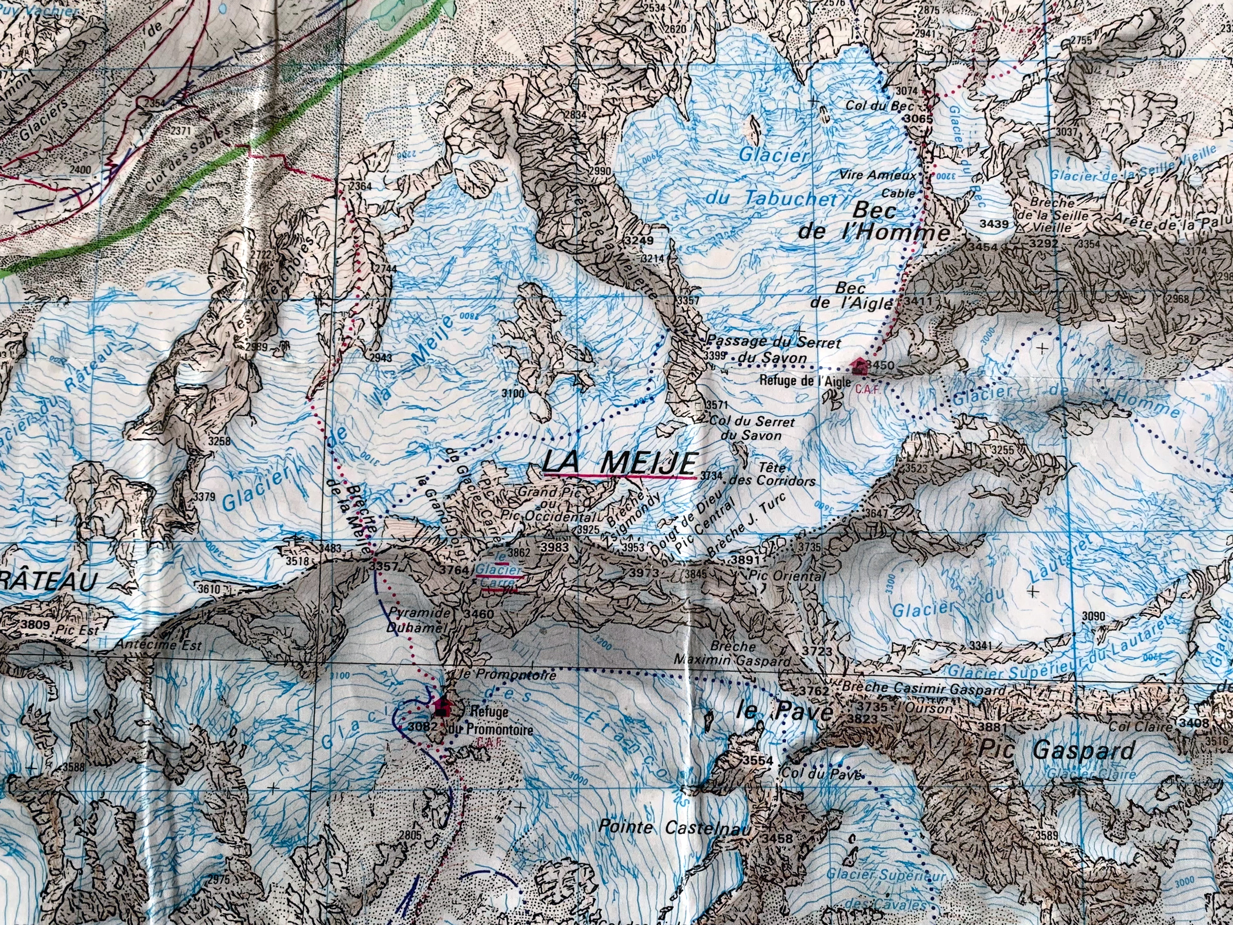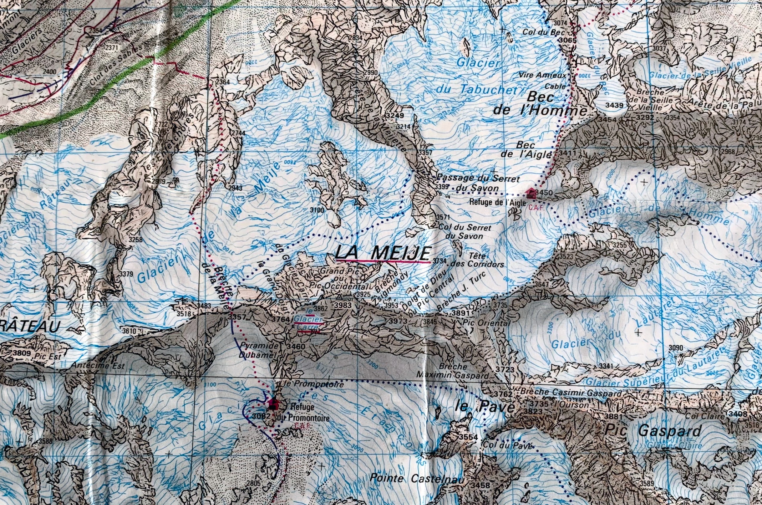- Route : De la Grave (1500 m) au Refuge du Promontoire (3092 m) via le Col de la Meije (3357 m)
