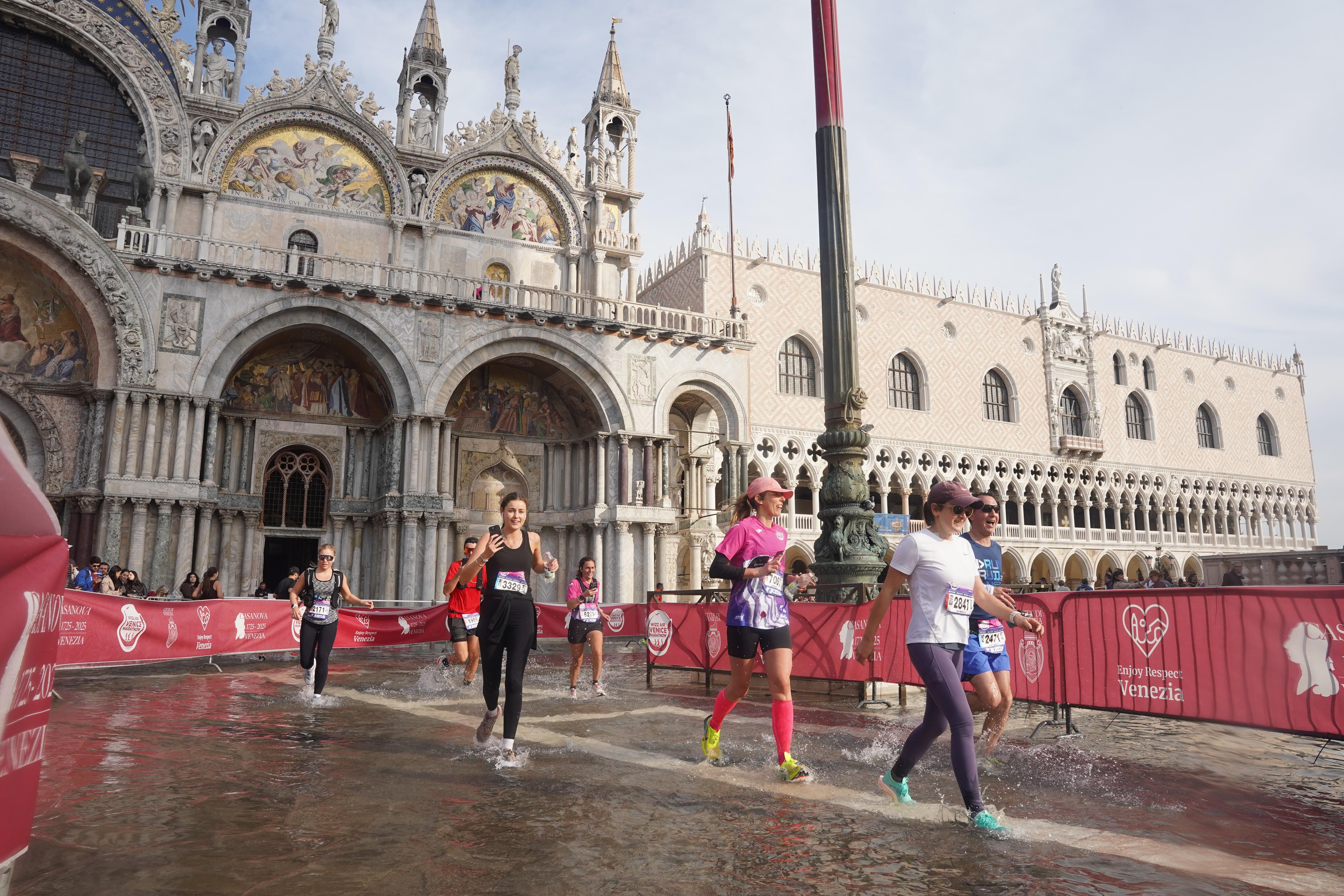 Km 39 : l’illusion d’avancer. Le parvis de San Marco est inondé, on fait semblant de courir, on nage. Mes chaussures ultra-light sont un tamis, mais l’eau froide apaise la cheville en surchauffe. Sous l’eau, je zappe le panneau du km 40.