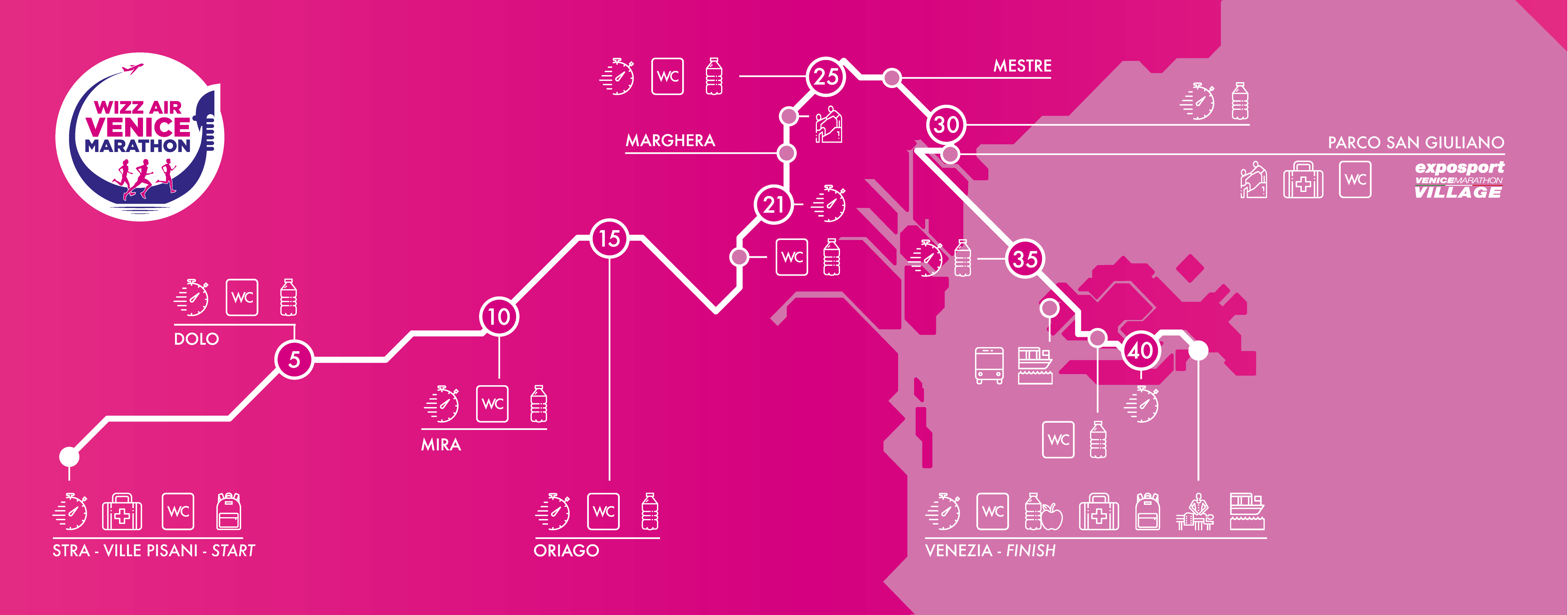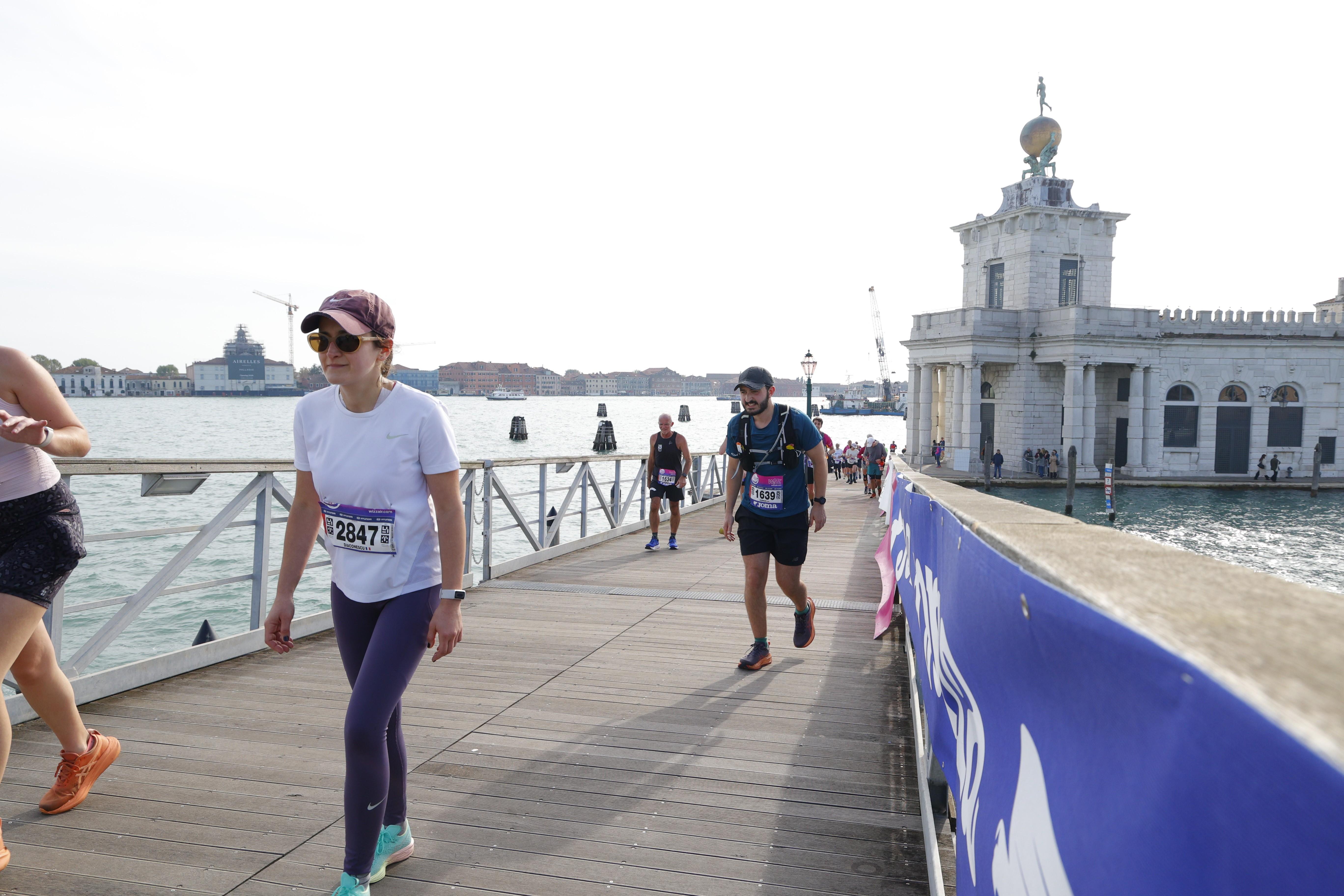 Km 35, Ponte della Libertà. Quatre kilomètres en ligne droite qui relient Venise à la terra ferma : un pont ferroviaire, inauguré en 1846, et un ruban de béton, inauguré par Mussolini en 1933 sous le nom de « Ponte Littorio ». J’ai l’impression de courir au ralenti. La deuxième vague des ballons bleus me double : je viens de sortir de l’intervalle de 6:15/km. Ce n'est pas le pont de la liberté, c'est une interminable highway to hell. À l’horizon, Venise scintille comme une Fata Morgana.