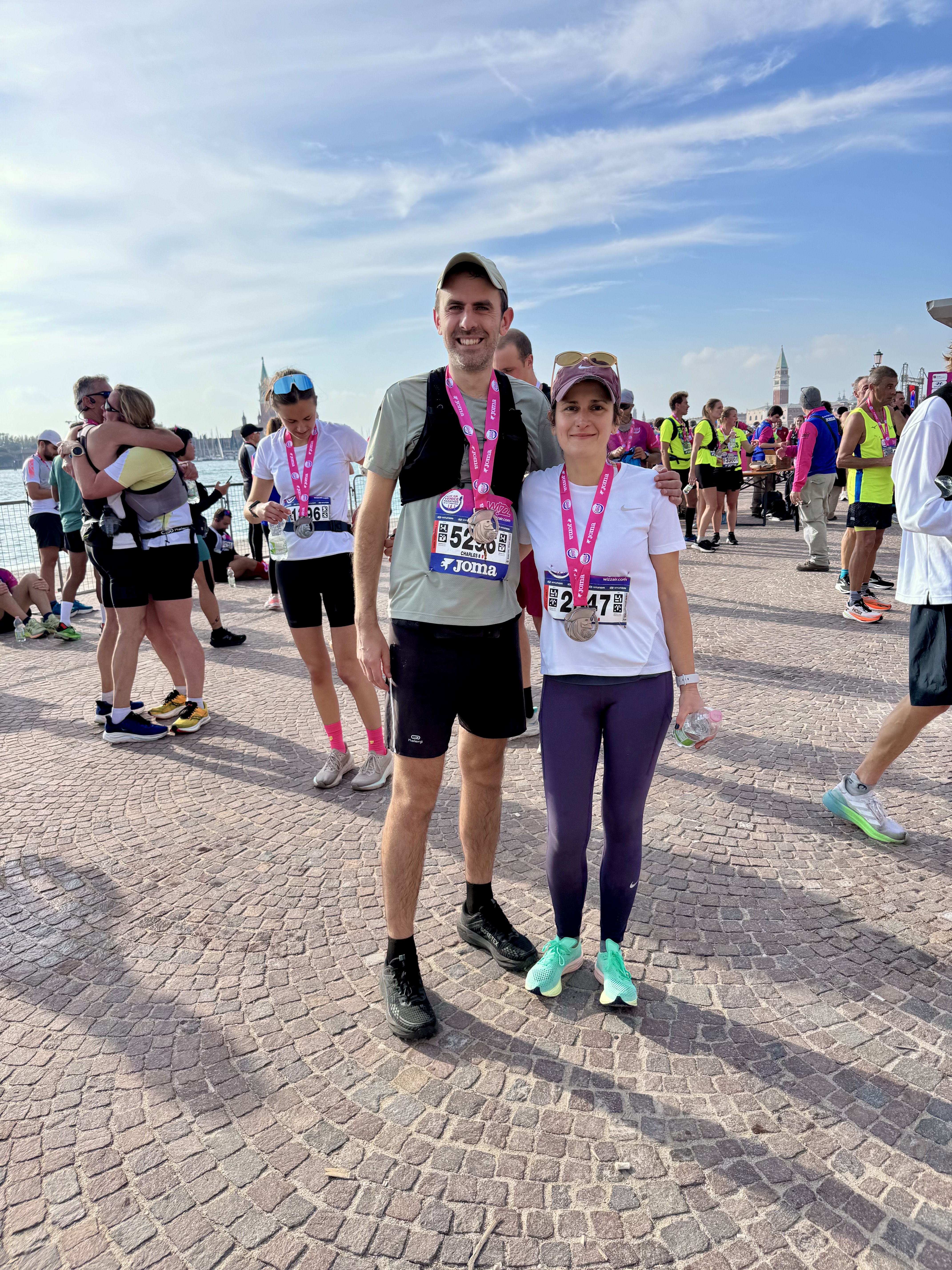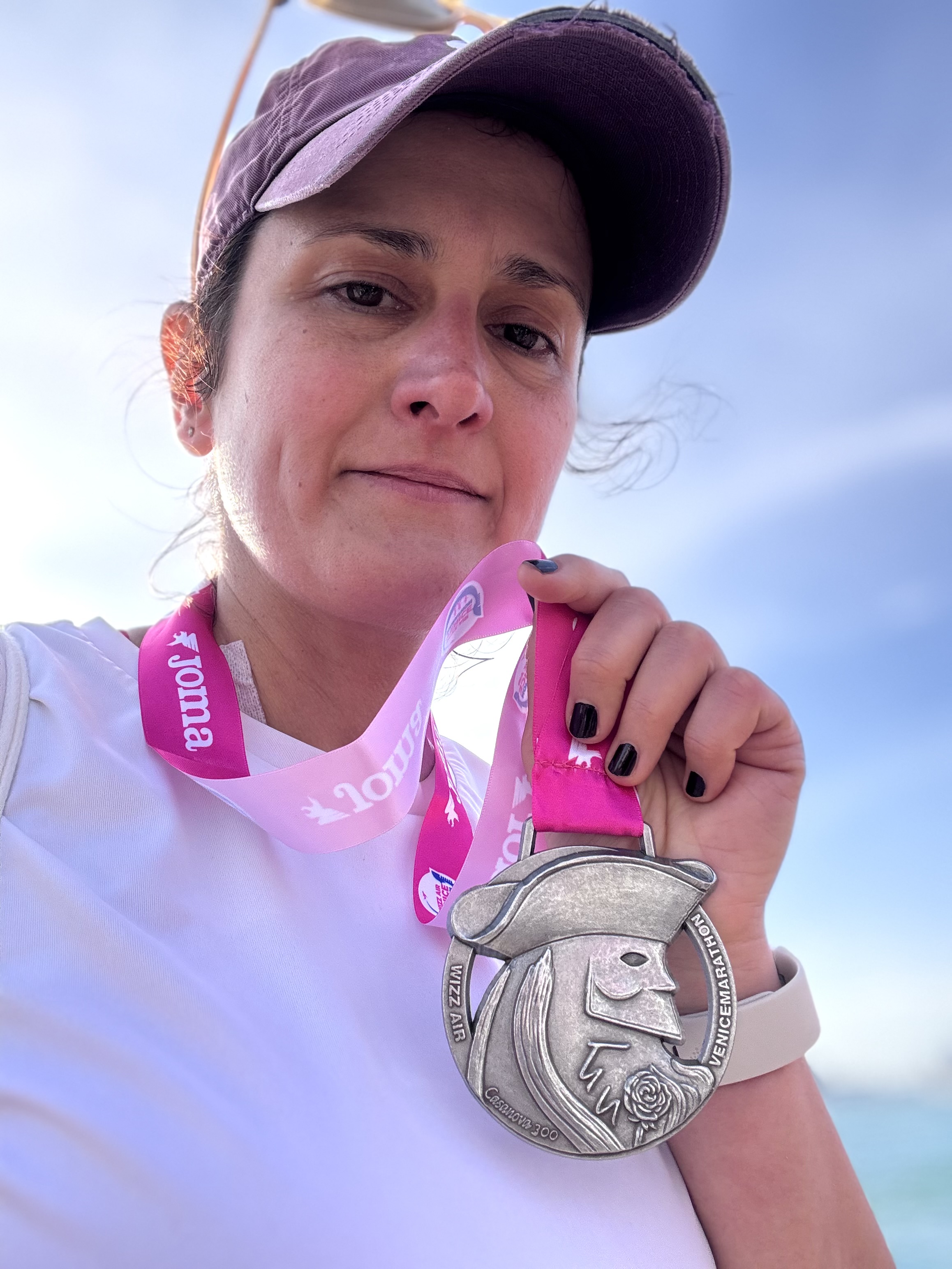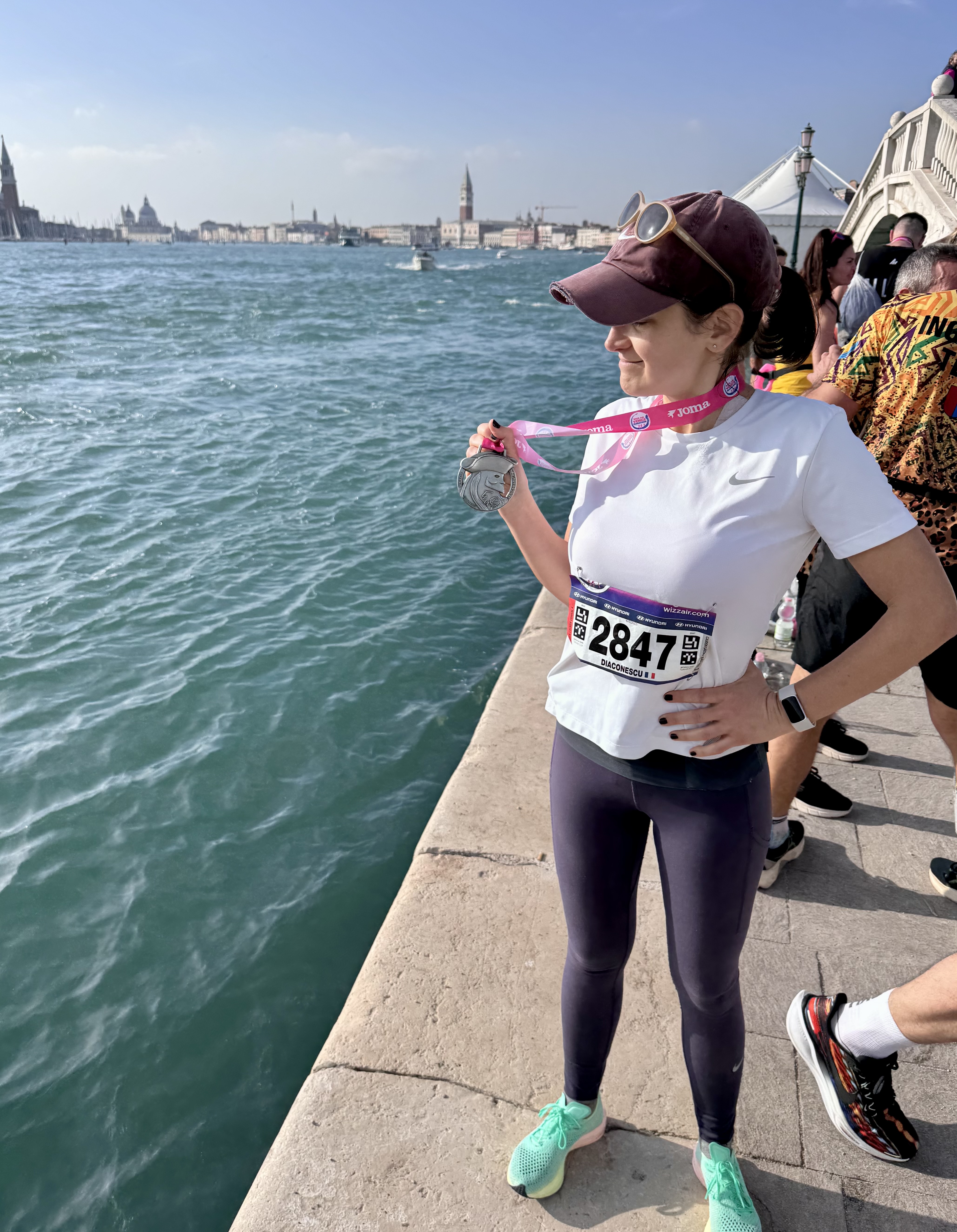 Km 10, Mira. Les cohortes se raréfient petit à petit. On longe le canal de la Brenta, avec ses villas palladiennes, des fanfares, des enfants qui tendent les mains pour faire des checks. Les « Forza ! Bravo ! Sempre duri ! » surgissent de partout. Les groupes de musique font vibrer l’asphalte. Des sourires, des décibels et des foulées déphasées de cette légion de coureurs. Portée par l’euphorie collective, j’ai l’impression d’être légère. Je ne cours pas. Je flotte sur une vague qui glisse tout seule vers la lagune.