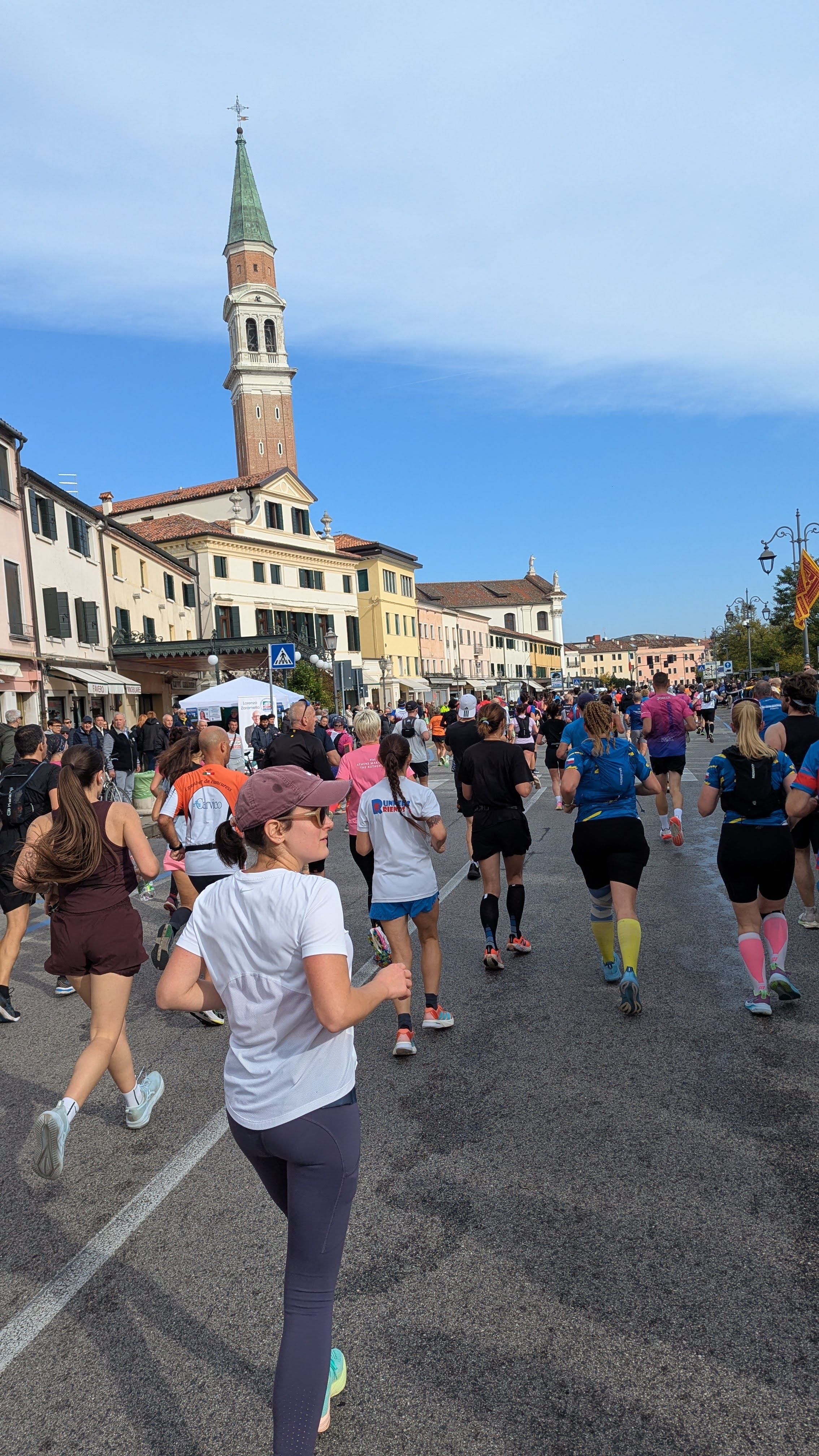 Km 5, Dolo. Tout va bien. Premier ravito, un peu d’eau, on déroule, malgré la densité de coureurs, qui fusent chaotiquement de partout. Je suis ravie de mes chaussures ultra-légères, je ne les sens même pas !